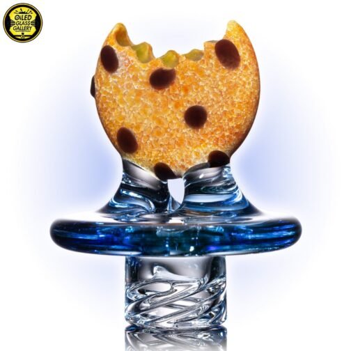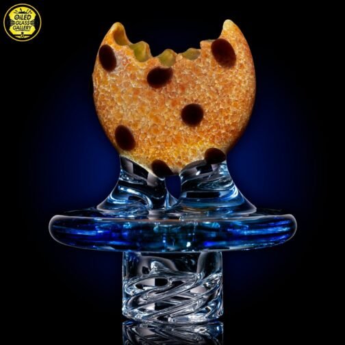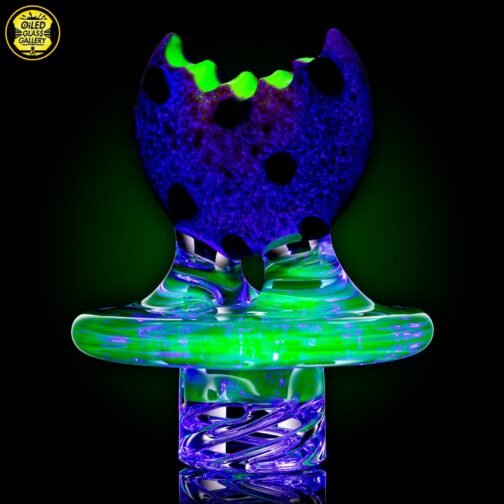 2021 40mm UV Spinner Cookie Cap with a sandblasted Glass Alchemy Silver Strike 5 frit cookie with Glass Alchemy Walnut chips, Northstarglass UV Illuminati center, and a UV Bluminati base with spiral tip. It comes with a Quartz pearl and fits most bangers up to 38mm.