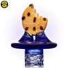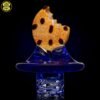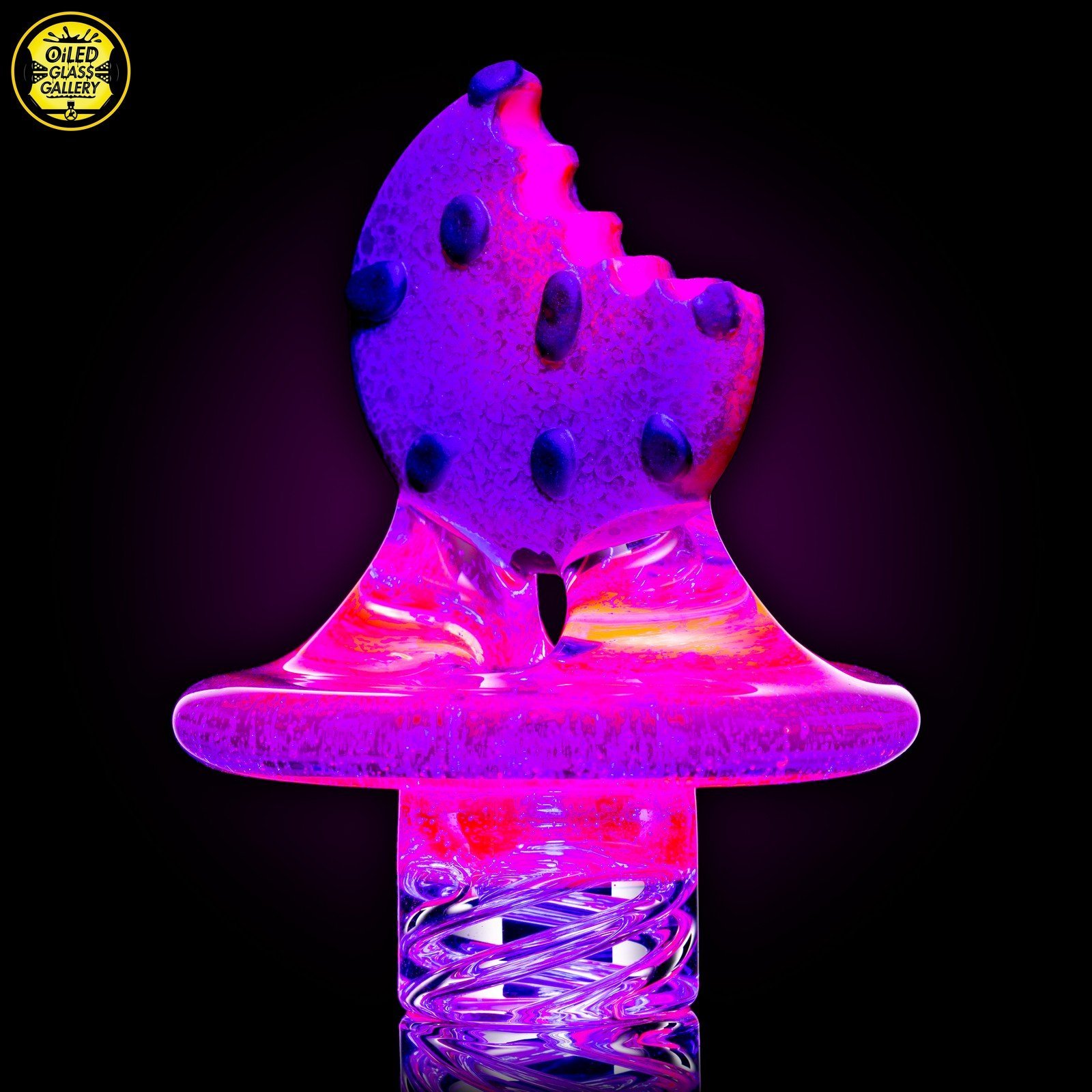 2021 42mm UV Spinner Cookie Cap with a sandblasted Glass Alchemy Silver Strike 5 frit cookie with Glass Alchemy Walnut chips, Glass Alchemy UV Glow Stick center, and an UV Electric Cobalt base with spiral tip. Comes with a Quartz pearl and fits most bangers up to 40mm.