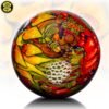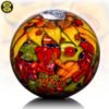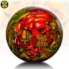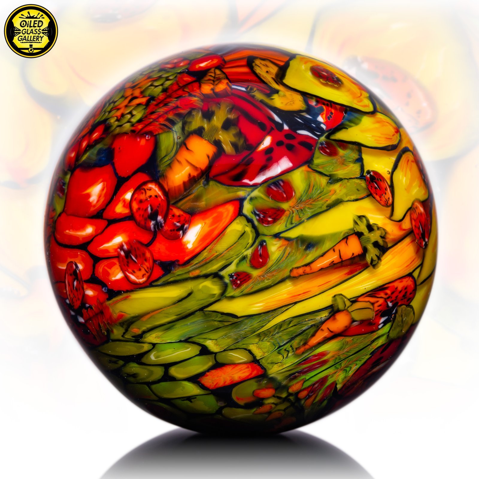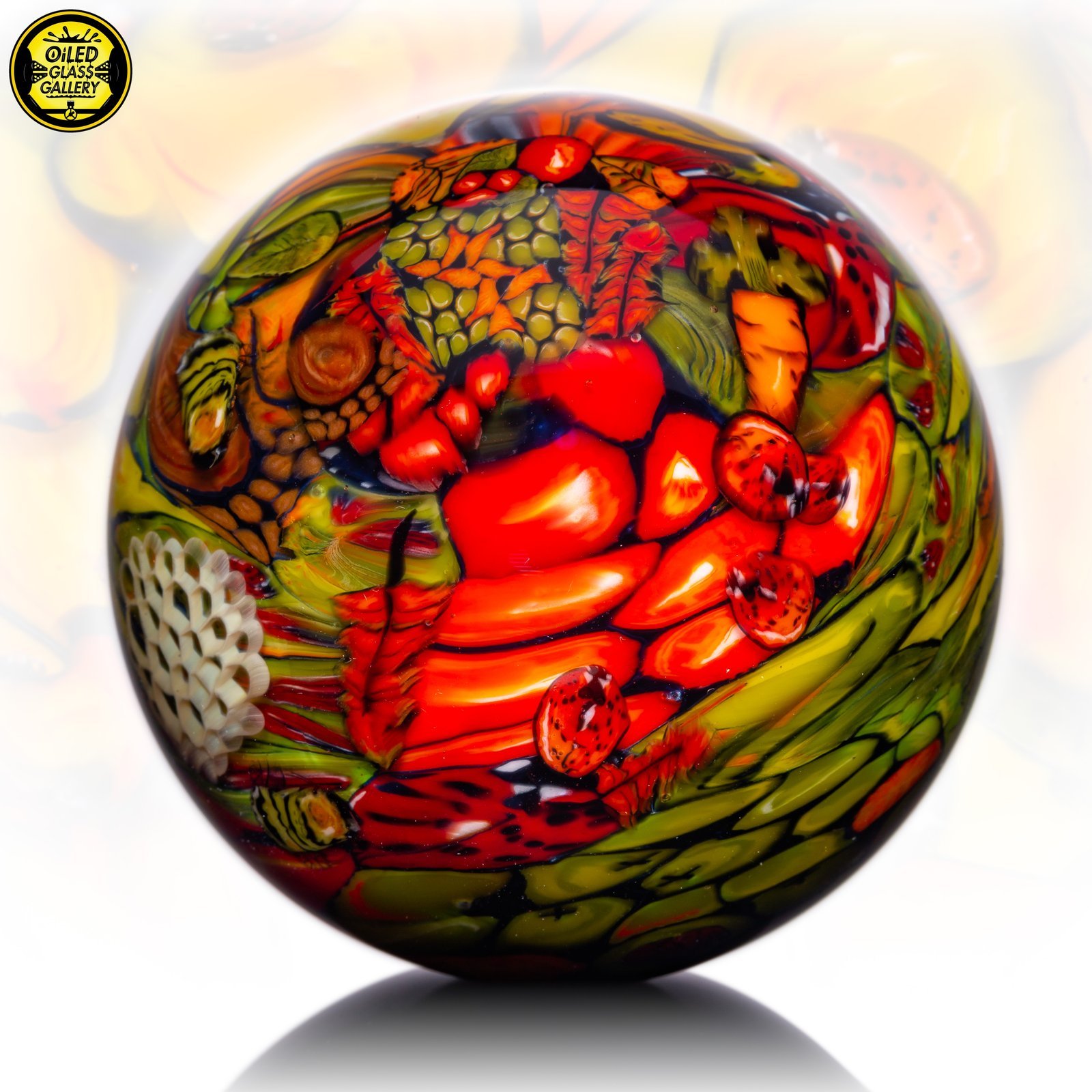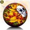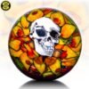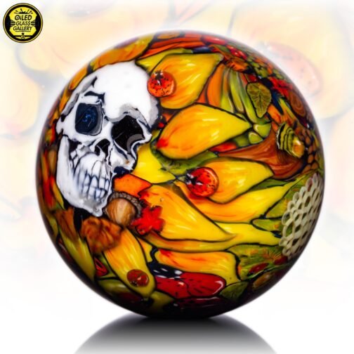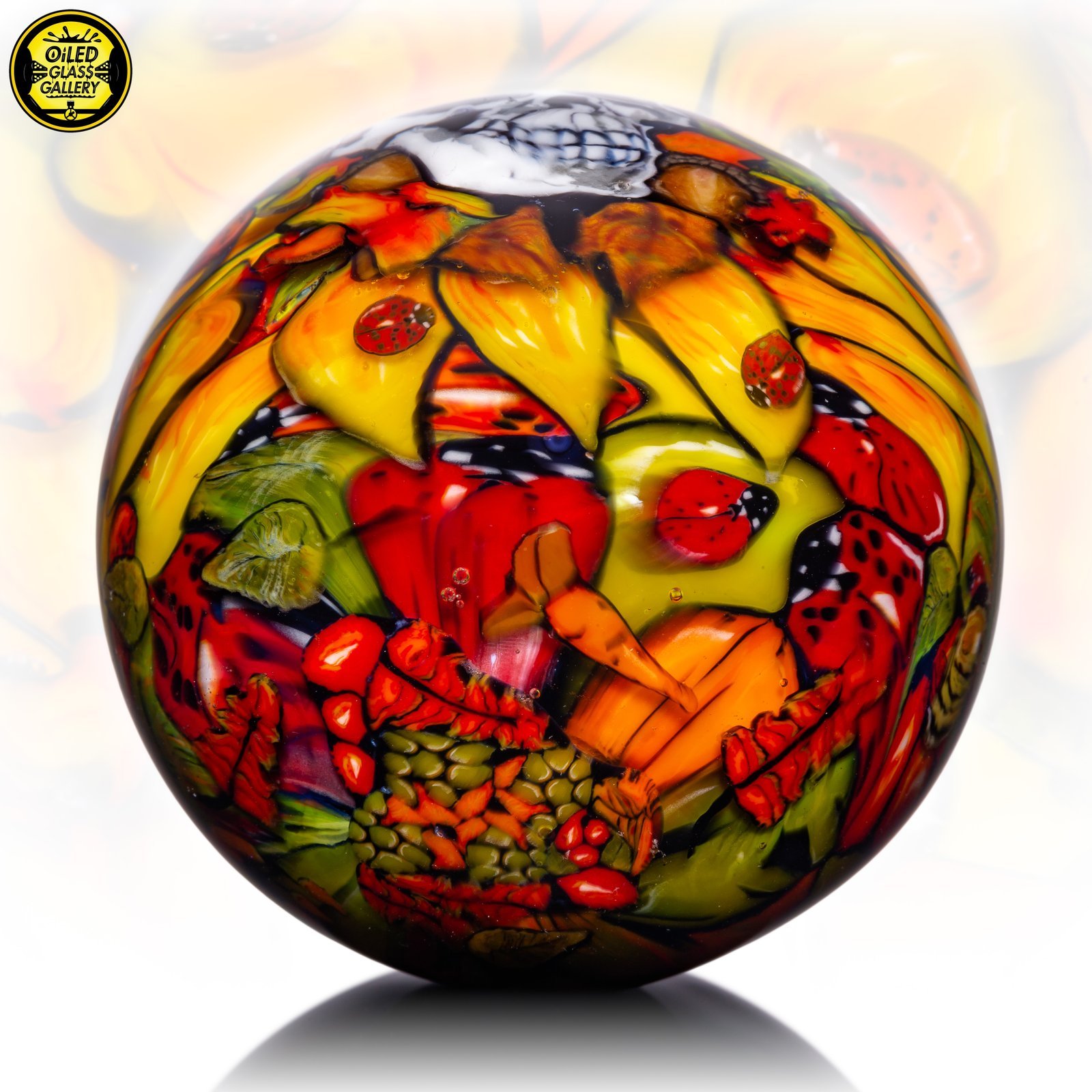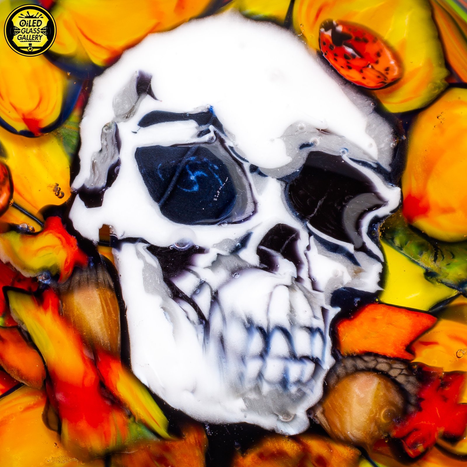2021 60mm/2.35in Autumn Skull Murrine Harvest Millefiori Marble featuring ladybug, carrot, leaf, acorn, honeycomb and skull millefiori.