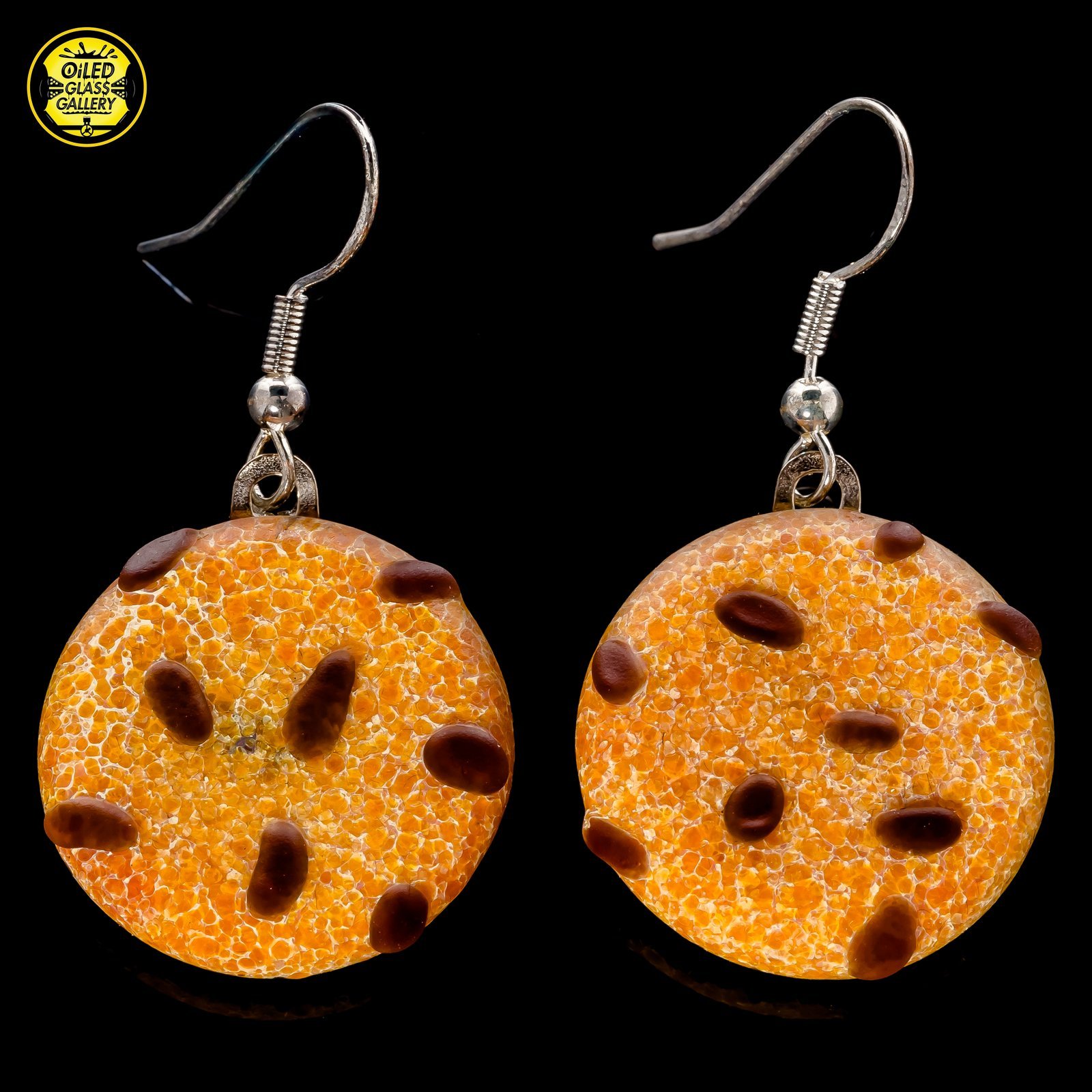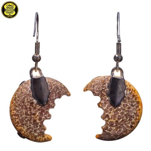 2020 1in Bitten Cookie dangle earrings made of sandblasted Glass Alchemy Silver Strike 5 frit with Glass Alchemy Walnut chips.