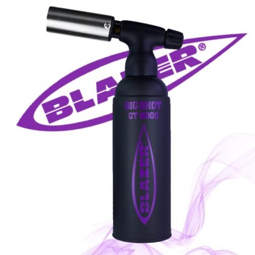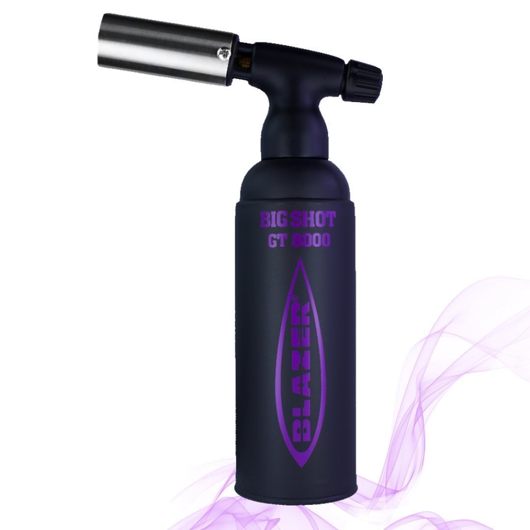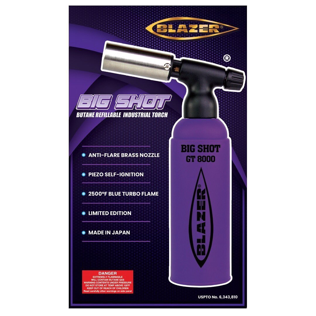 Black with Purple Label Limited Edition Blazer Big Shot GT8000 Torch made in Japan featuring a stainless steel nozzle and are butane refillable.