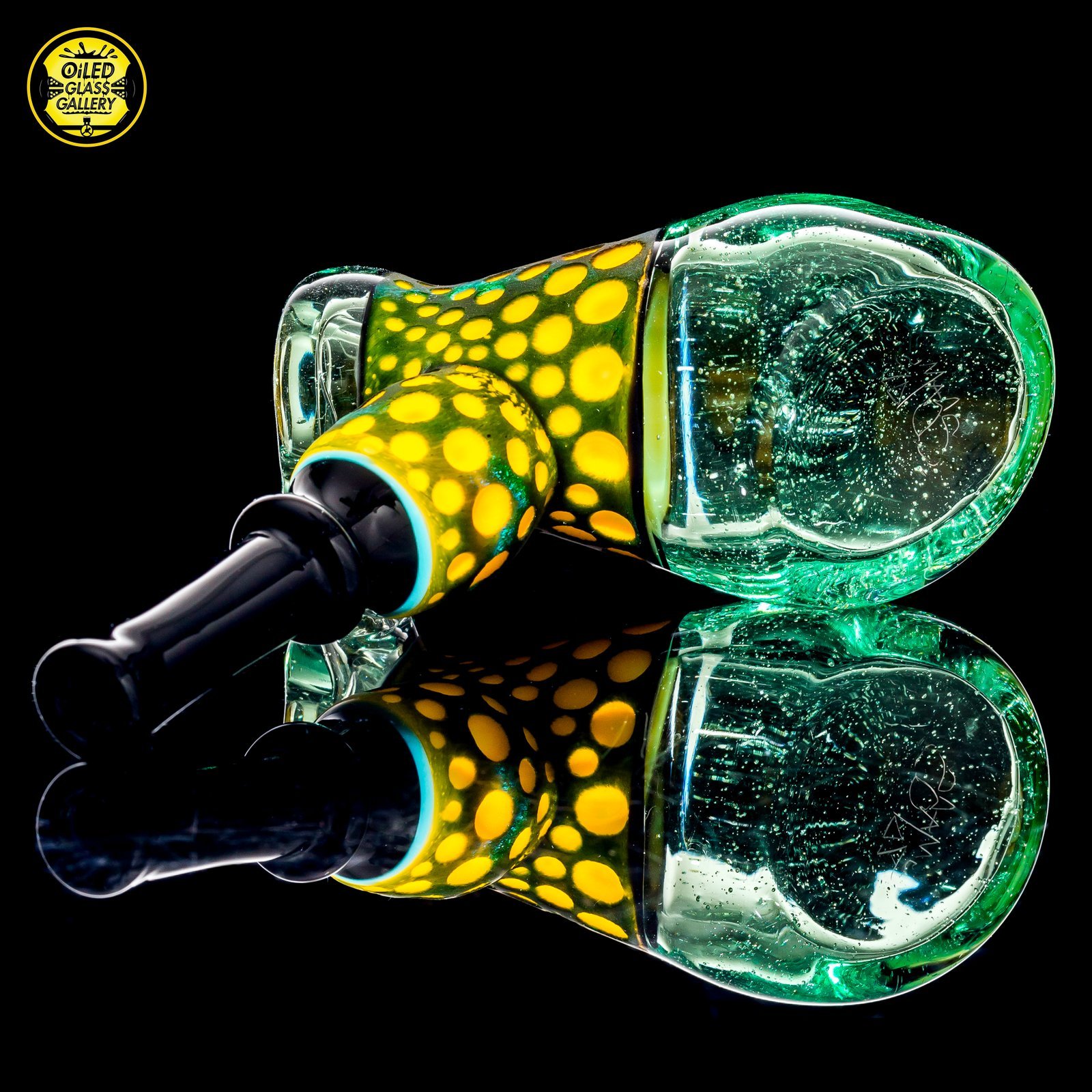2020 CFL Graal Hammer Pipe made of Northstar Glass CFL Siriusly, sandblasted Northstar Glass Experimental Green #5 frit over Glass Alchemy Yellow Crayon and Glass Alchemy Eclipse Black mouthpiece.