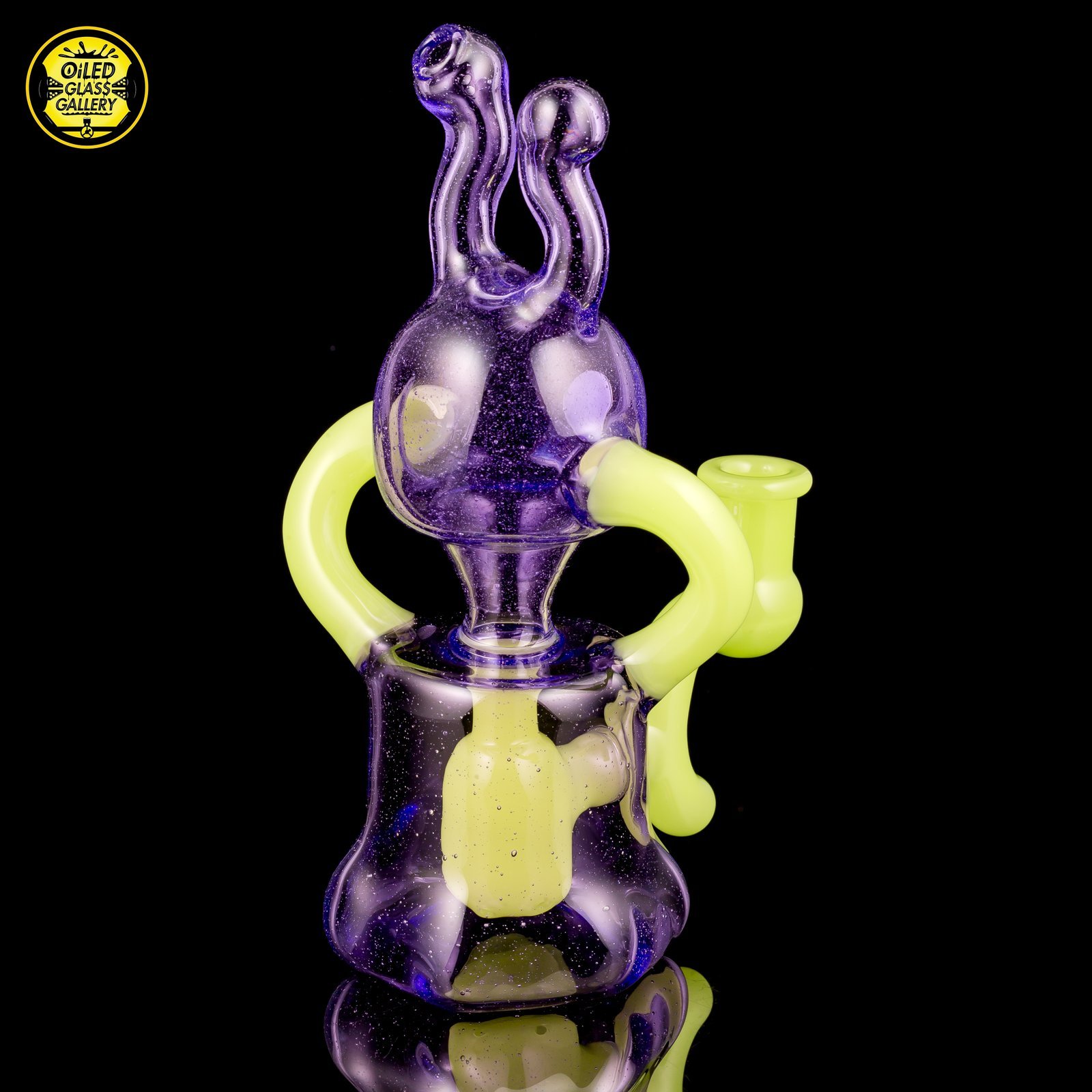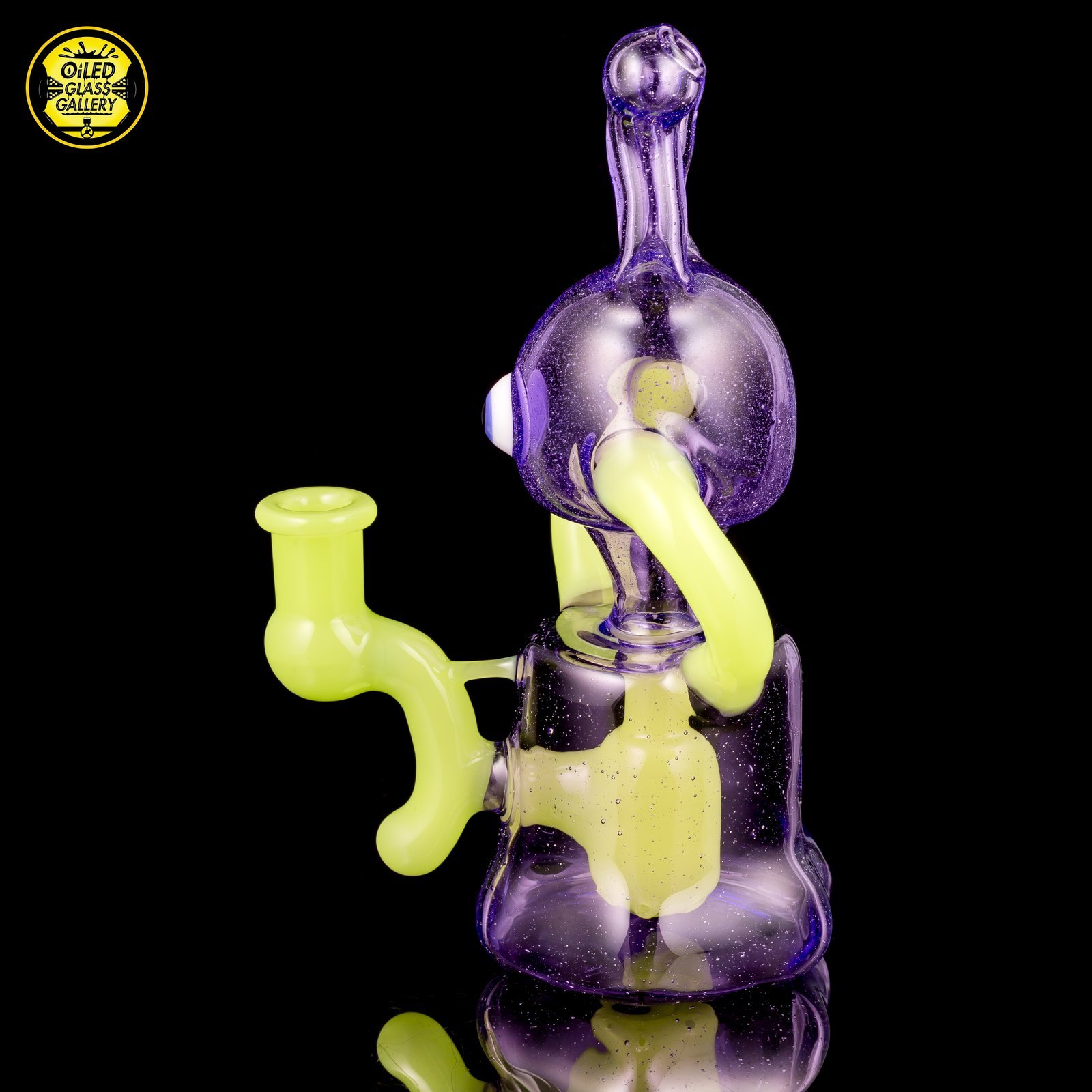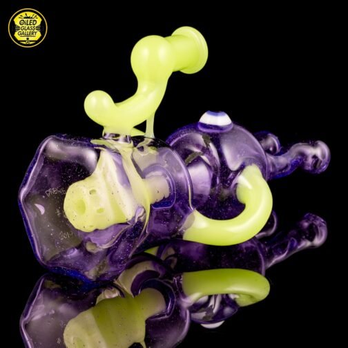 2019 10mm 7in Klein Sluggo Cycler made of Trautman Art Glass Purple Lollipop & Glass Alchemy Antidote. This design by Drew incorporates his classic Sluggo shaping into a shredding water recycler with a 6-hole diffuser, internal drain and a thick dotstacked eye. One of the first full color versions made and comes with a matching 30mm Sluggo bubble cap, all shipped in a Black Pelican iM2050 case.