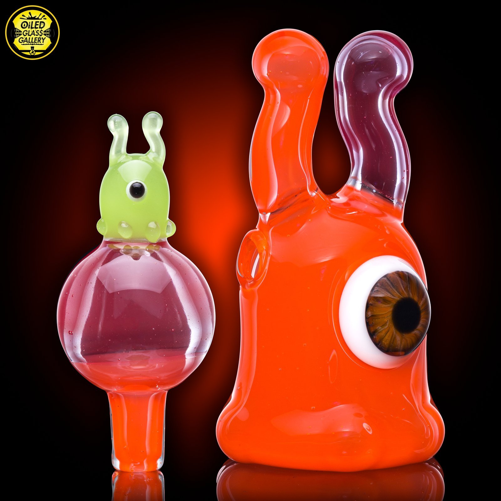 2020 10mm 6in Klein Sluggo Cycler made with Greasy Glass Neo Strawberry and PDX Tubing Company Ghost OJ. Features eyes made of Northstar Glass Cherry, a matching bubble cap topped with a Glass Alchemy Double Dose Sluggo, and a large matching Sluggo pendant.