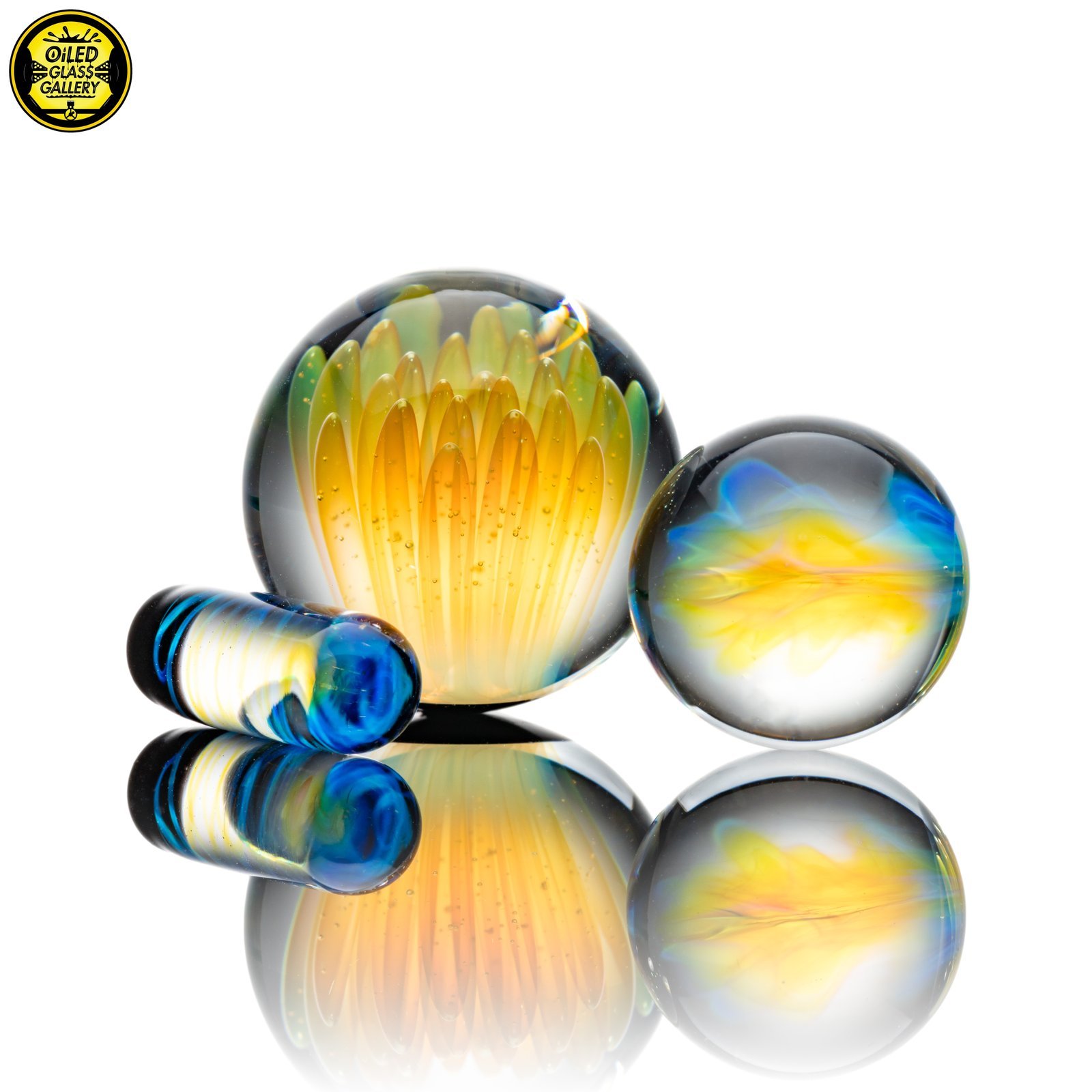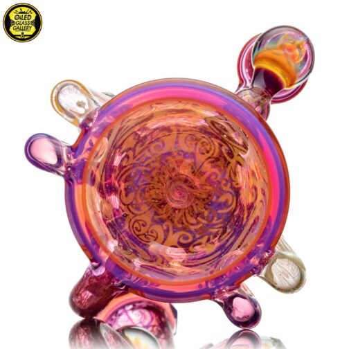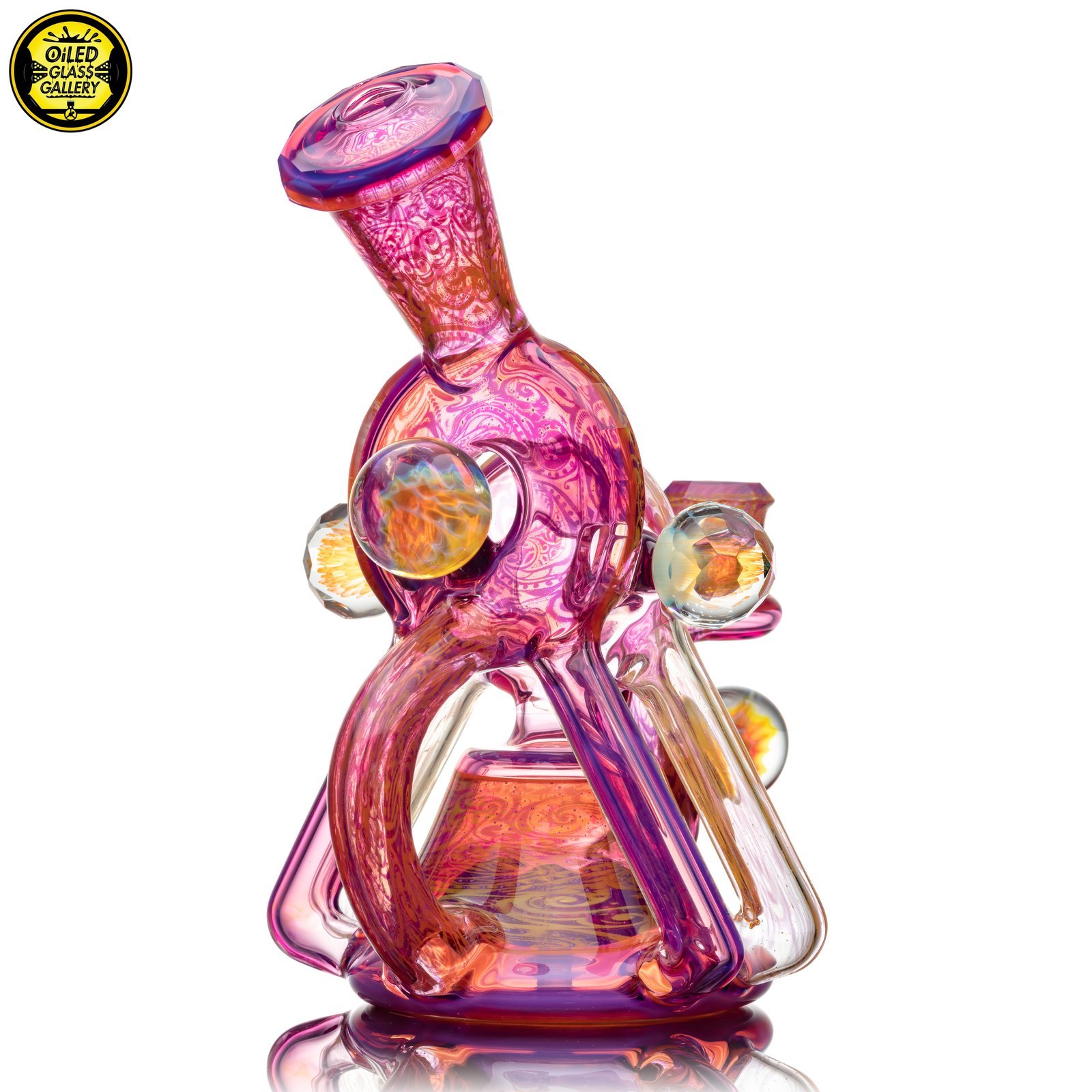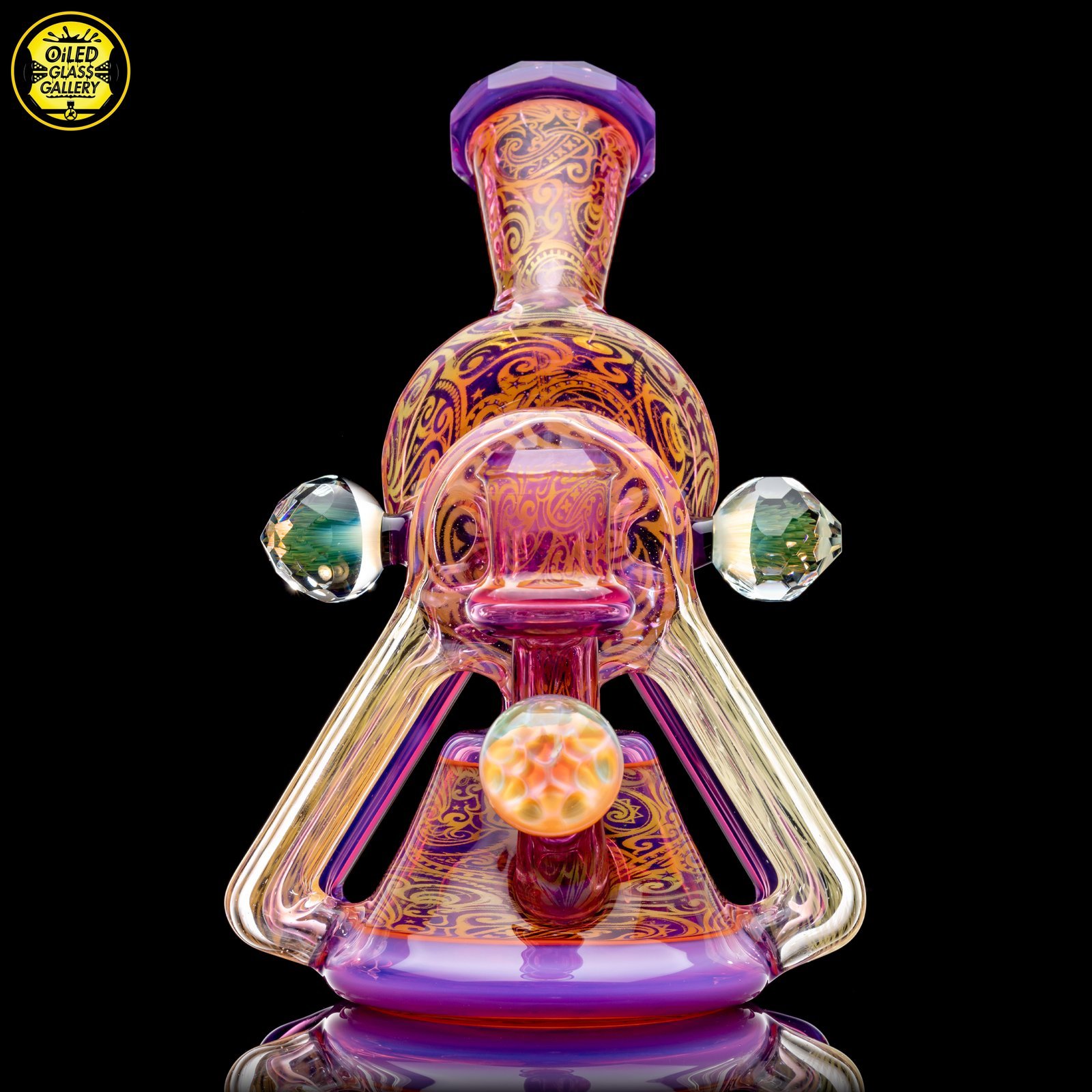 2021 14mm 8in Faceted Double Donut Recycler made of Molten Aura Royal Jelly and fumed sections. Features 48 facets around the mouthpiece, donuts and joint, two fume implosion mibs on the front and back, two faceted fume implosion mibs attached to the sides. Comes with a matching slurper marble set and comes shipped in a Black Pelican iM2075 case.