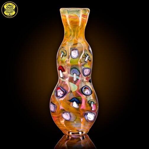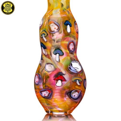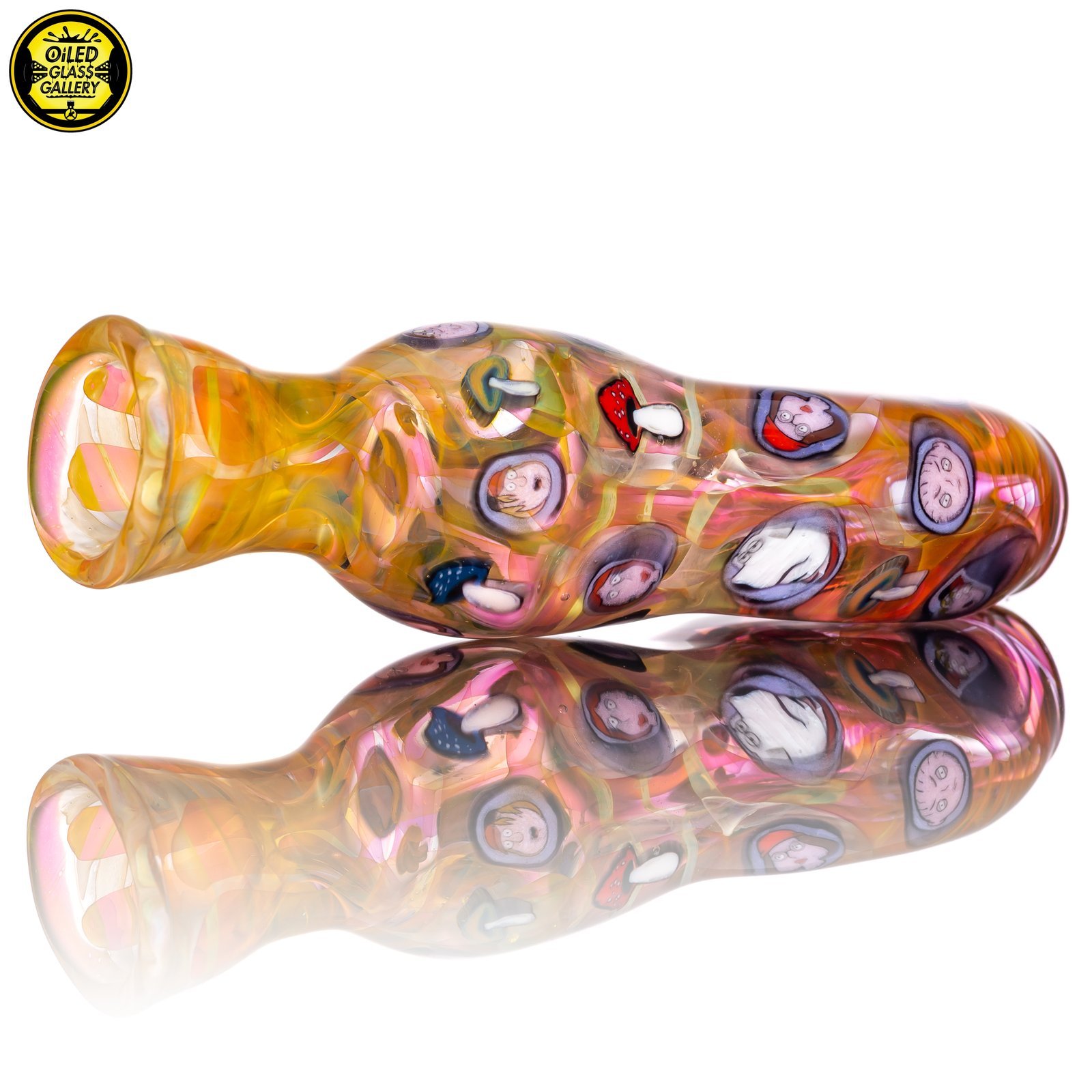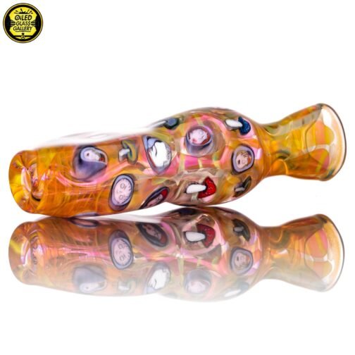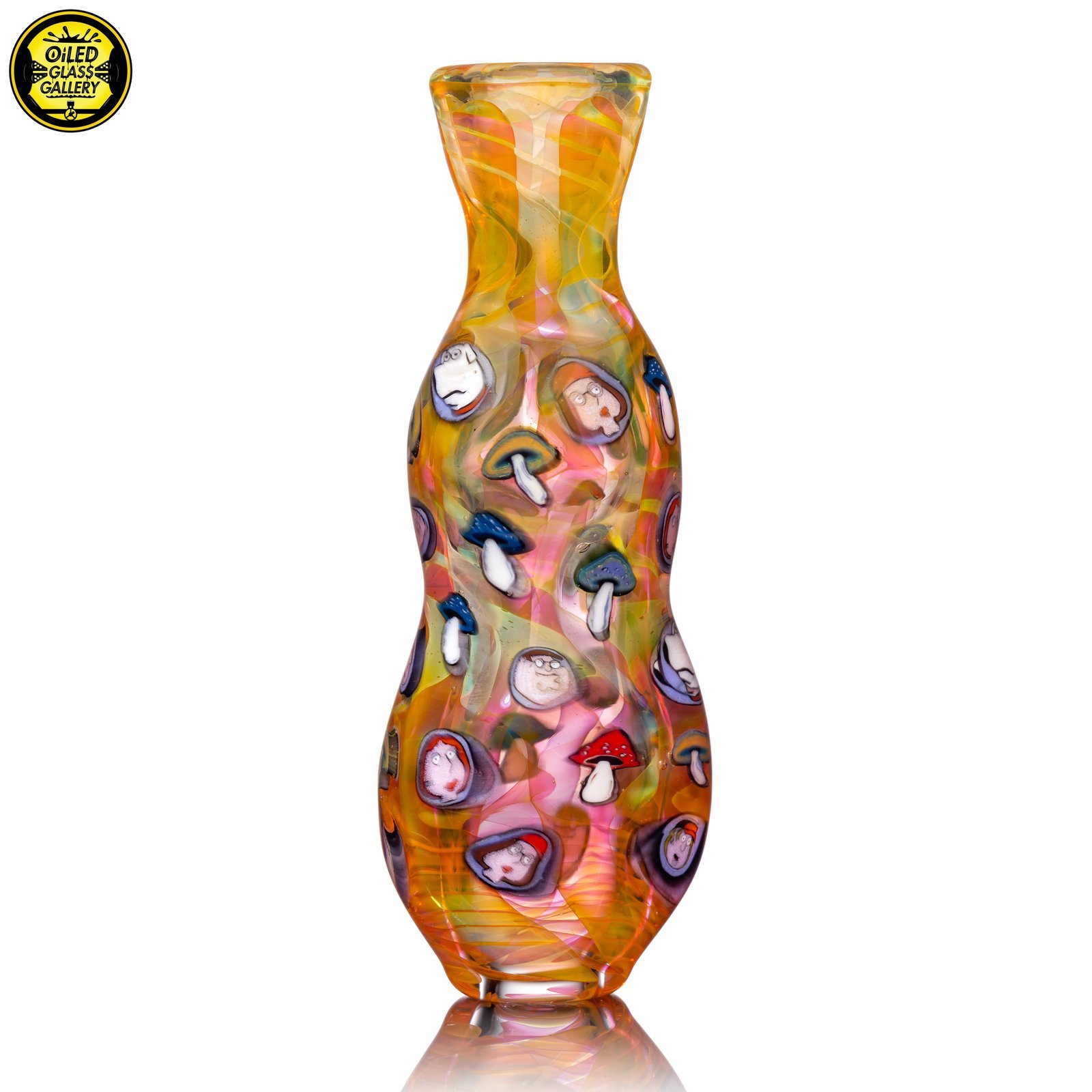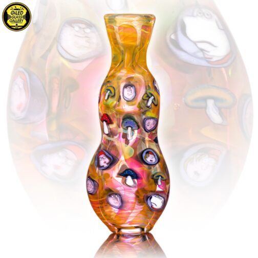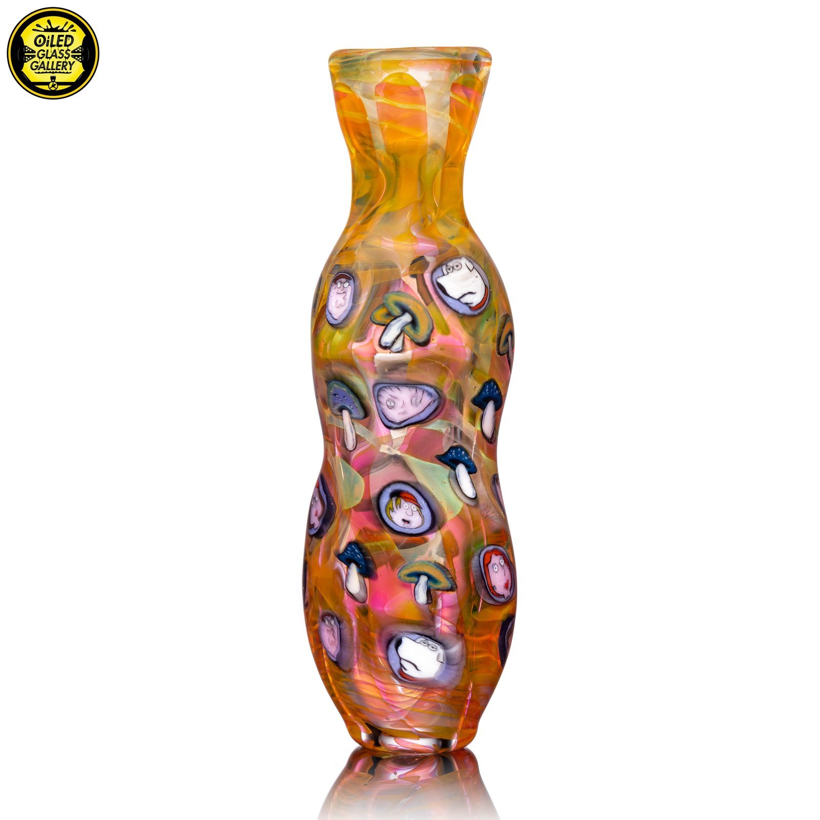 2021 3.5in UV Onnie/Chillum Bat with Family Guy and mushroom millefiori made of fumed glass featuring 29 millefiori.
