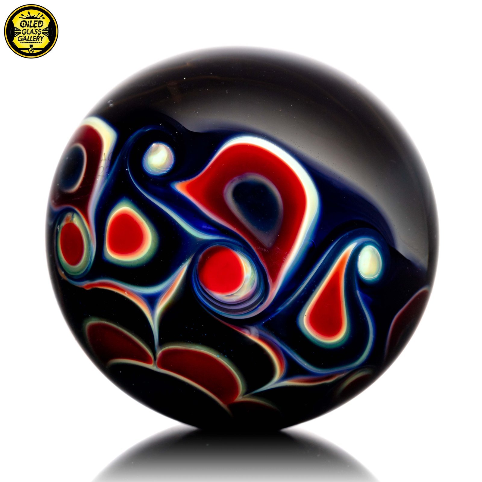 2023 56mm/2.2in Fume Spiral Vortex & Pinwheel Dotstack Marble that comes with a wooden stand.