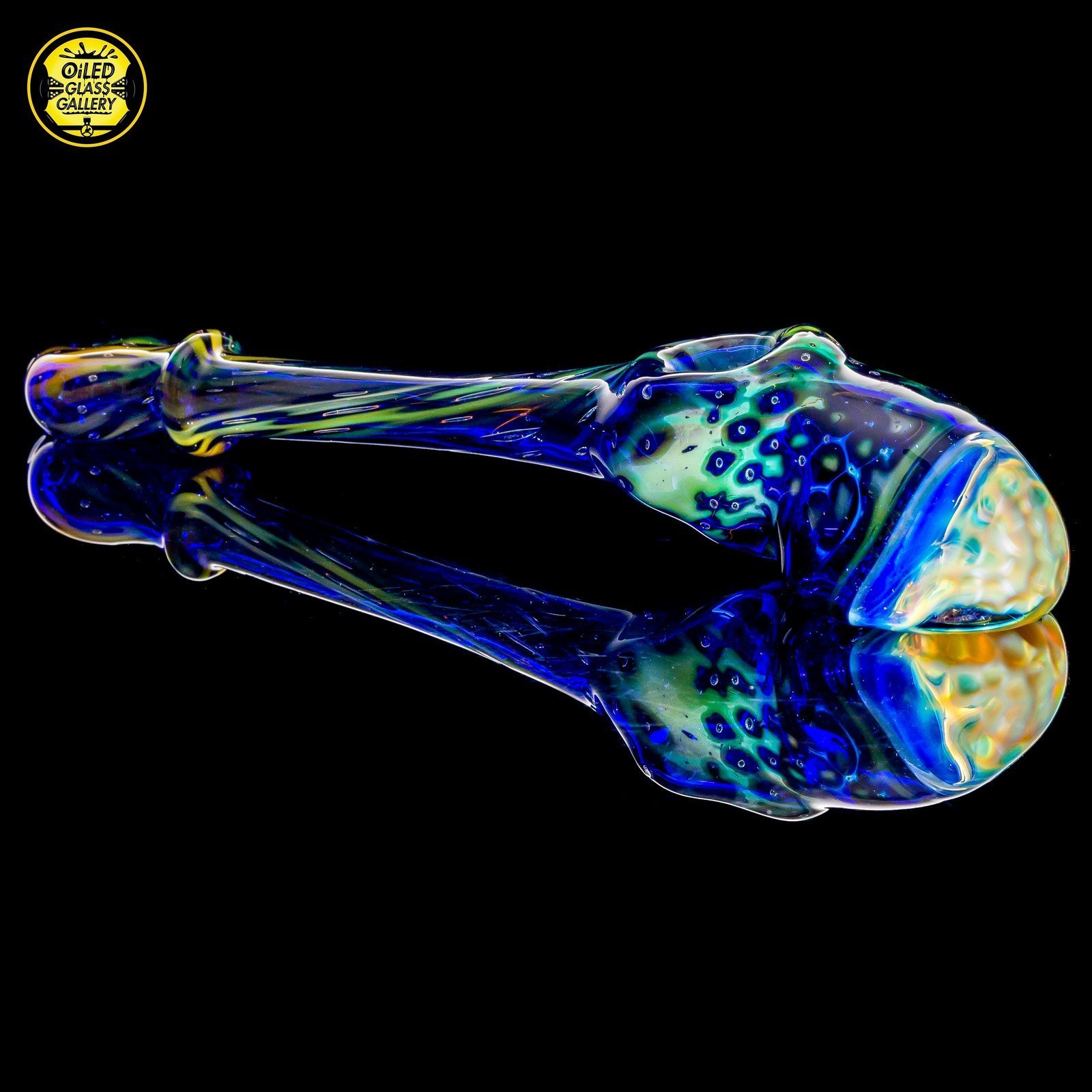 2020 5.5in Hammer pipe made of Gold and Silver fumed bubbletrap over Cobalt with a Silver fumed honeycomb base and featuring Gold and Silver fumed swirl mibs.