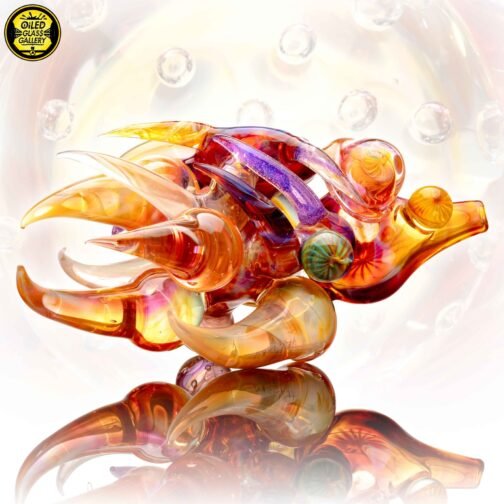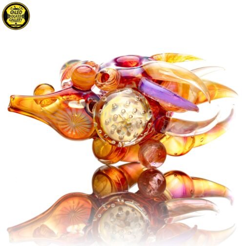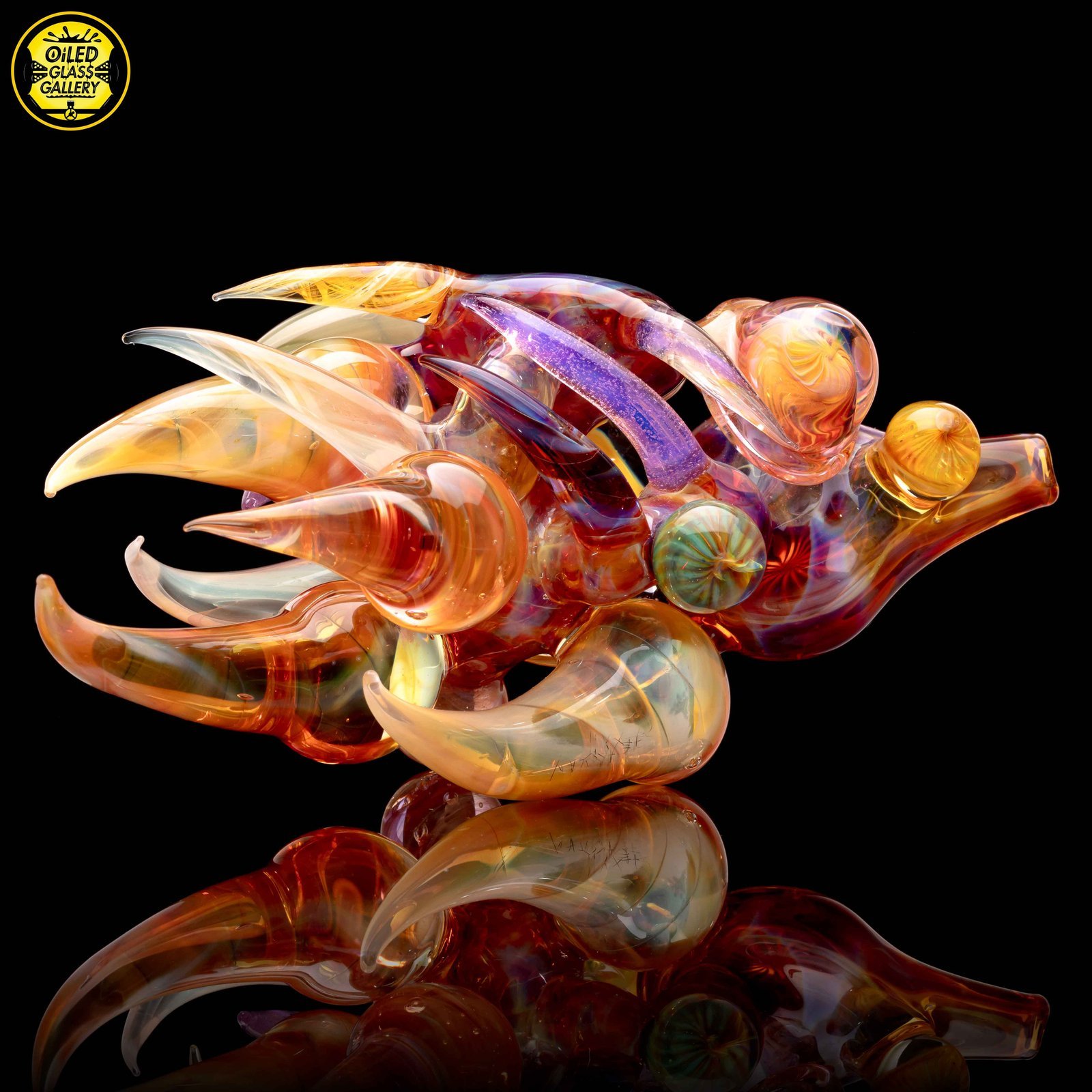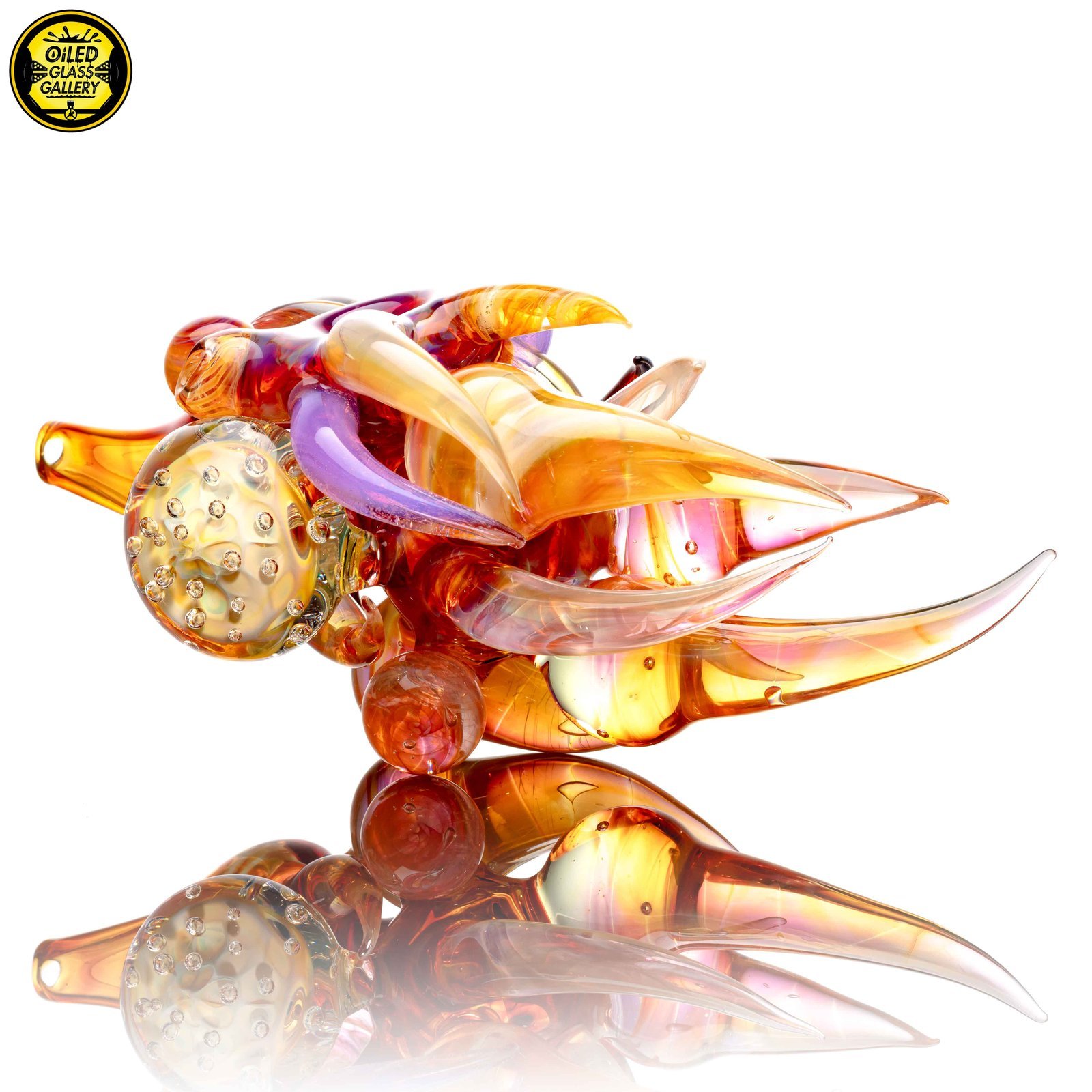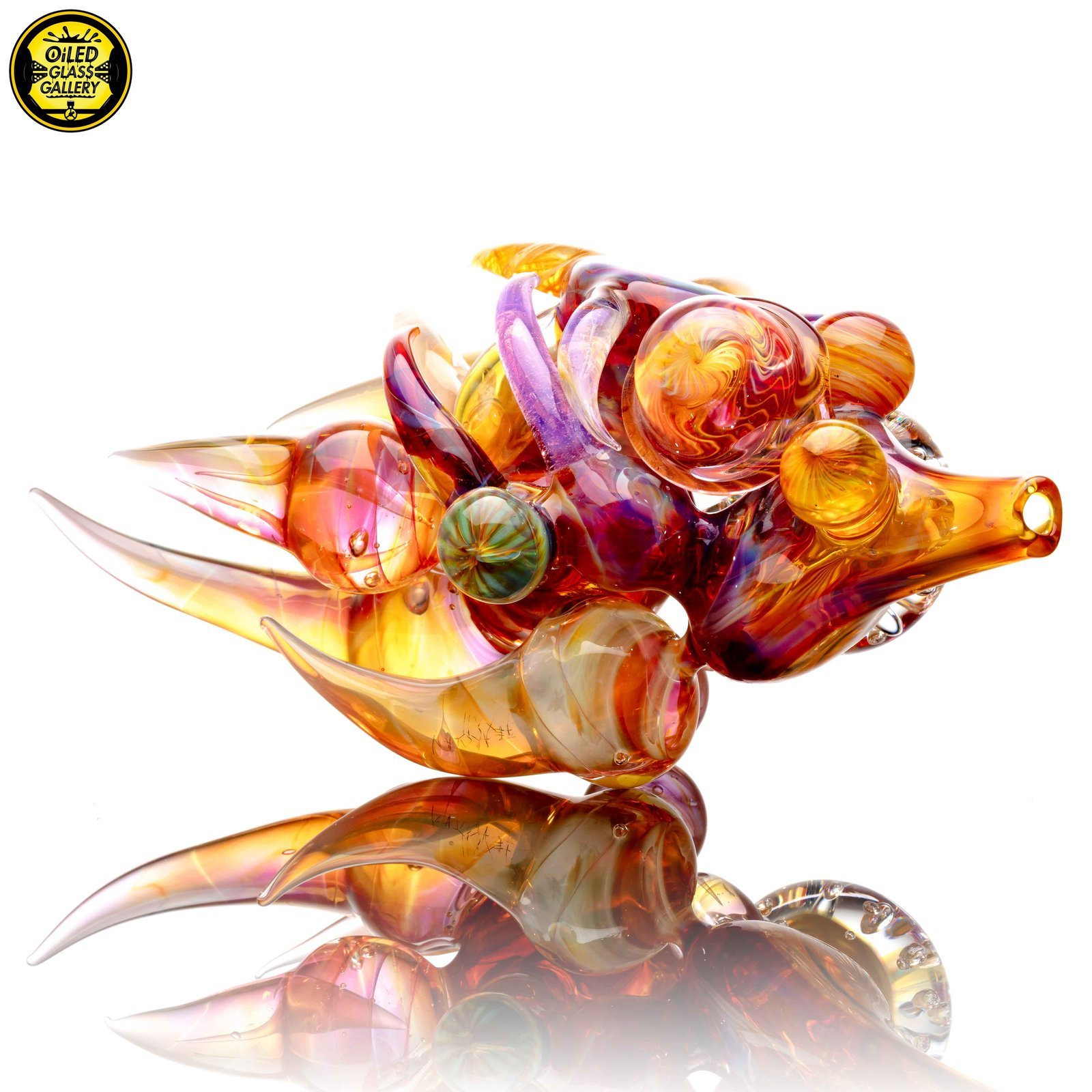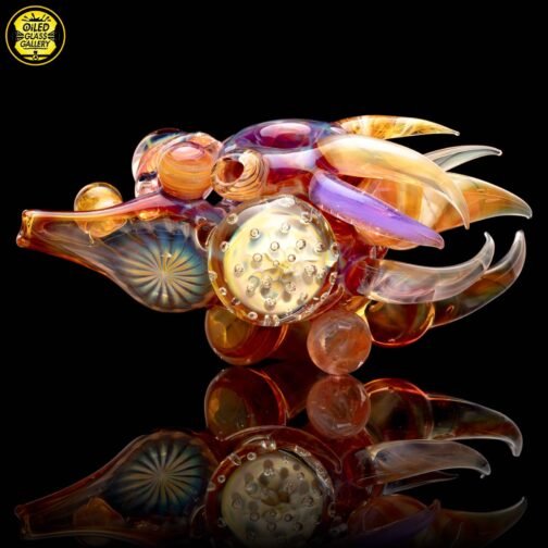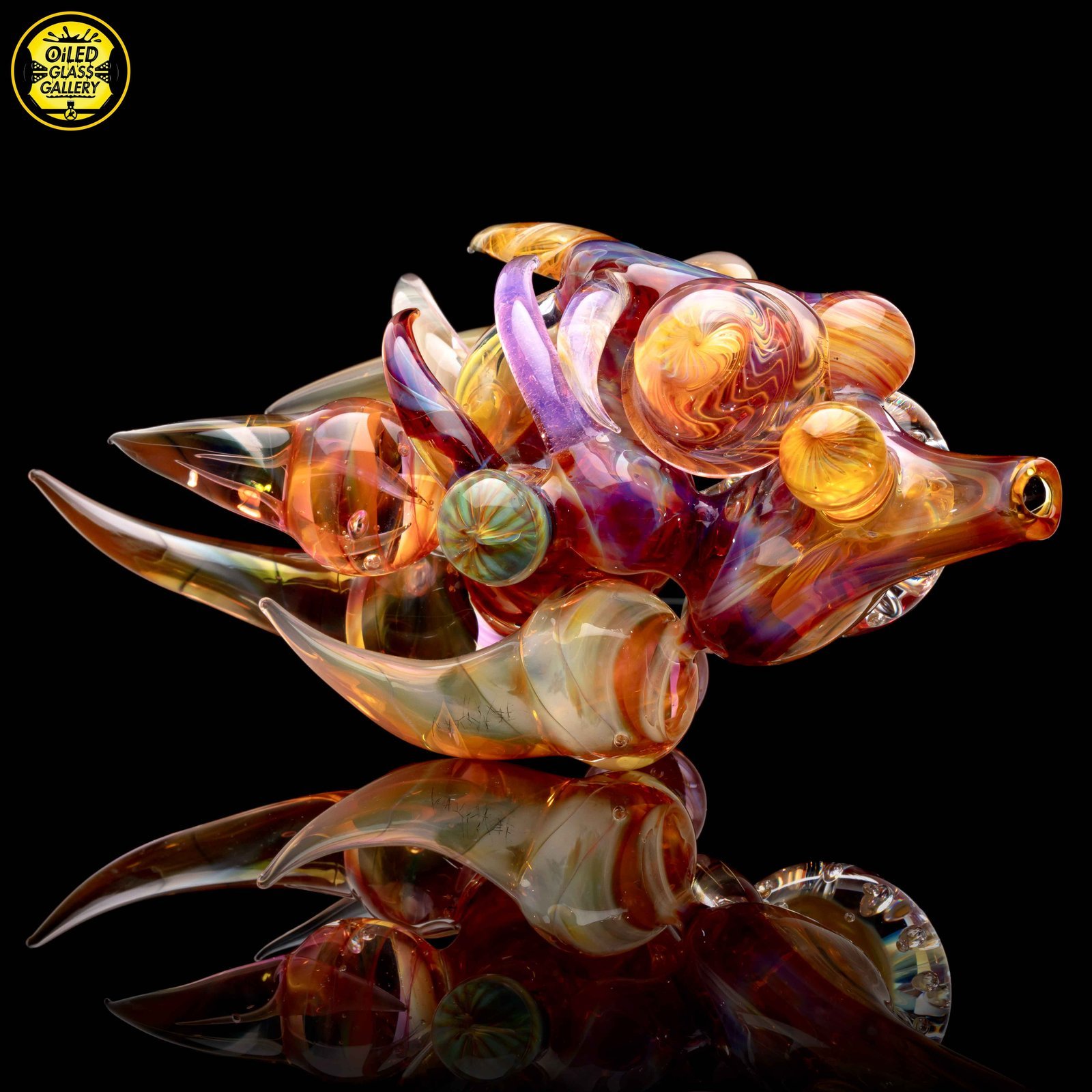 2022 7.5in Horned “Beardlock” Sherlock Pipe made with fumed 24k gold, fumed silver accents and Northstar Glass Amber Purple body with a hint of Molten Aura Telemagenta featuring a bubbletrap mib.