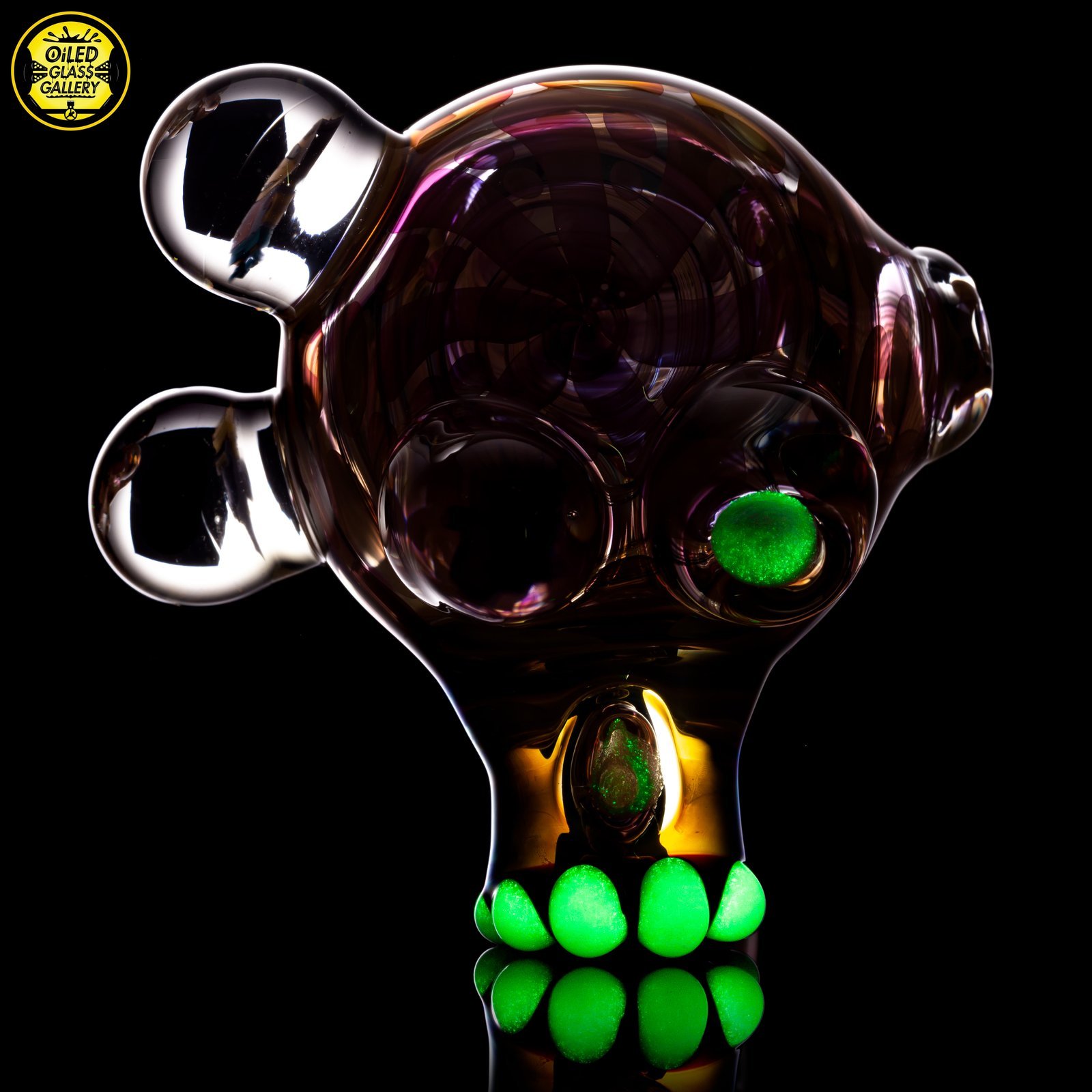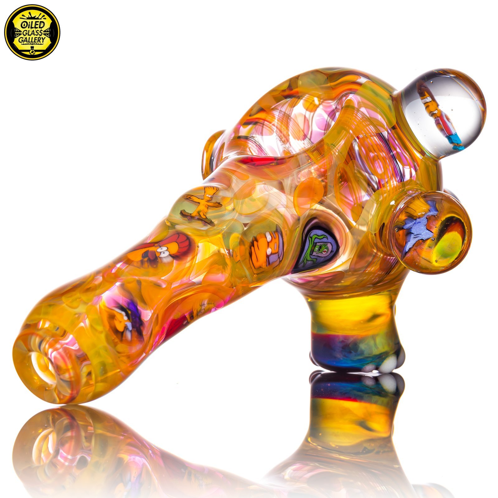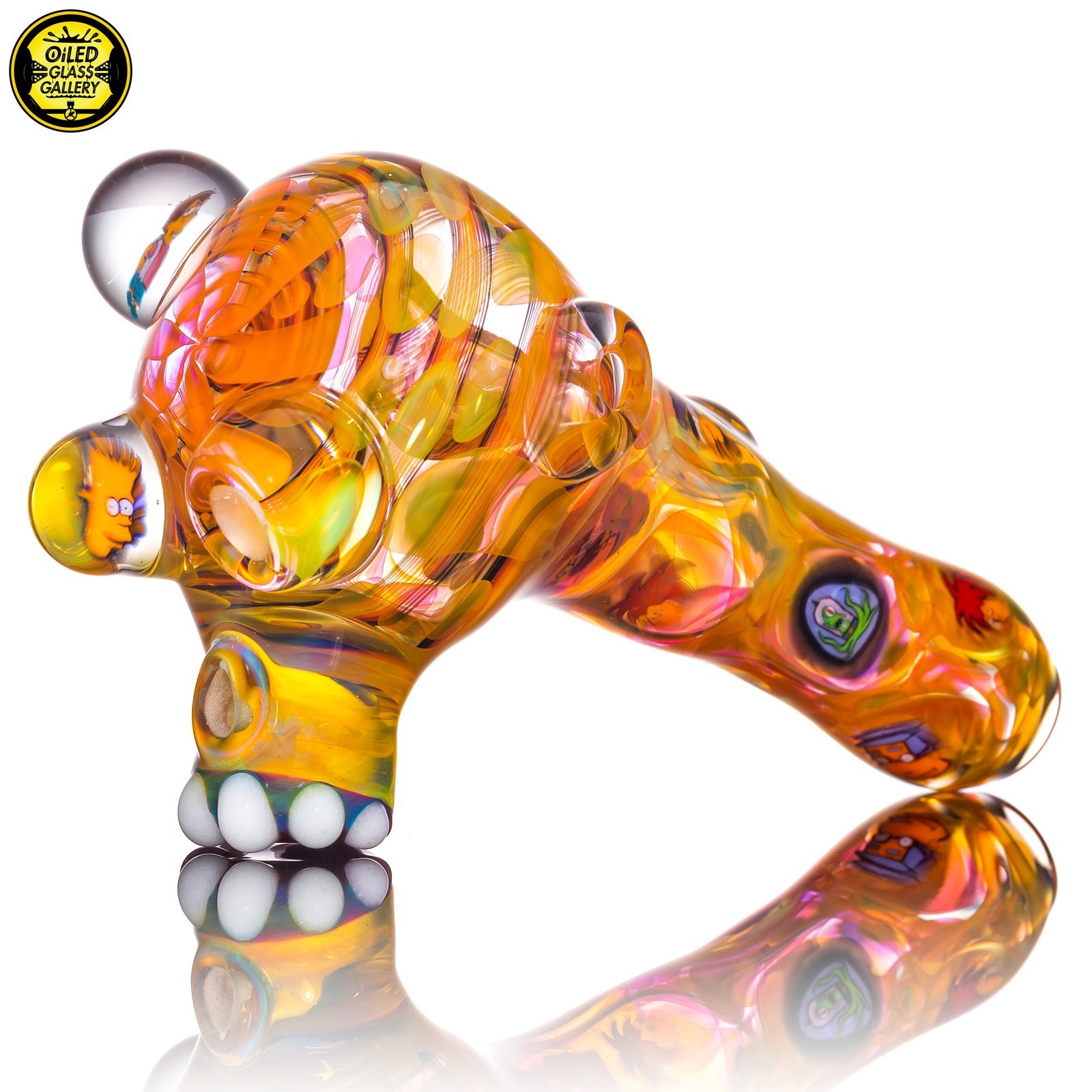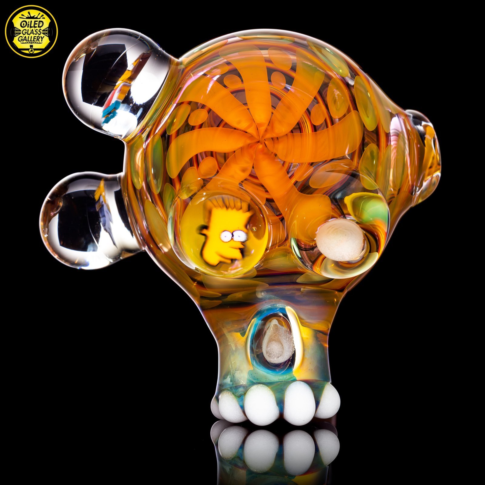 2021 4.5in UV Skull Hammer pipe made of Gold & Silver fume sections featuring 13 encased Simpsons millefiori and 2 Squidbillies millefiori.