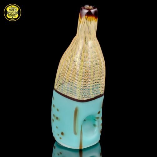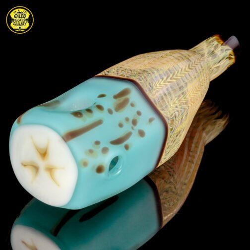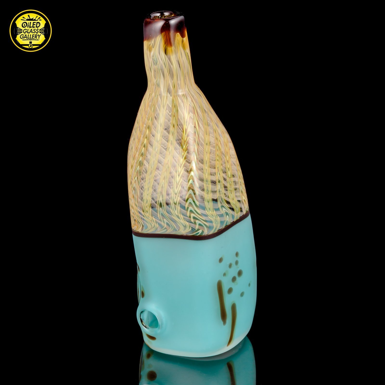 2020 5in Fumed & Sandblasted Blu-nana hand pipe collaboration with JD Maplesden made using Trautman Art Glass Honey Badger, Trautman Art Glass Ivory Tusk, PDX Tubing Co. Ghosted Really Tealy for the base and JD’s beautiful fumed section for the mouthpiece.