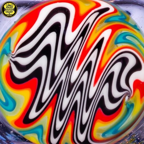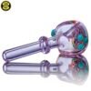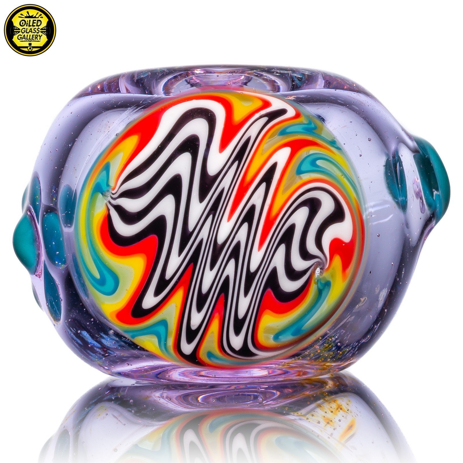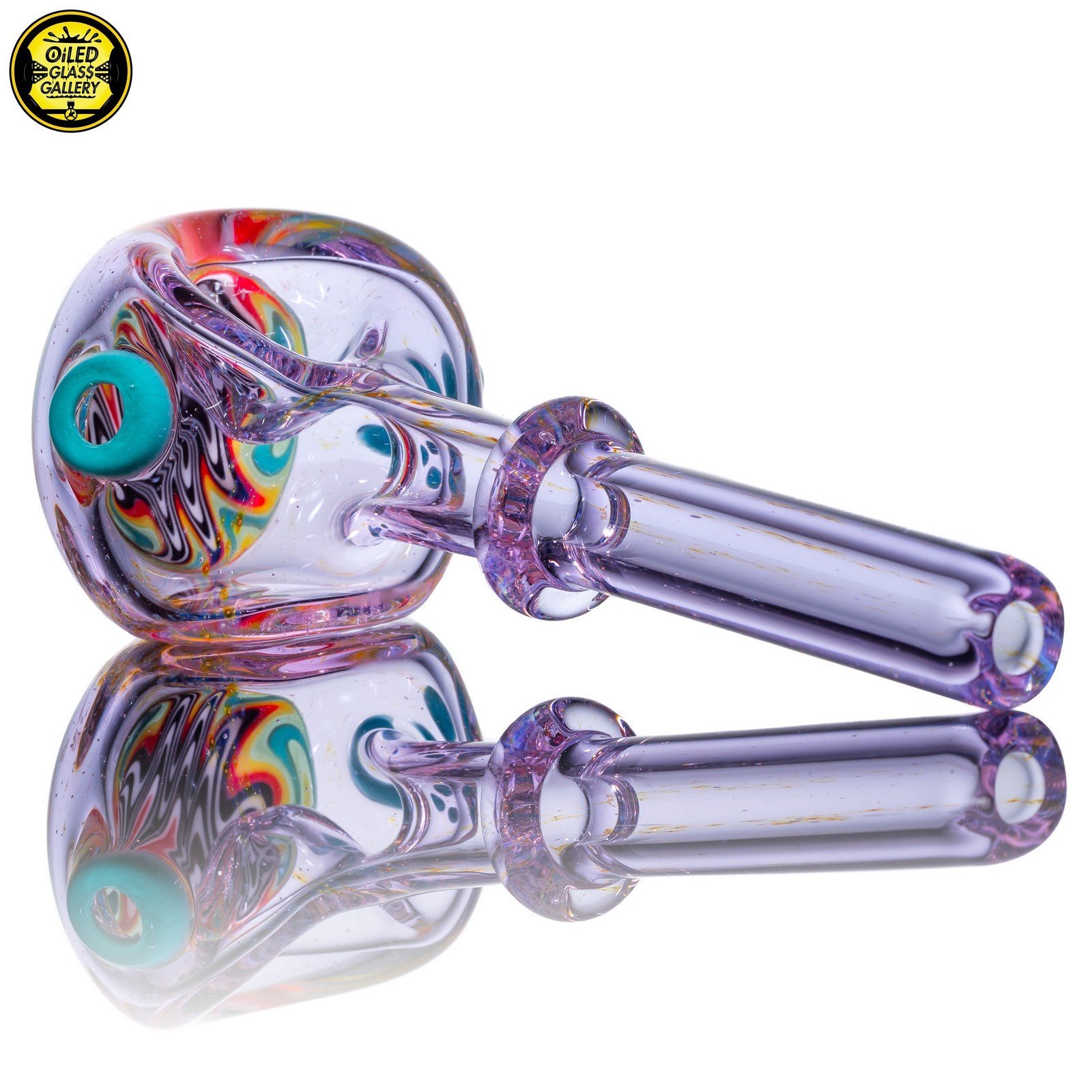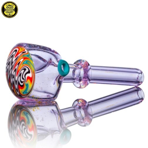 2021 4.25in Fumed Spoon pipe made with Gold & Silver fumed Purple Amethyst with a Rainbow wigwag section featuring 3 mibs on the side.