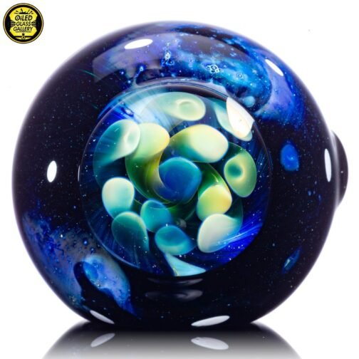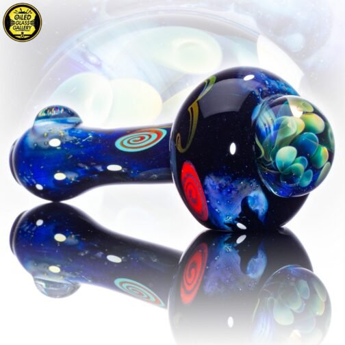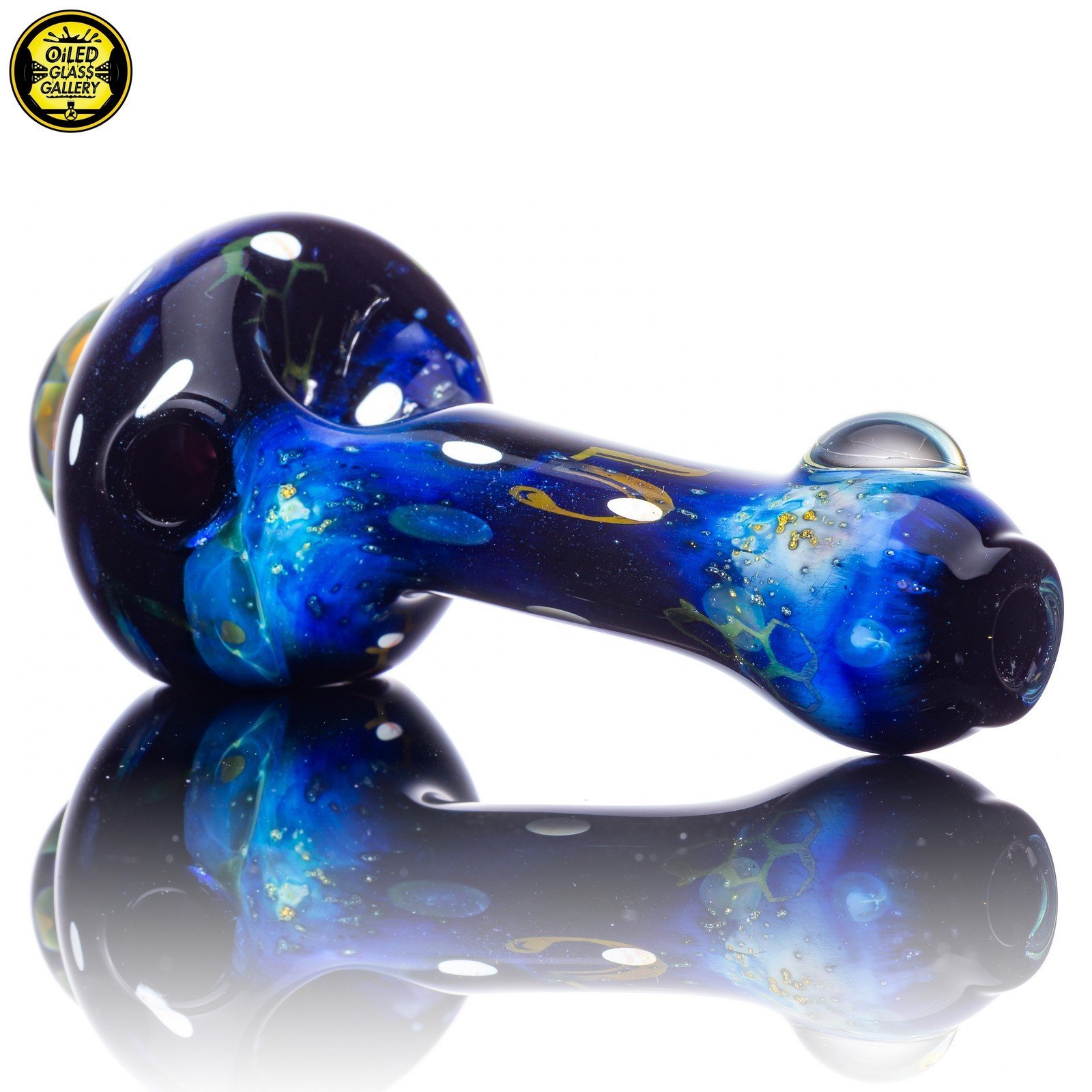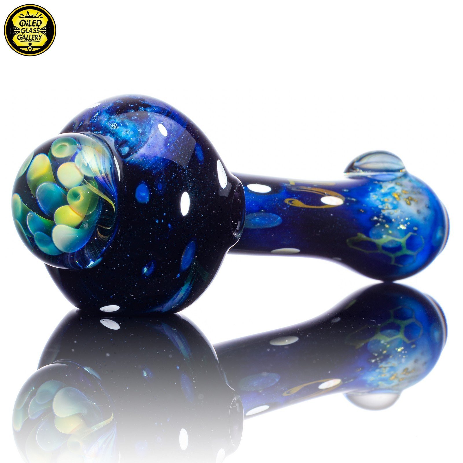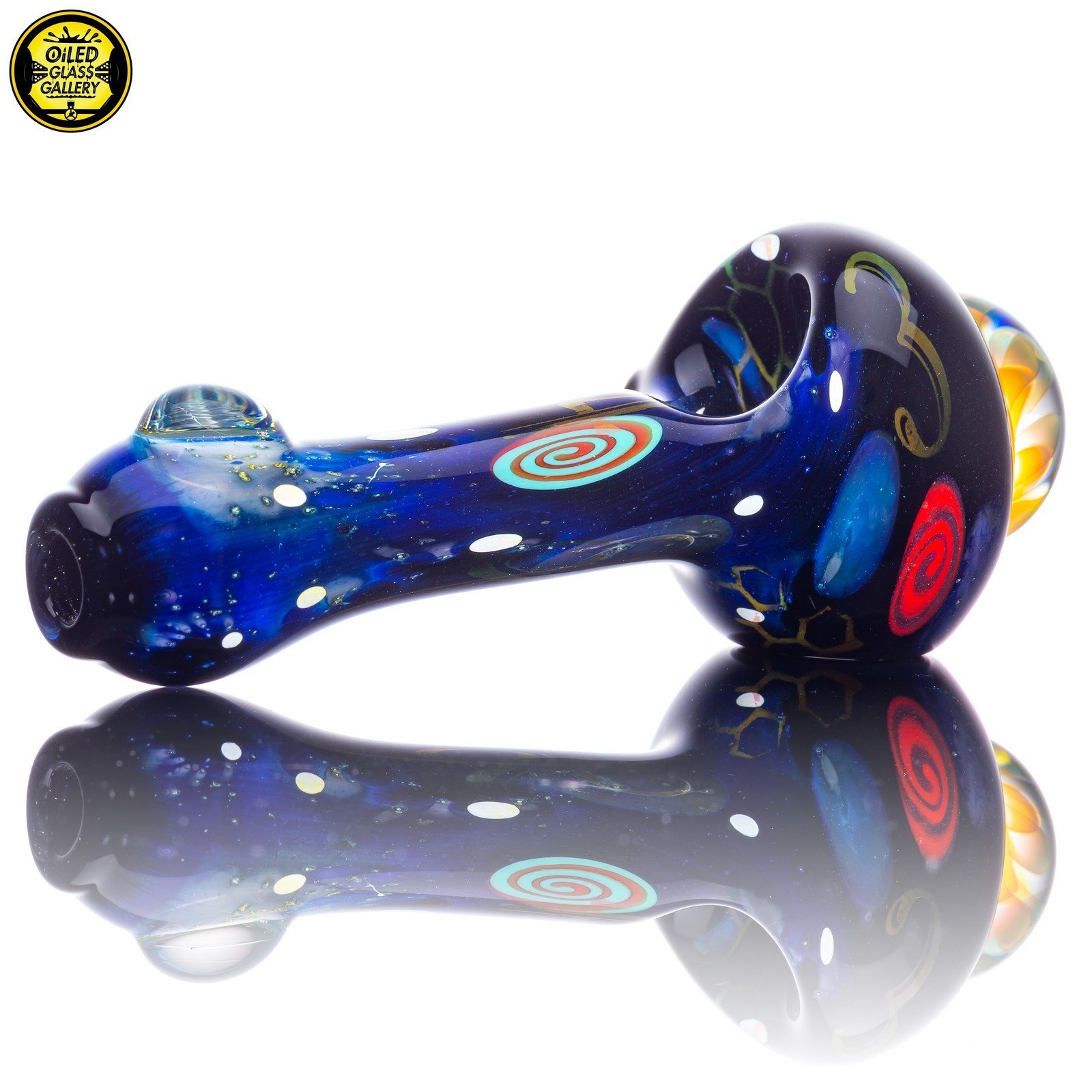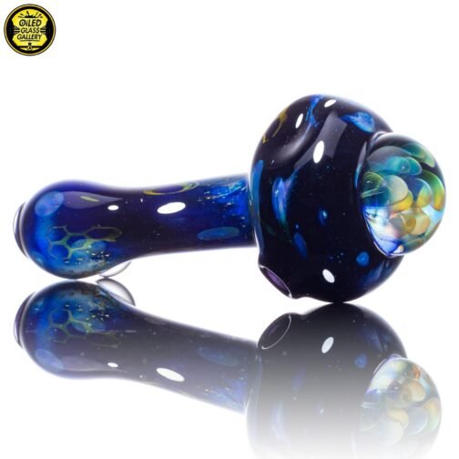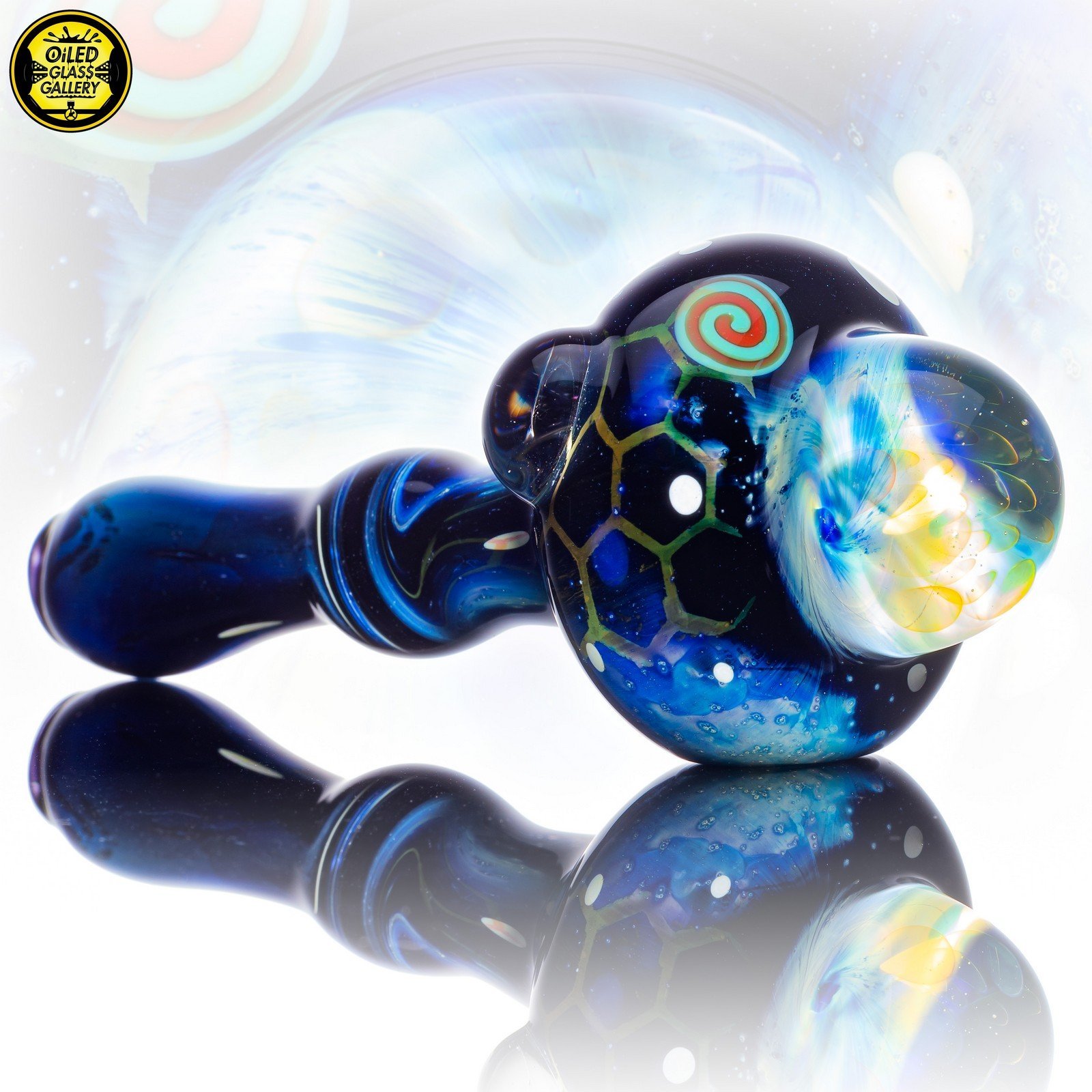 2021 4.25in Spoon pipe made of Spacetech fume over Cobalt Blue with thumbies, fumed numbers & fumed honeycomb patterns featuring a fume swirl implosion mib at the end.
