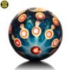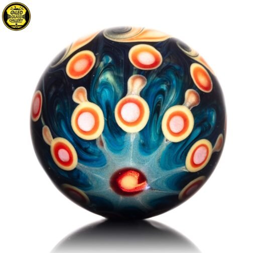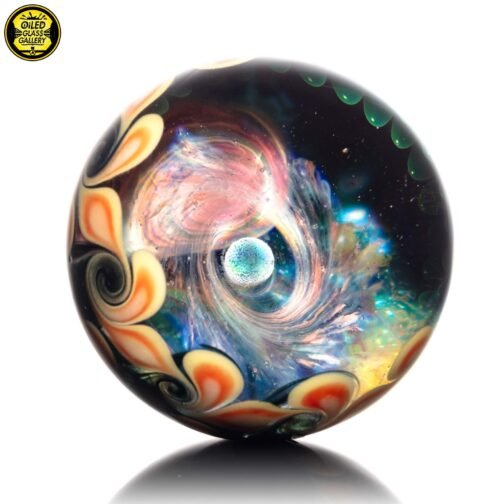 2023 50mm/1.97in Galaxy Fume Marble featuring fumed planets in the background along with an encased opal sphere in the center and a dotstack backing.
