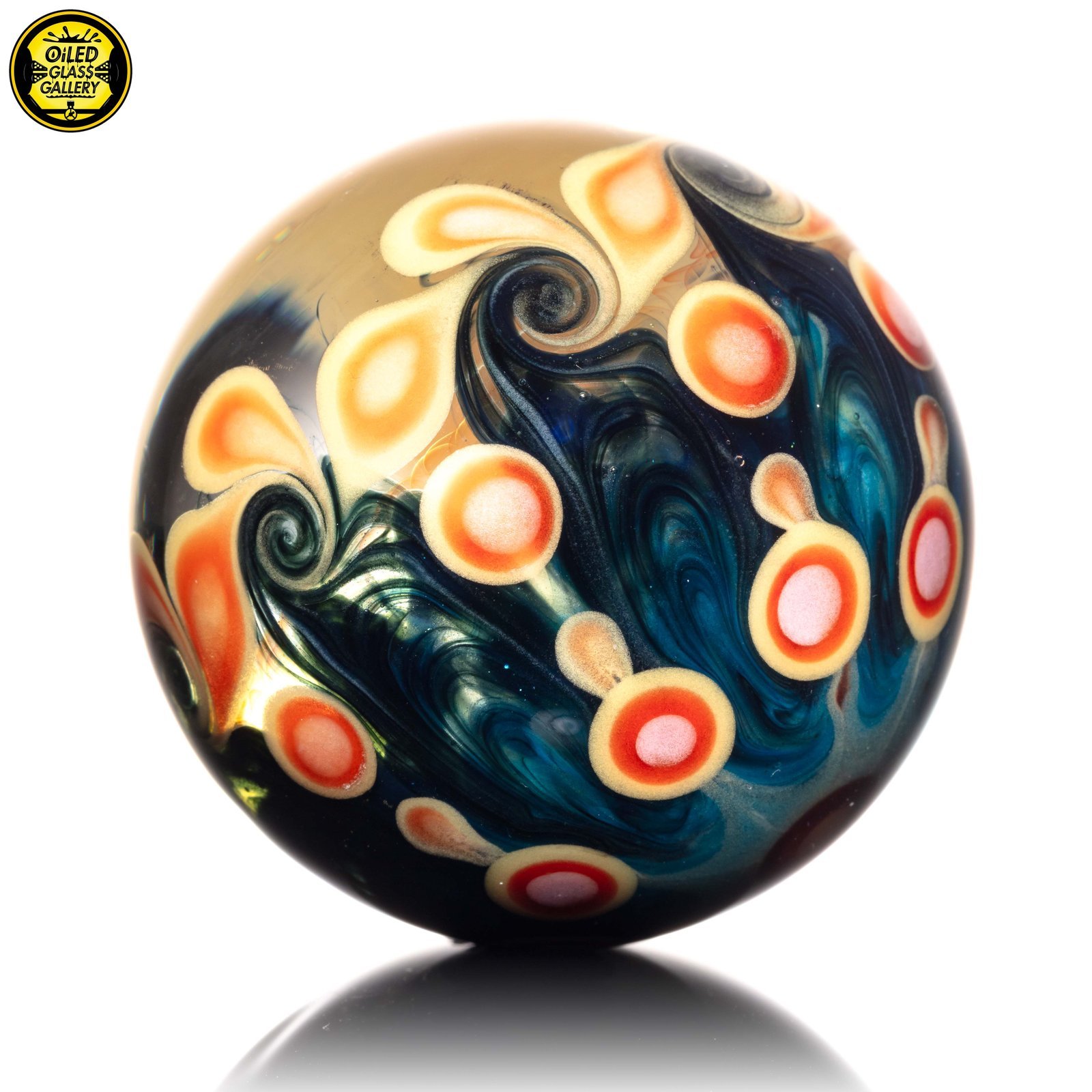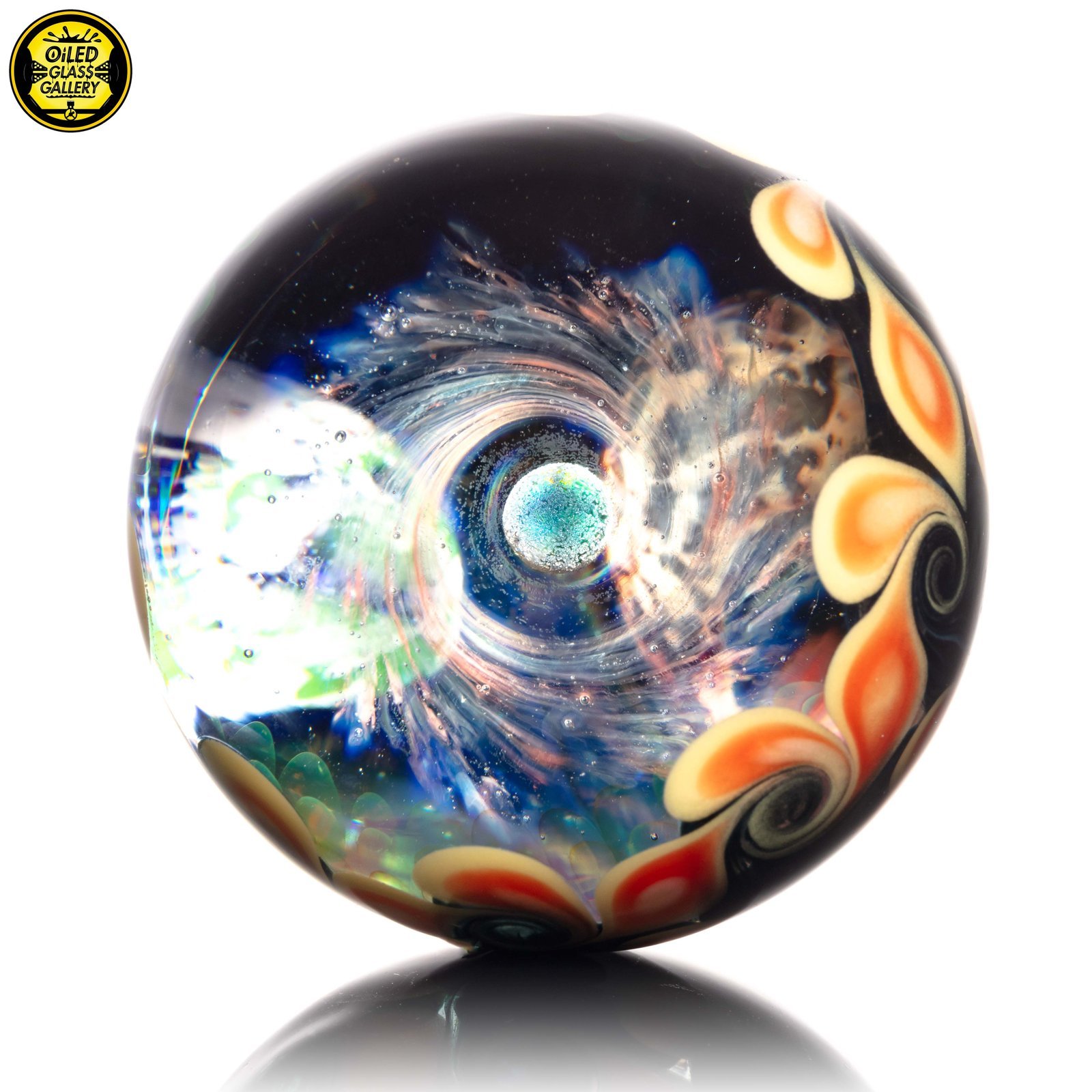 2023 50mm/1.97in Galaxy Fume Marble featuring fumed planets in the background along with an encased opal sphere in the center and a dotstack backing.
