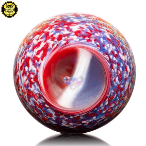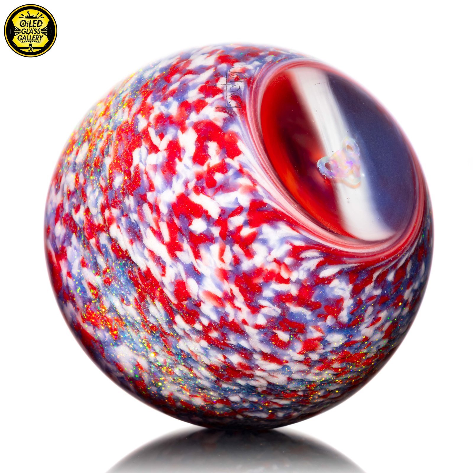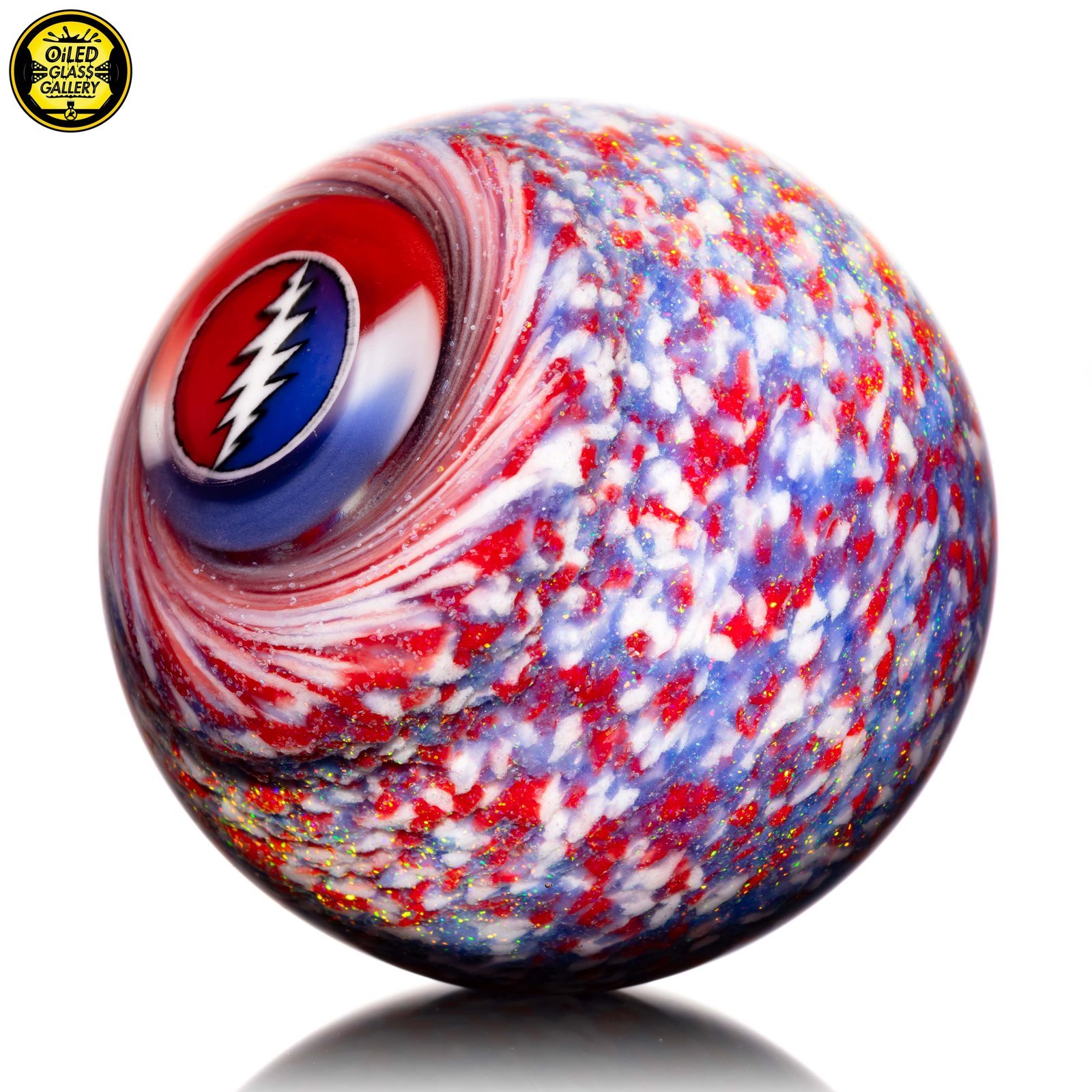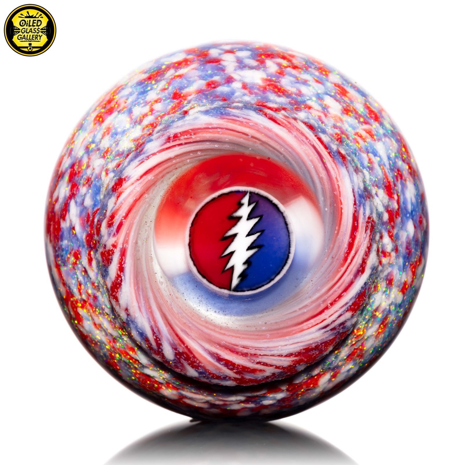 2023 70mm/2.75in Grateful Dead Red, White & Blue Frit with Crushed Opal Millefiori Marble featuring Purdy’s colorfade sections on both ends with a Lightning Bolt millefiori on one side and an encased Bear opal on the other.