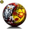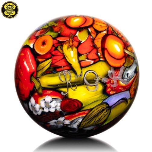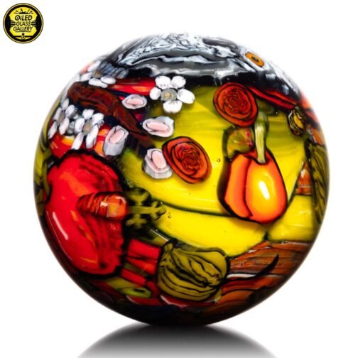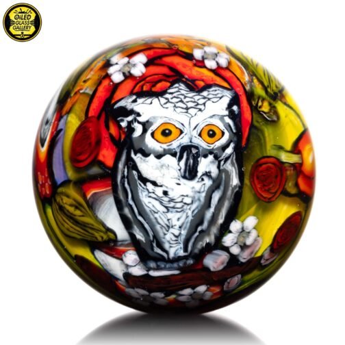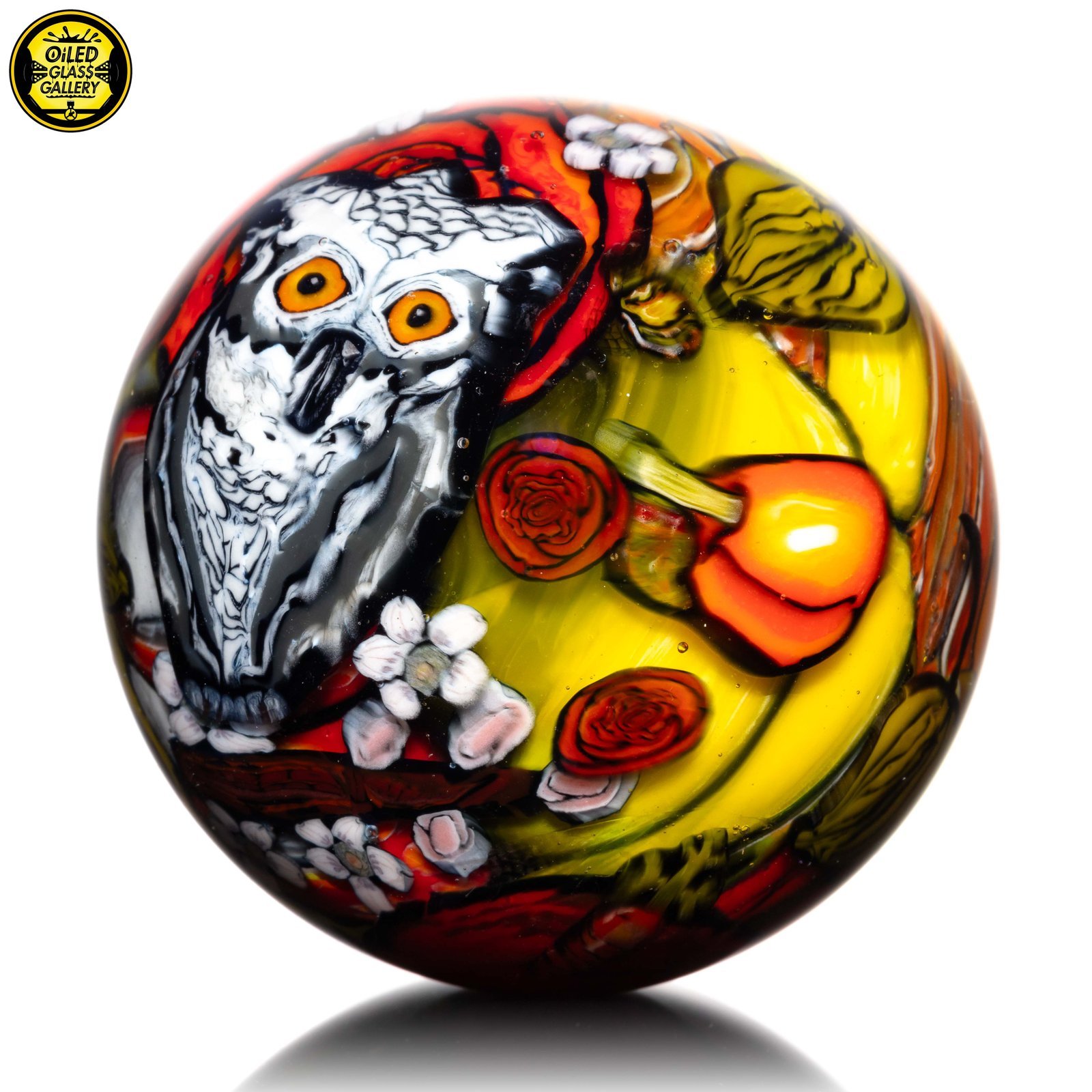 2023 52mm/2.05in Harvest Owl Murrine Marble featuring a Great Snowy Owl millefiori over multiple layers of Robert’s Harvest millefiori.