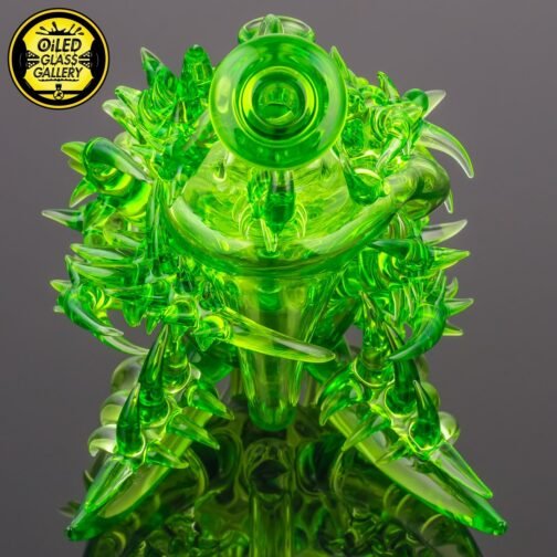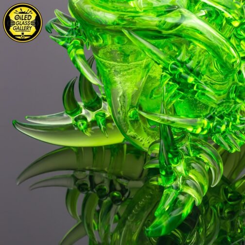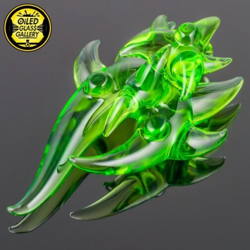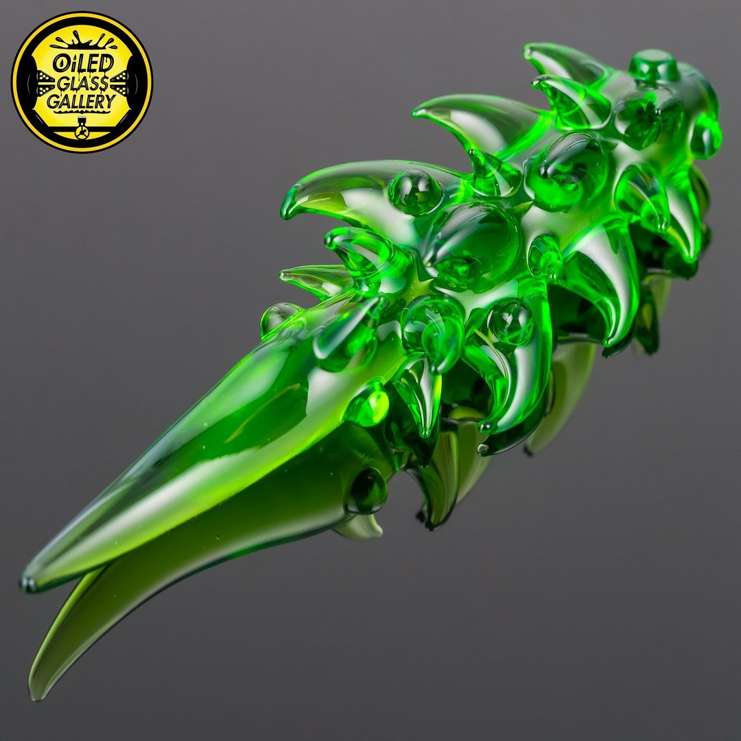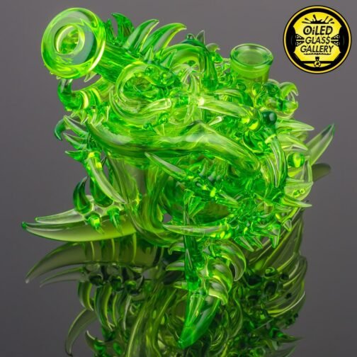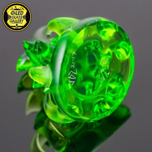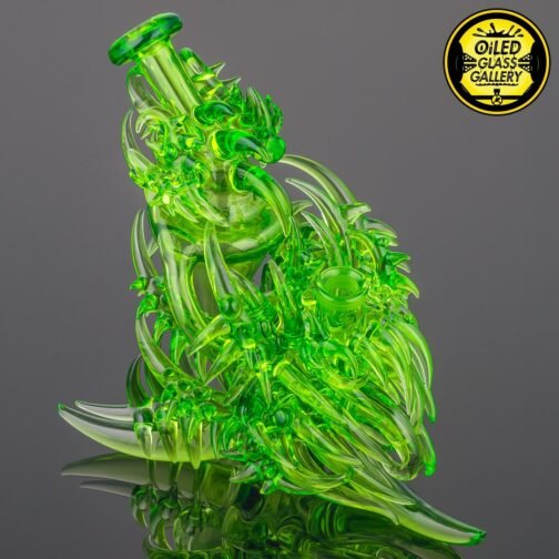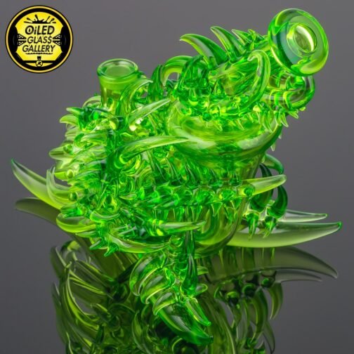 2017 14mm 8in Horned Ball Tornado Recycler derived from the Claw series, This is John’s 1st solo recycler built in Glass Alchemy’s Crippy Green representing abstract views on nature titled “Jungle Jam.” This piece has a 3-hole jet perc that also comes with a matching pendant, a matching flat carb cap, and a matching dabber, all shipped in a Pelican Case.