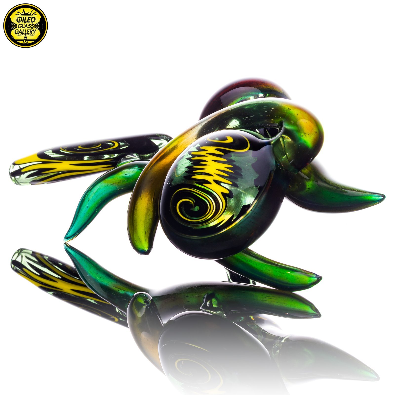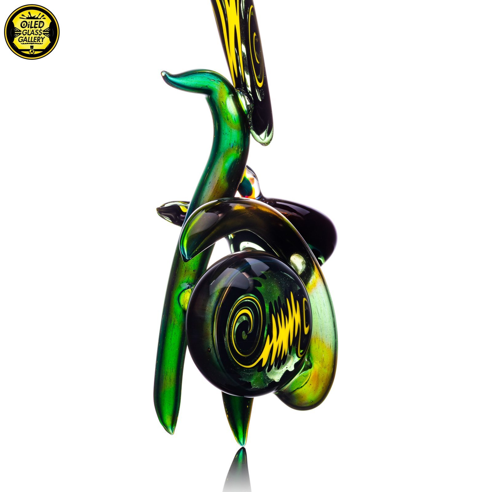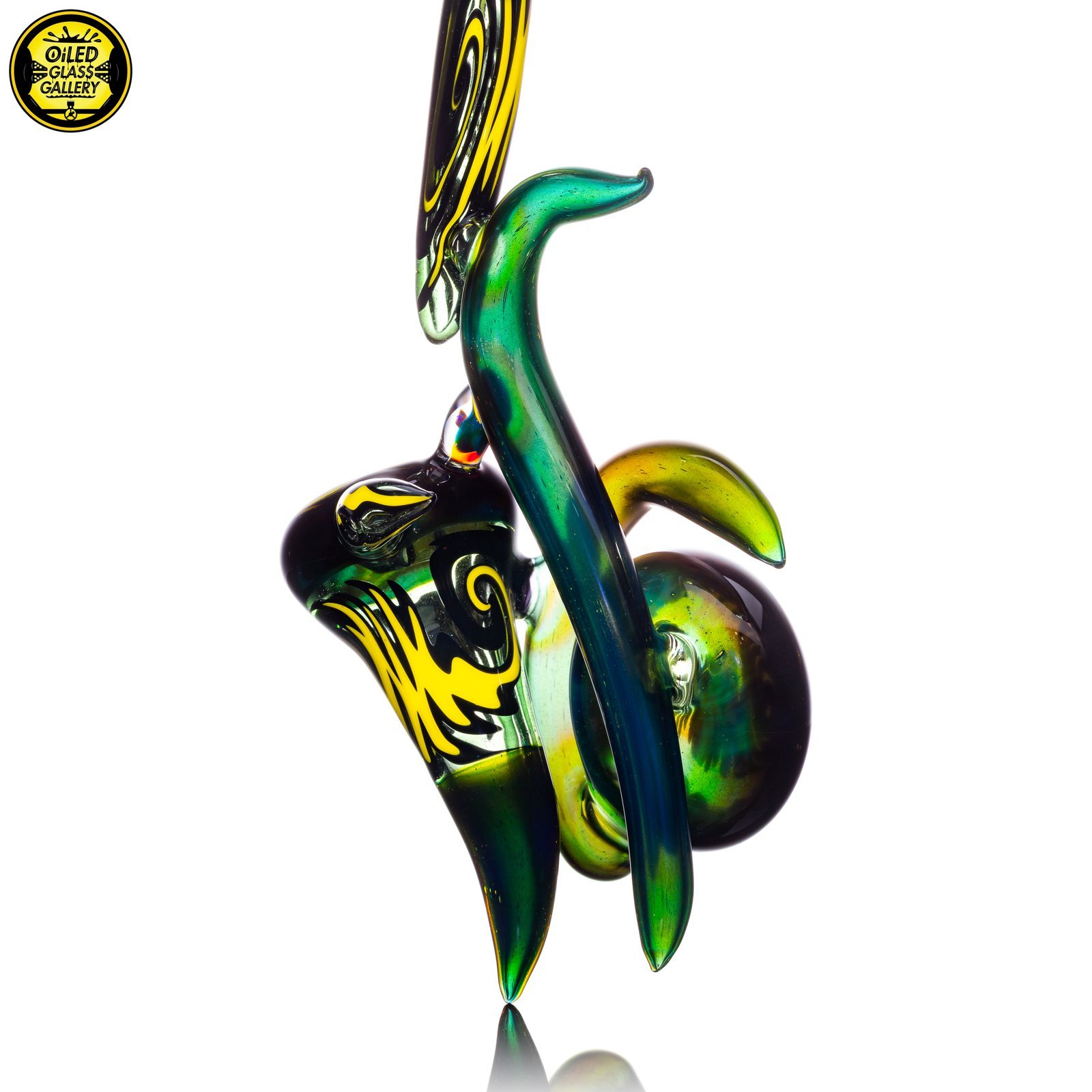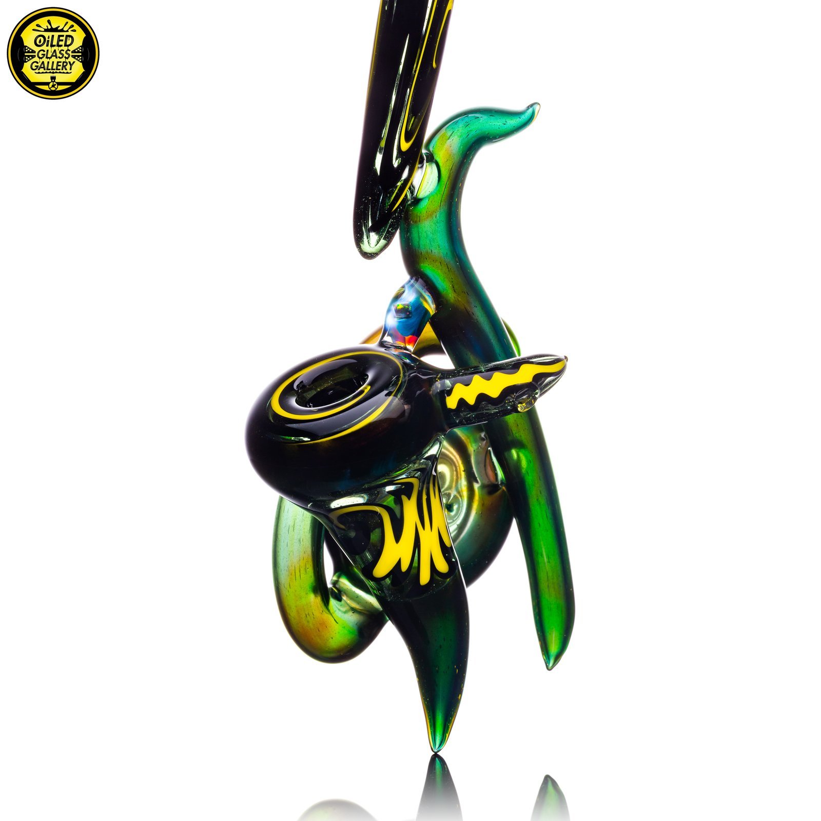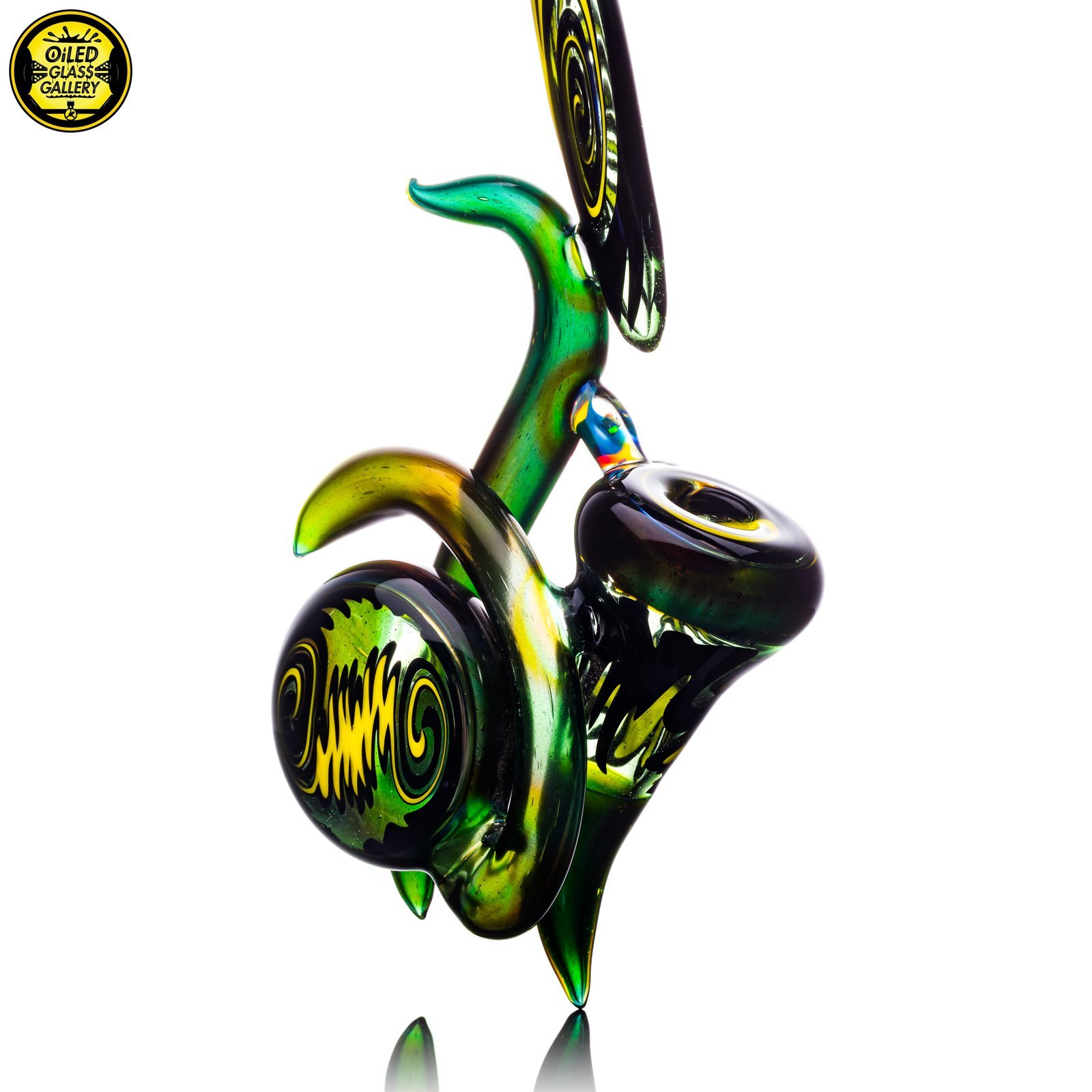 2021 7.5in Horned Sherlock pipe made of Northstar Glass Alien Tech and Black & Yellow wig wag sections featuring an encased opal bridge.