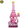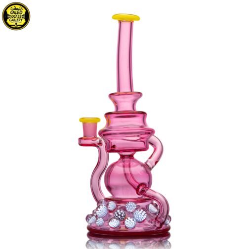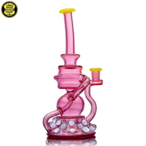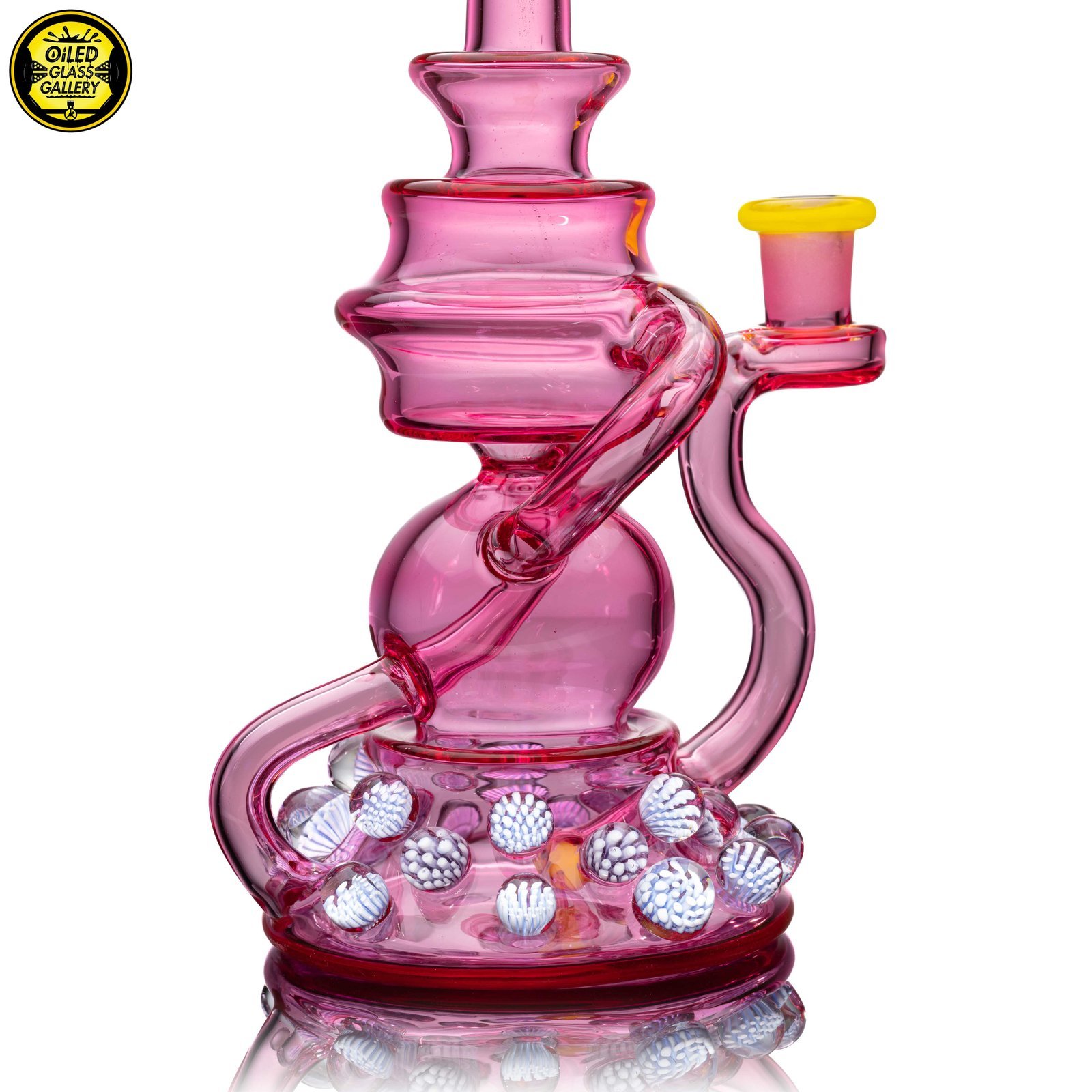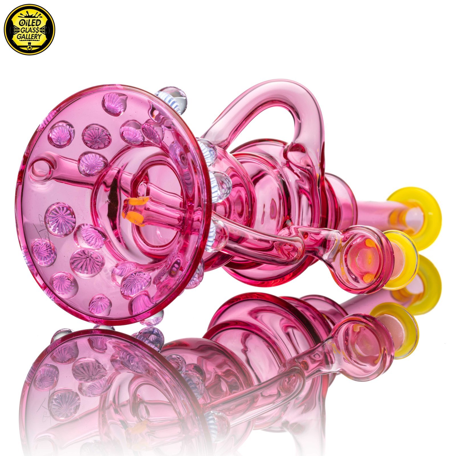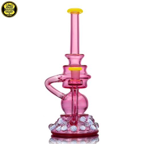 2022 10mm 7.75in Klein recycler made of Molten Aura Gold Ruby and Northstar Glass Canary highlights with 24 dot implosion mibs mounted on the base. Comes shipped in a Pelican case.