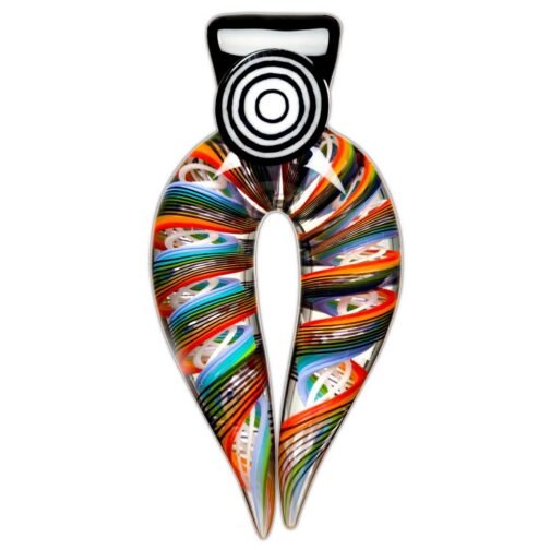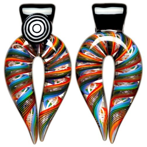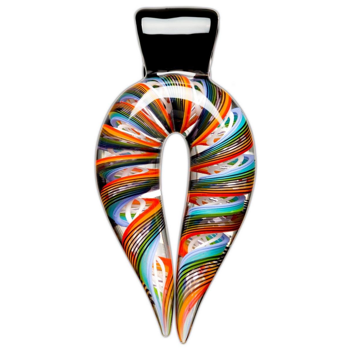 2016 1 of 6 Triple Layered Latticino Black over Rainbow over White Rainbro cane by N3rdglass molded into horn pendants with a gorgeous Kaj Beck millefiori attachment.