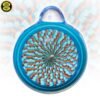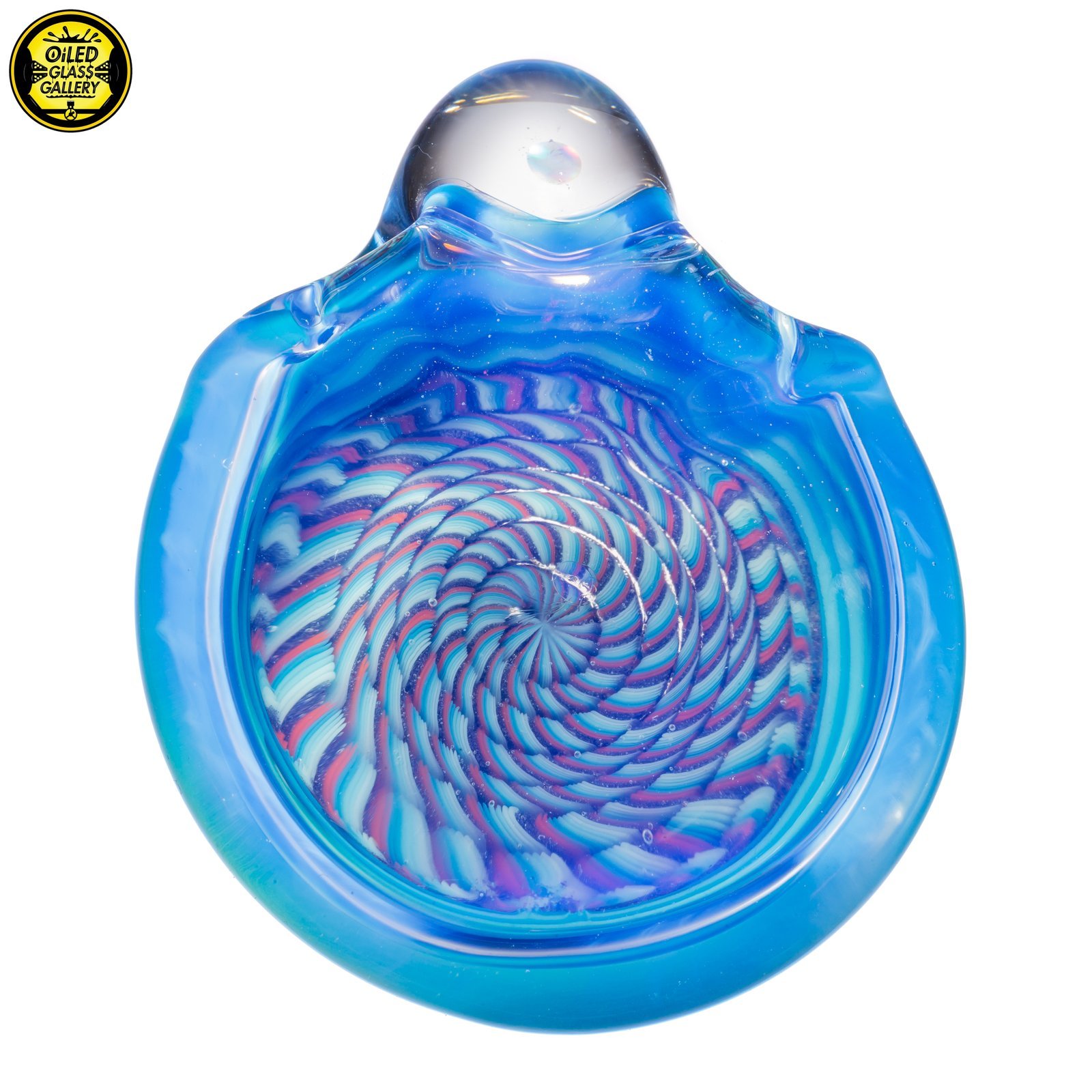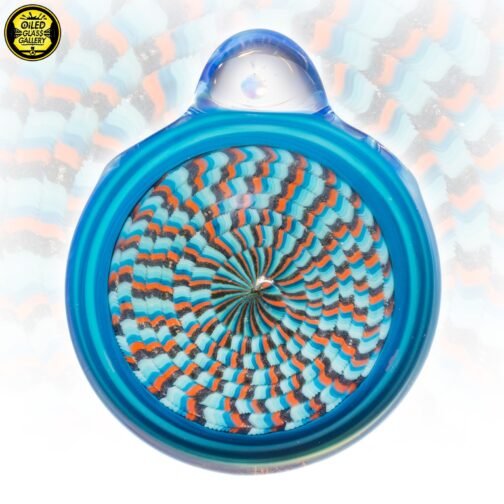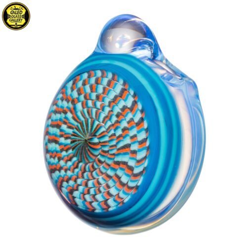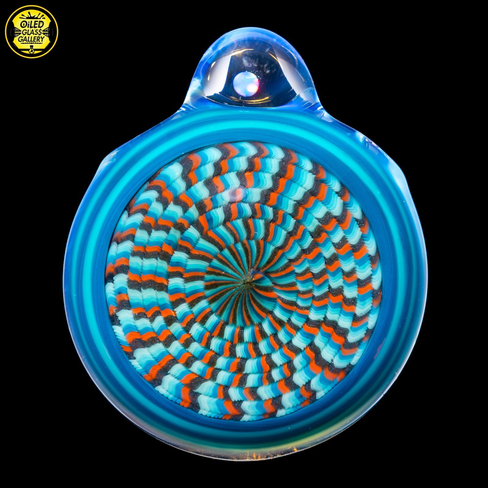 2021 1.5in Latticino Twistcane & Glass Alchemy Moonstone backed hollow disc pendant featuring an encased opal on top.