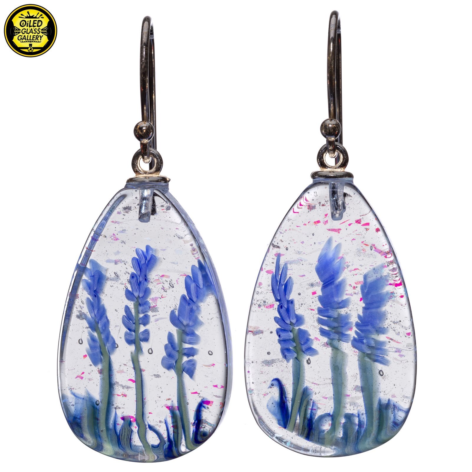 2020 1in x .75in Tide Pool Millefiori earrings. He first makes each component on the torch as an individual cane, known as a murrini, which are “pictures in glass.” He then slices and polishes each murrini cane to meld the slices of design into the molten glass Millefiori pattern. He then fumes 24k gold and .999 silver onto the back of the glass to add color, reflectivity and dimension. Dark cobalt blue glass is the final step in assembling the “bar” of design. Gold and Silver are finally fumed onto the back of the glass. After annealing, he hand cuts and polishes each pair of earrings which are then mounted on sterling silver findings. There is no mechanization involved so each pair is truly one of a kind and hand made.