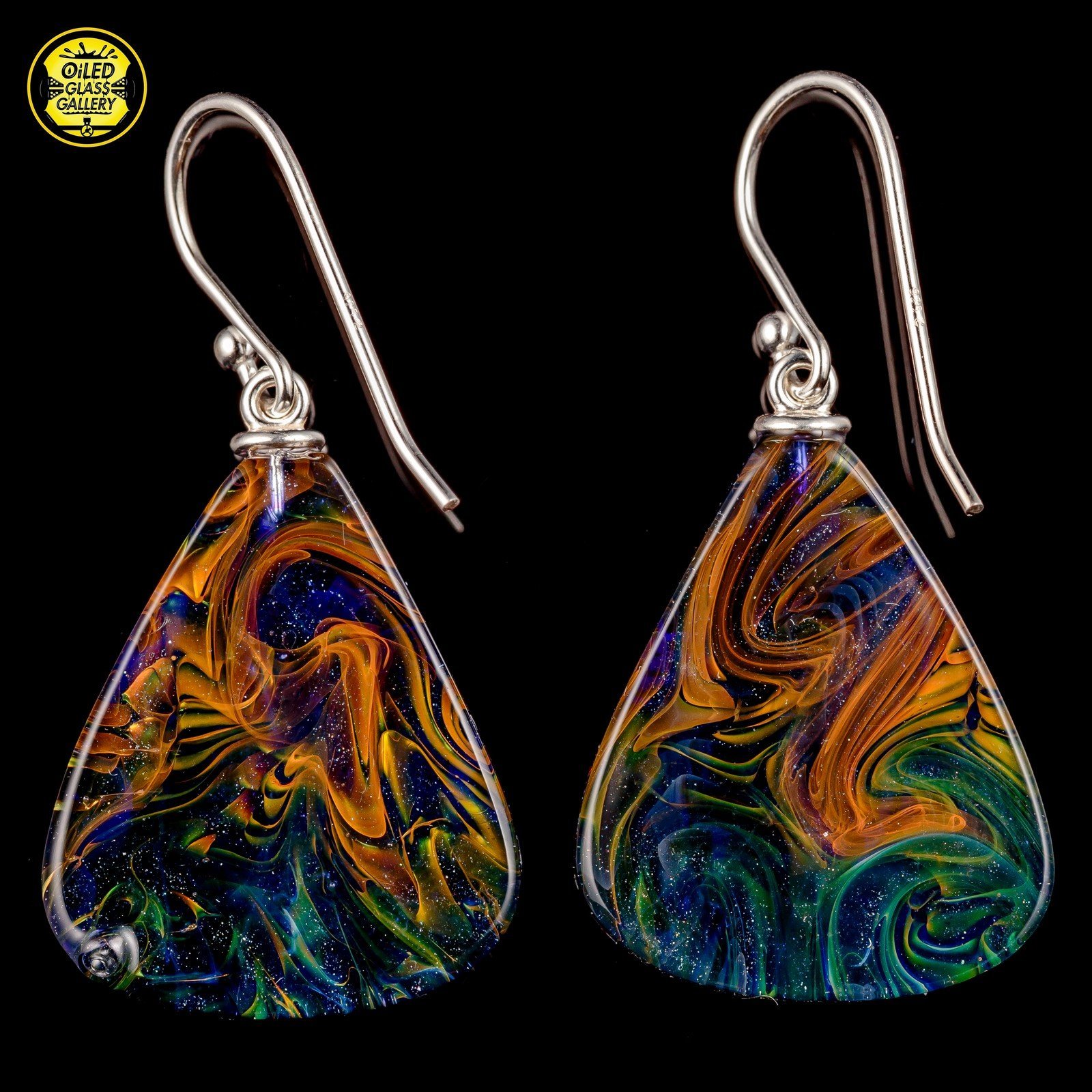 2020 1in x .75in Tide Pool Millefiori earrings. He first makes each component on the torch as an individual cane, known as a murrini, which are “pictures in glass.” He then slices and polishes each murrini cane to meld the slices of design into the molten glass Millefiori pattern. He then fumes 24k gold and .999 silver onto the back of the glass to add color, reflectivity and dimension. Dark cobalt blue glass is the final step in assembling the “bar” of design. Gold and Silver are finally fumed onto the back of the glass. After annealing, he hand cuts and polishes each pair of earrings which are then mounted on sterling silver findings. There is no mechanization involved so each pair is truly one of a kind and hand made.