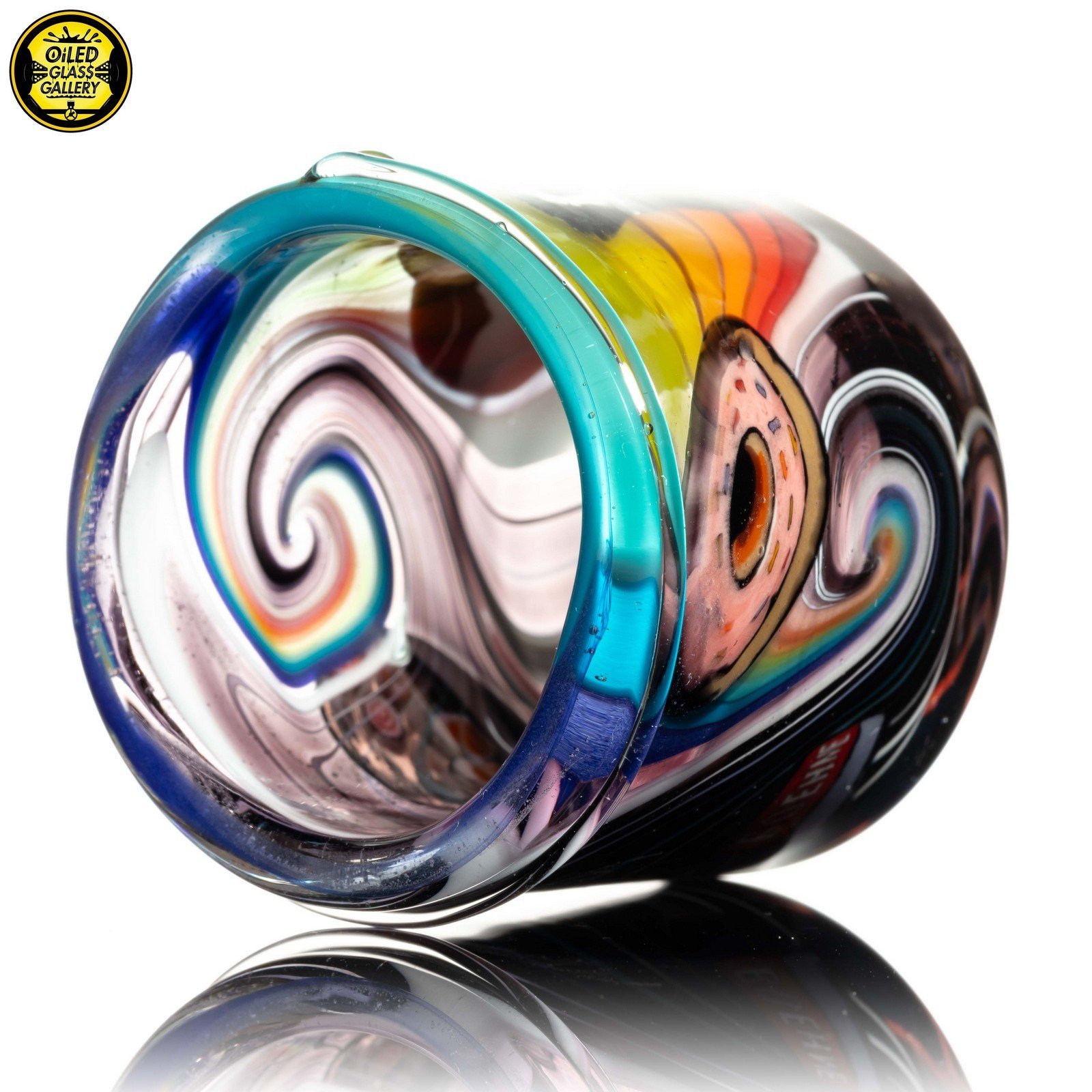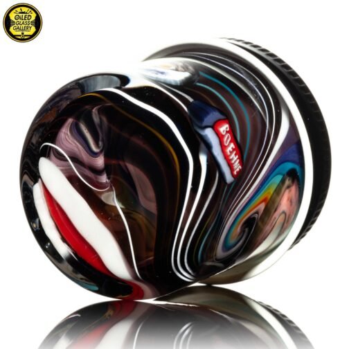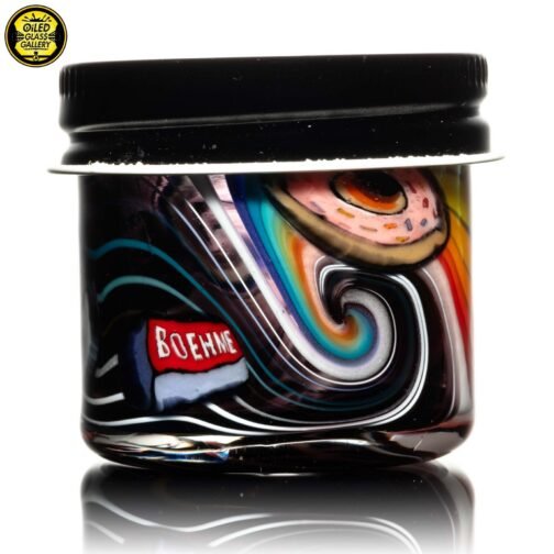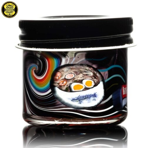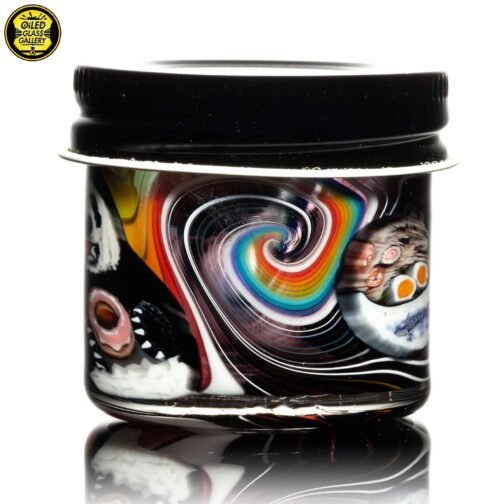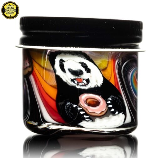 2023 1.75in 14g Black, White & Rainbow Spiral linework Panda with Donut millefiori jar. Features a panda with donut millefiori, a donut millefiori, a Ramen millefiori, a Boehme signature millefiori and comes in a cloth pouch.