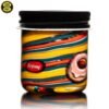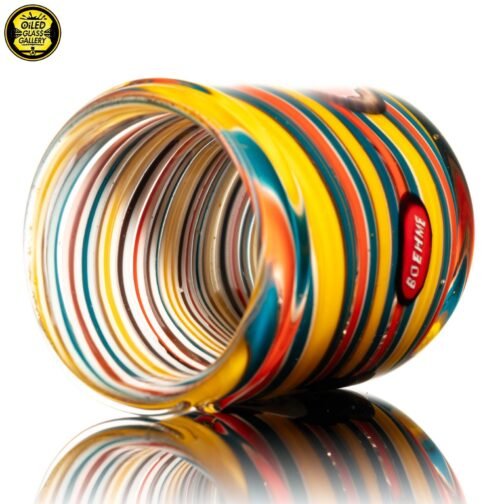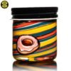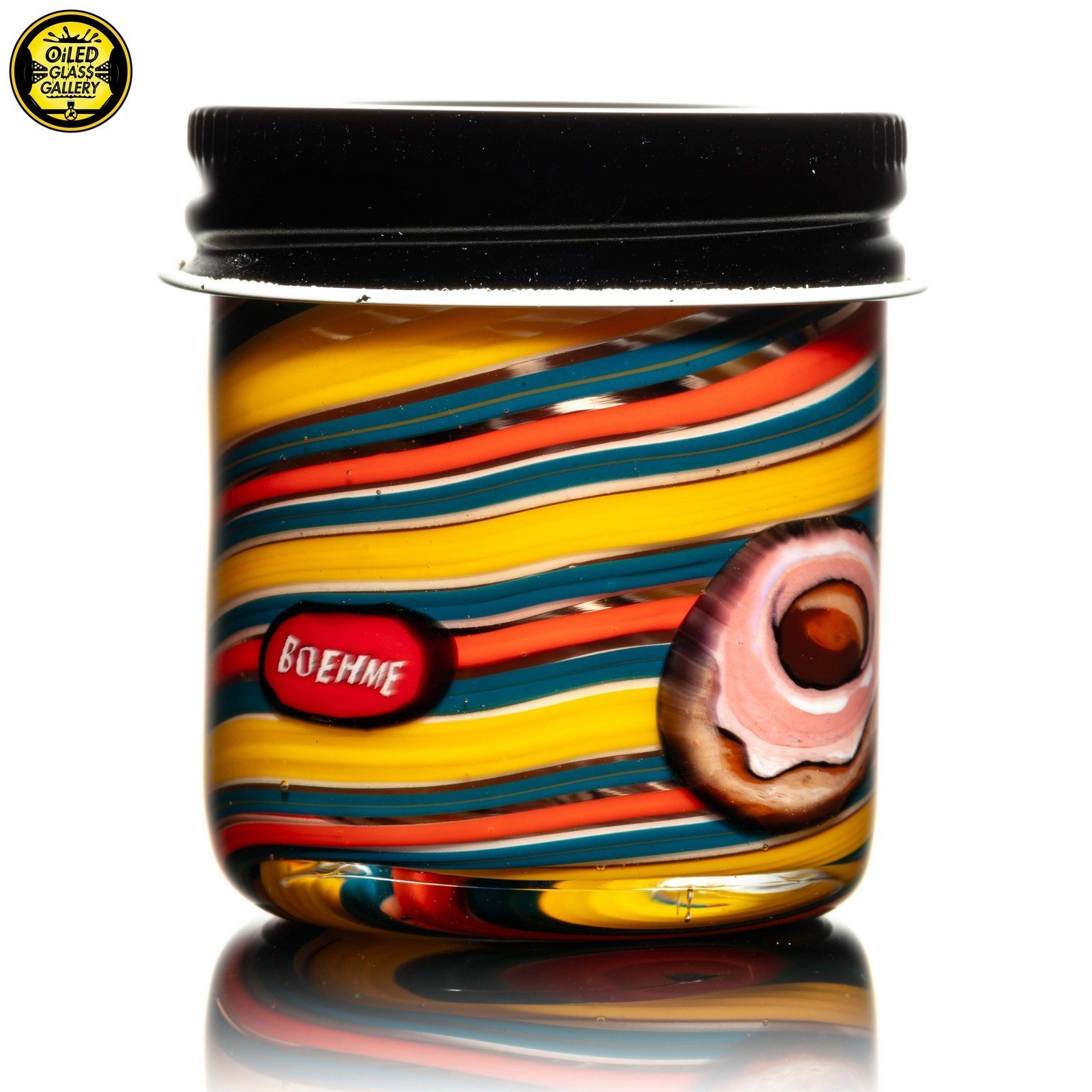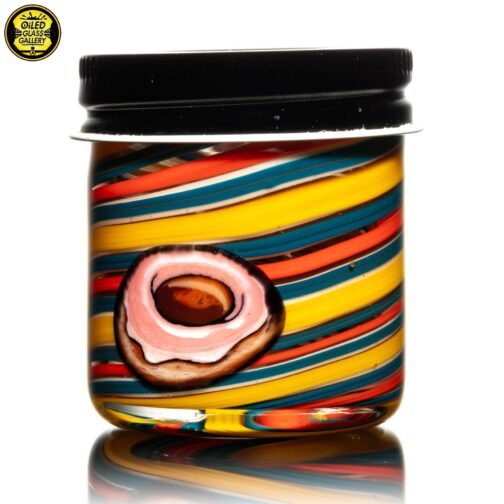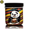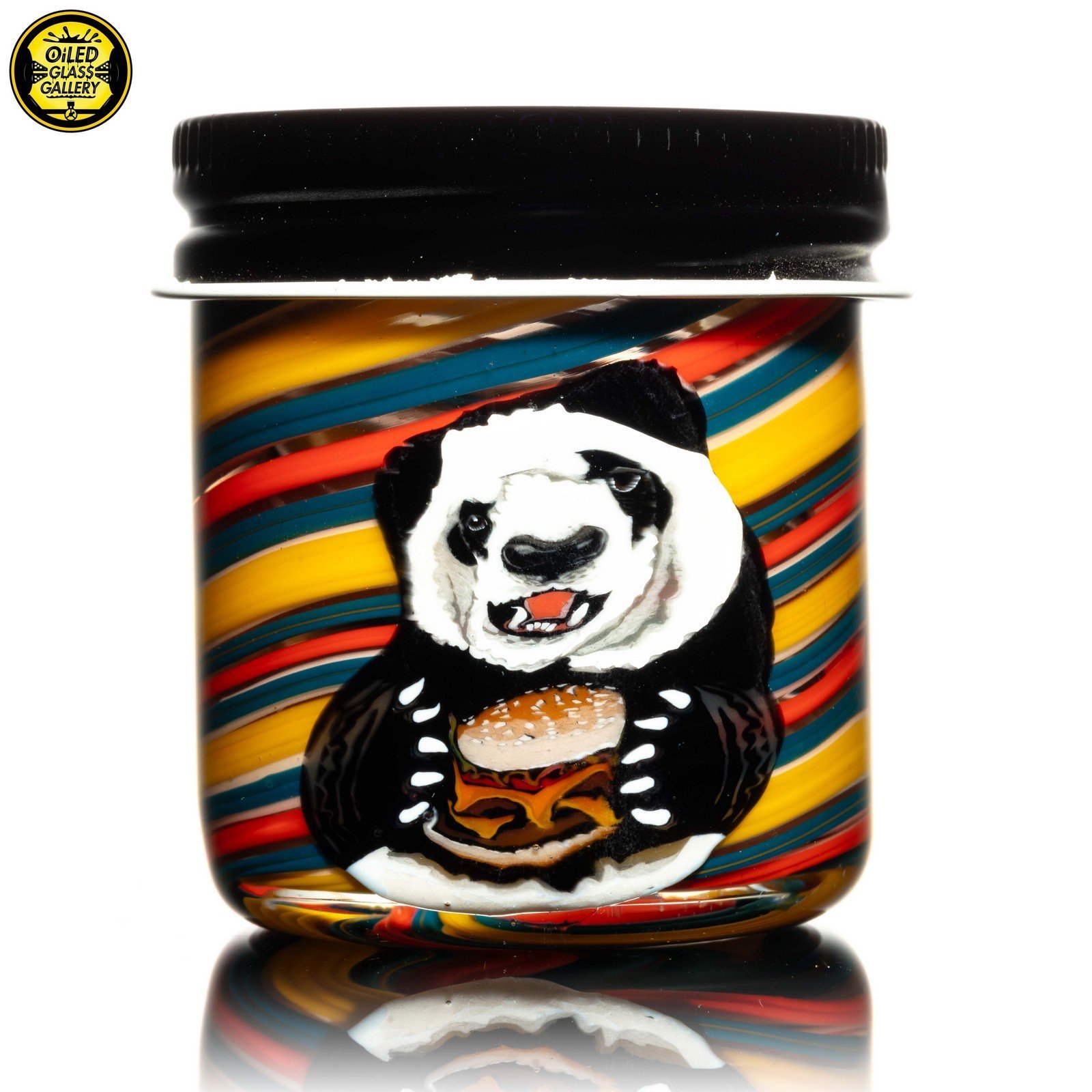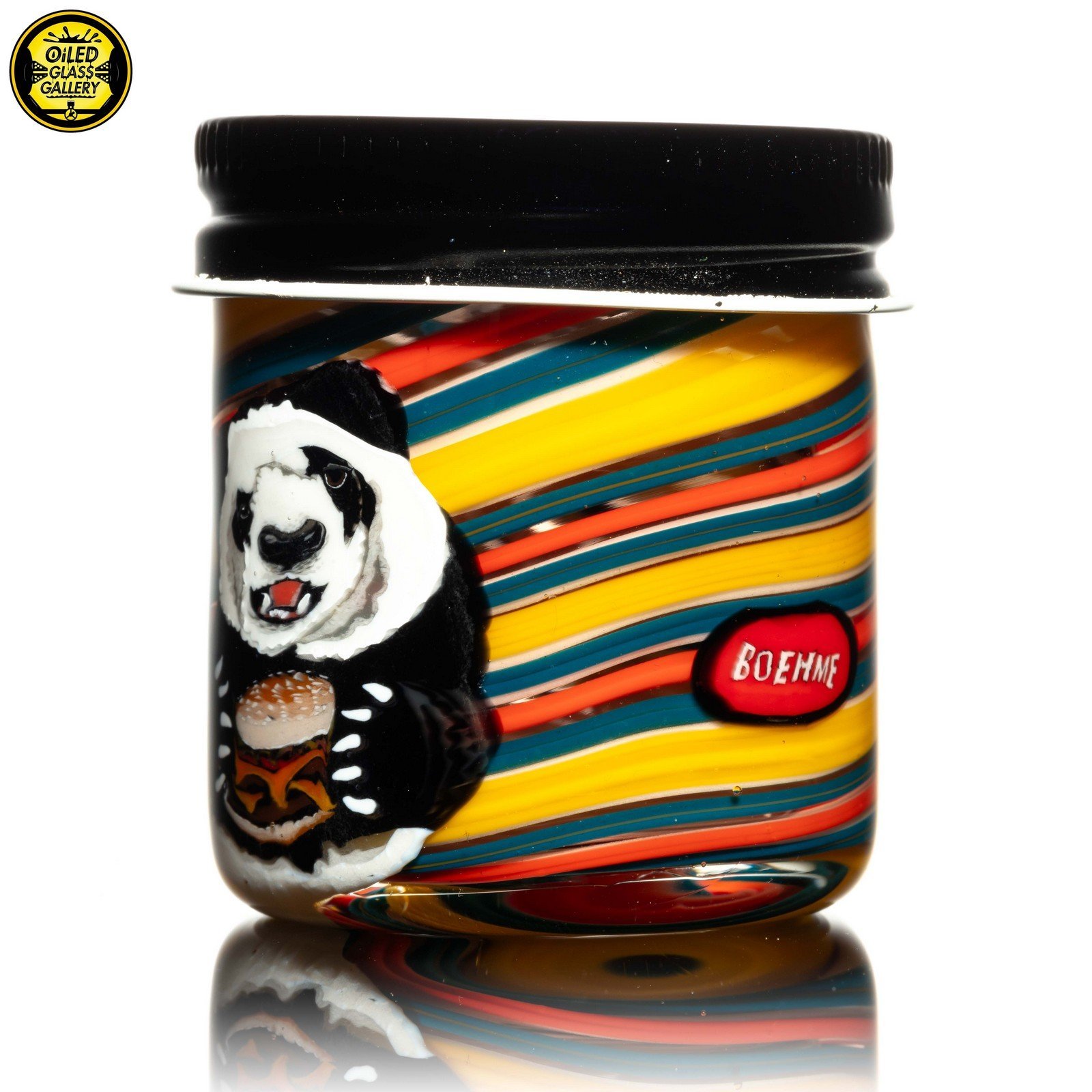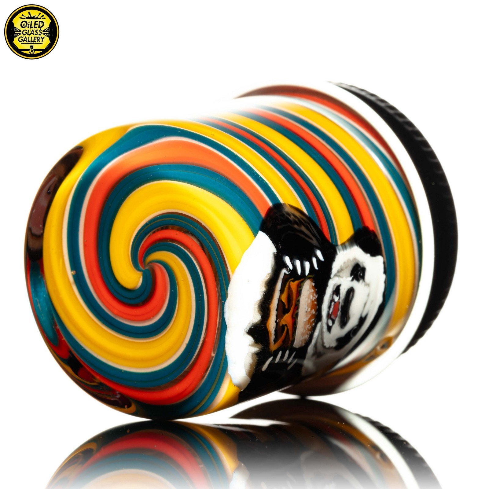 2023 2in 21g Blue, Orange, & Yellow Spiral linework Panda with Hamburger millefiori jar. Features a panda with hamburger millefiori, a donut millefiori, a Boehme signature millefiori and comes in a cloth pouch.