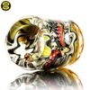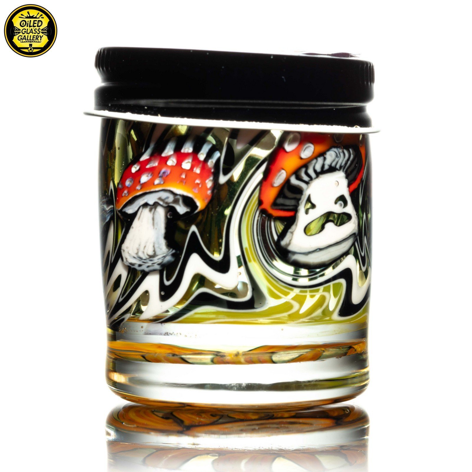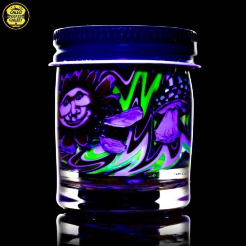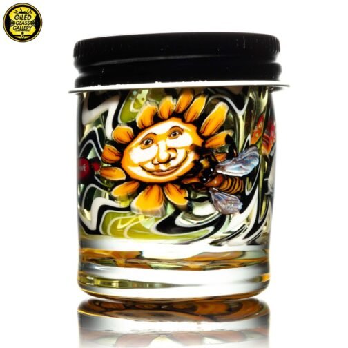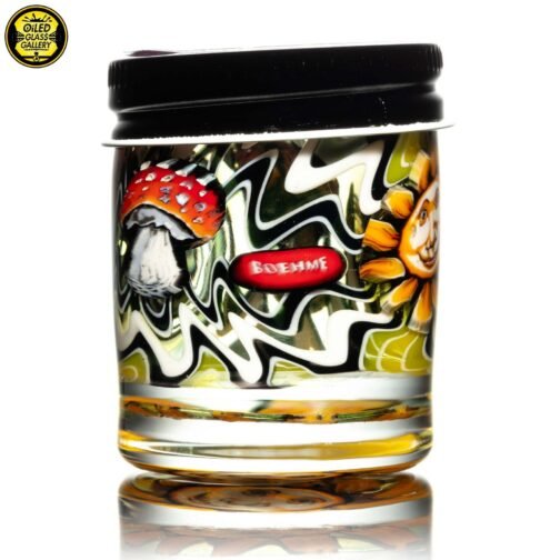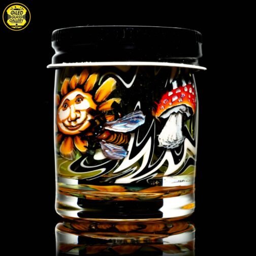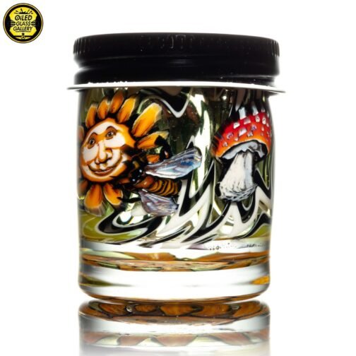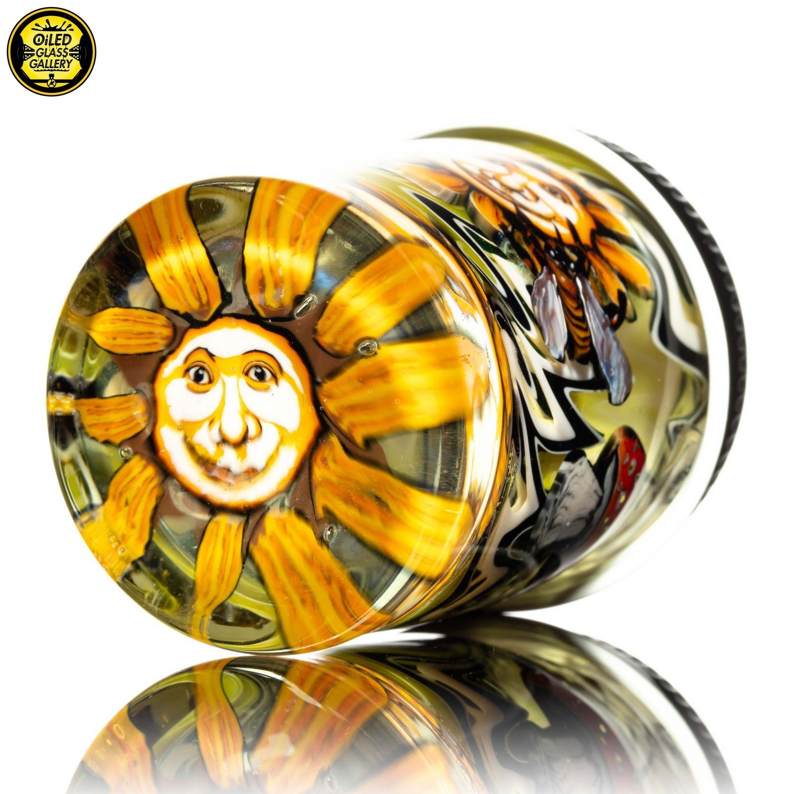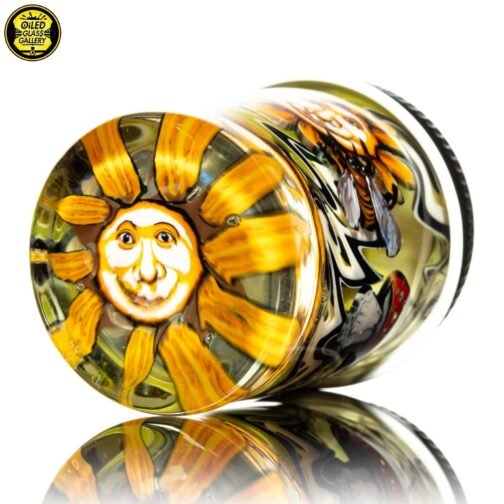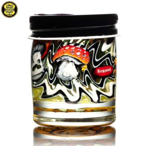 2023 2.25in 28g UV Chartreuse, Black & White ReWig linework Spring millefiori jar. Features 3 mushroom millefiori, 2 sunflower face millefiori, a bee millefiori, a Boehme signature millefiori and comes in a cloth pouch.