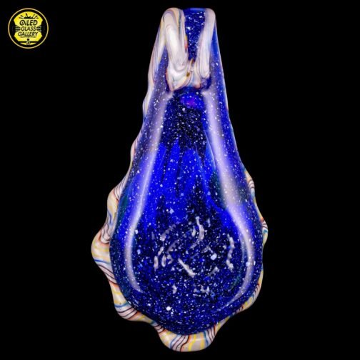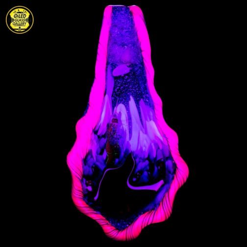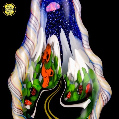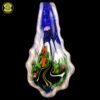 2018 2.5in x 1.25in x .75in Bearly Road Trippin Pendant #1. This piece features millefiori from Madmillies – Beth James, Ian Michael, Golden Gate Glassworks, a tumbled opal by GrandpaGlass – Nate and a UV White Satin rainbow border by Greasy Glass – Ryan Sullivan.