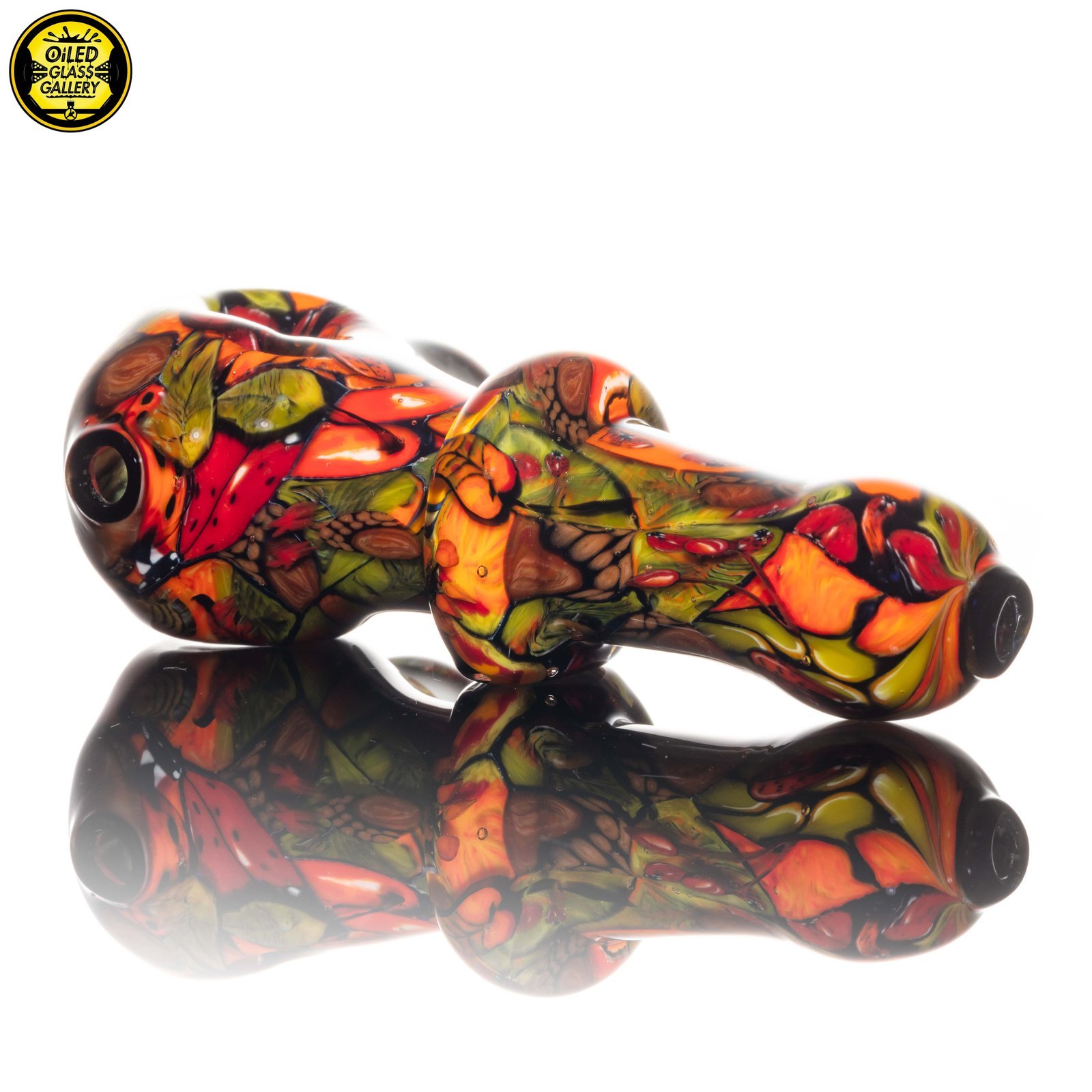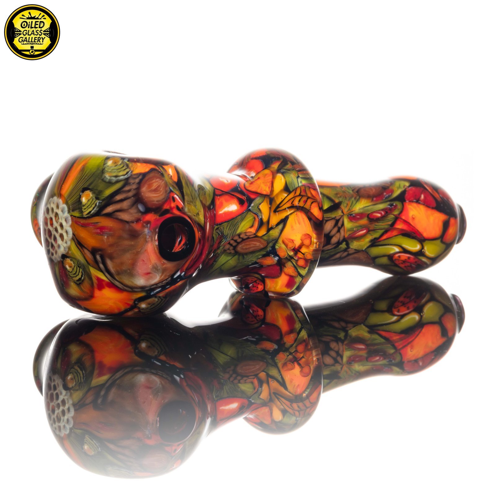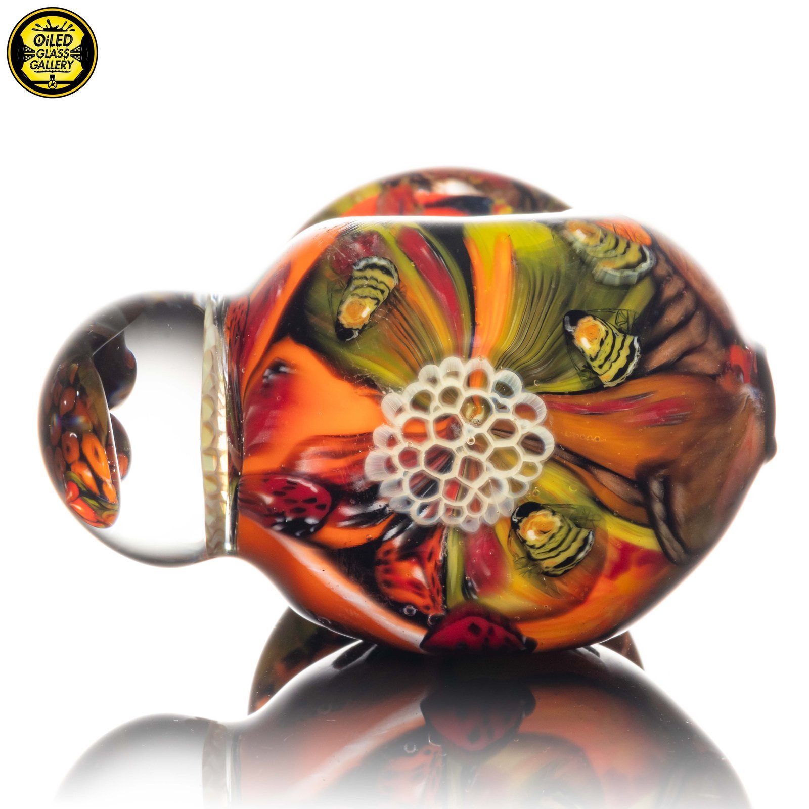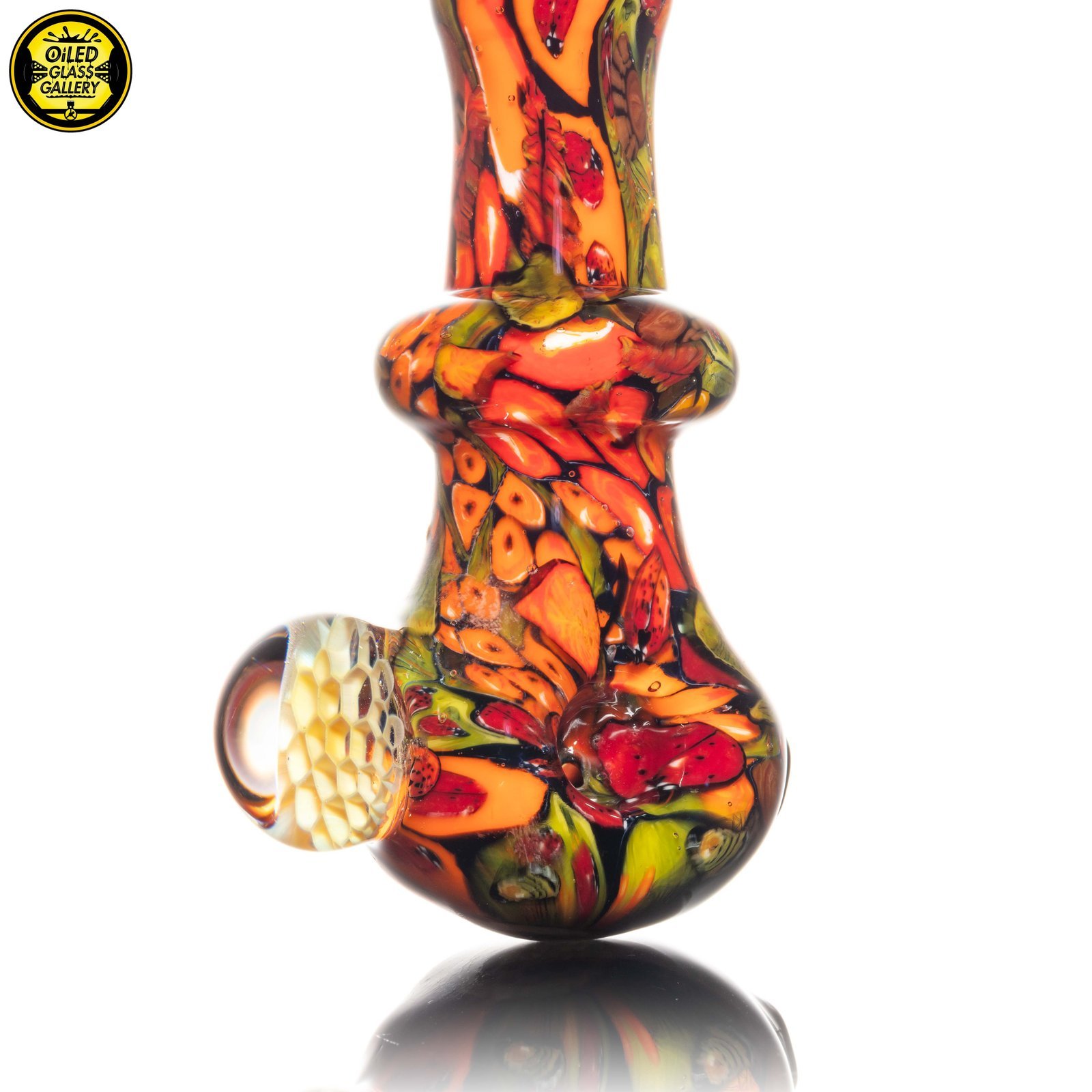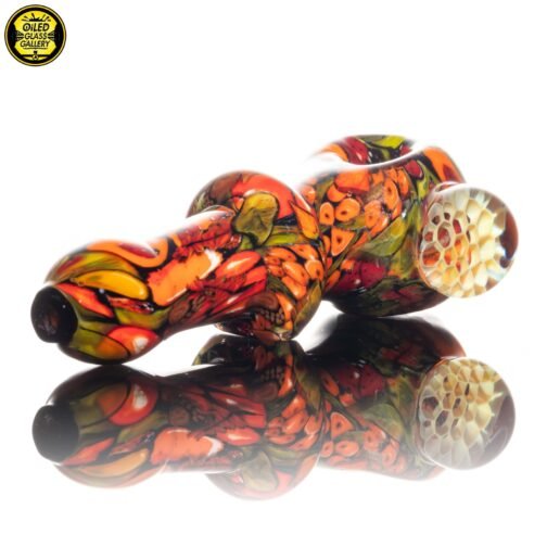 2021 4.5in “1,000 Hour Harvest” Spoon made of his signature 2020 and 2021 Harvest millefiori prep. This piece has so many details and it took over 1,000 hours to complete all of the components that went into this piece. Features an encased honeycomb millefiori mib and honeycomb millefiori on the front.