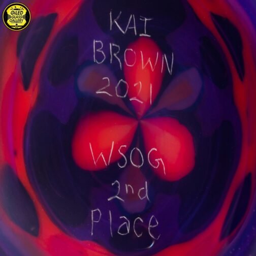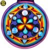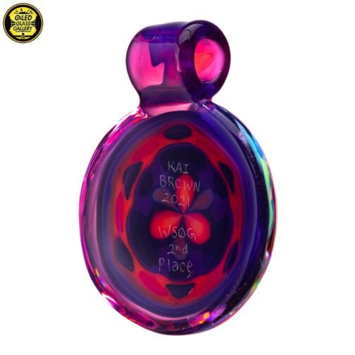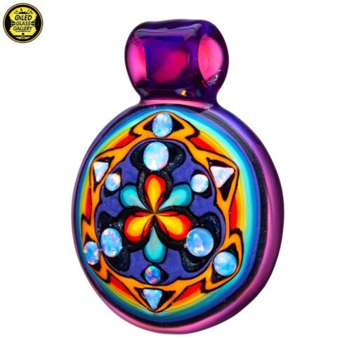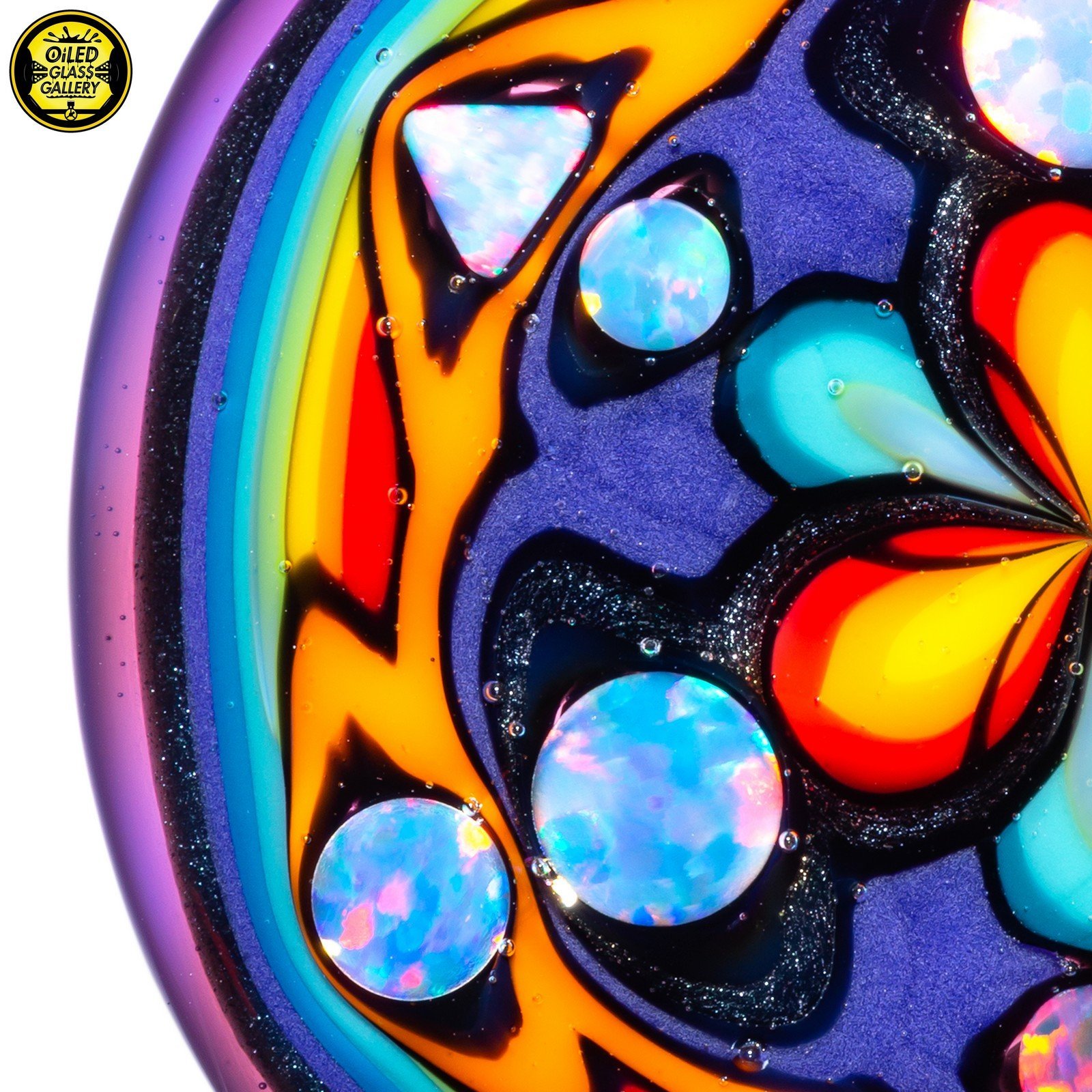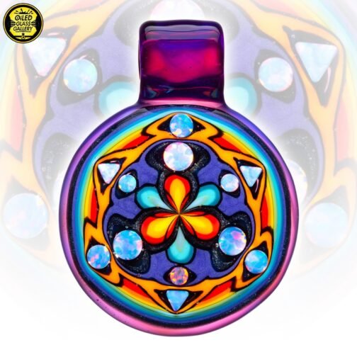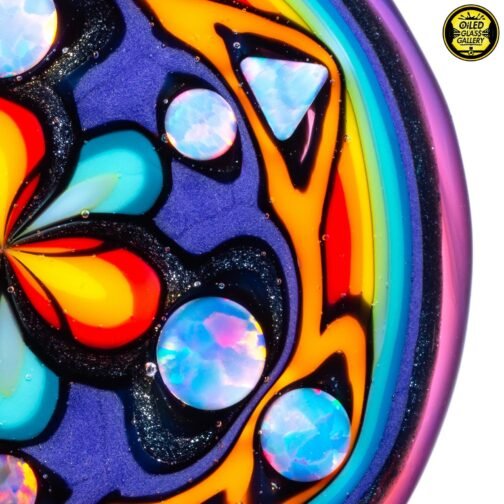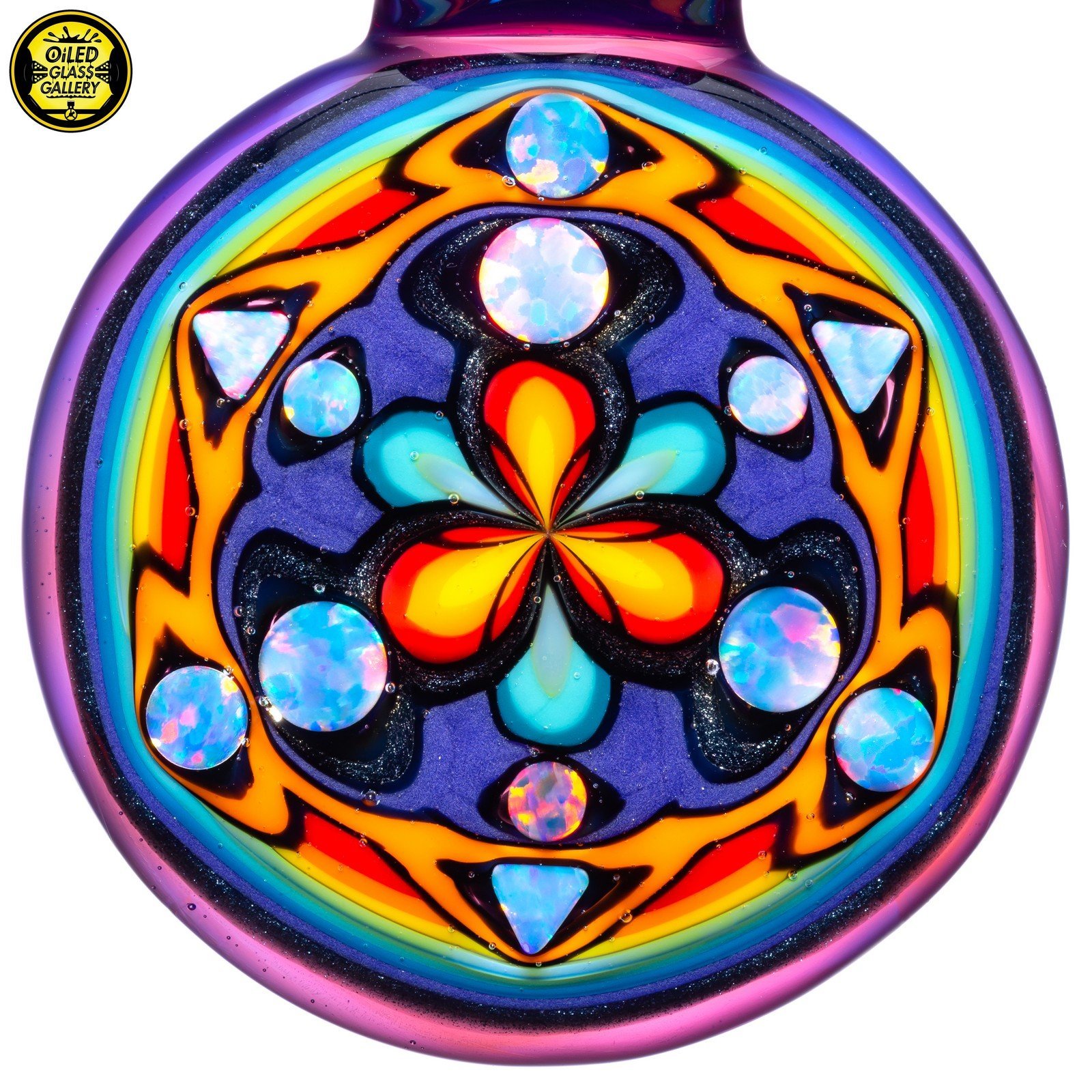 2021 1.75in x 2.25in Large Rainbow Fillacello Mandala Pendant #9 backed in Molten Aura Royal Jelly featuring 12 encased opal coins. This pendant won 2nd place in the World Series of Glass at the 2021 Glass Vegas Expo.