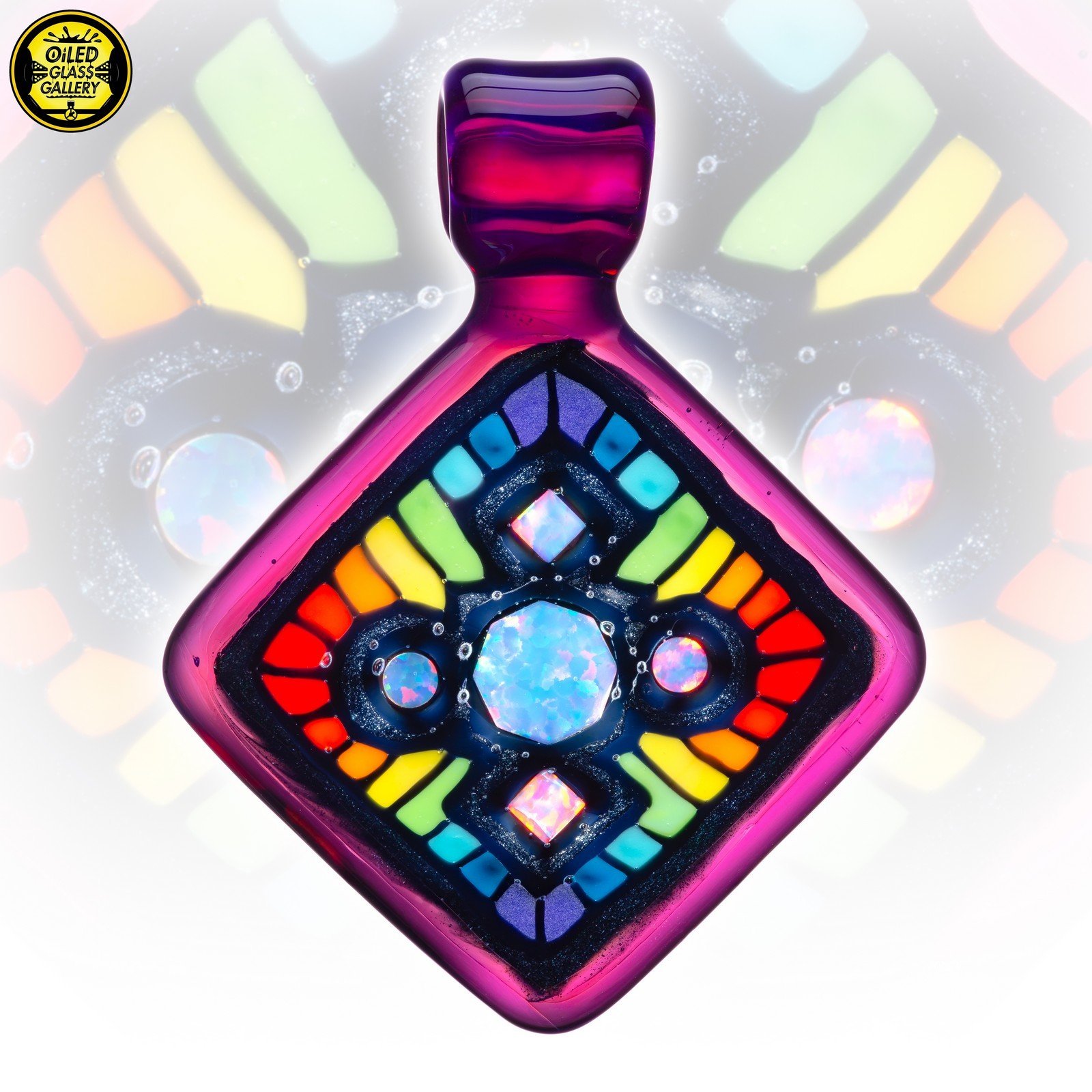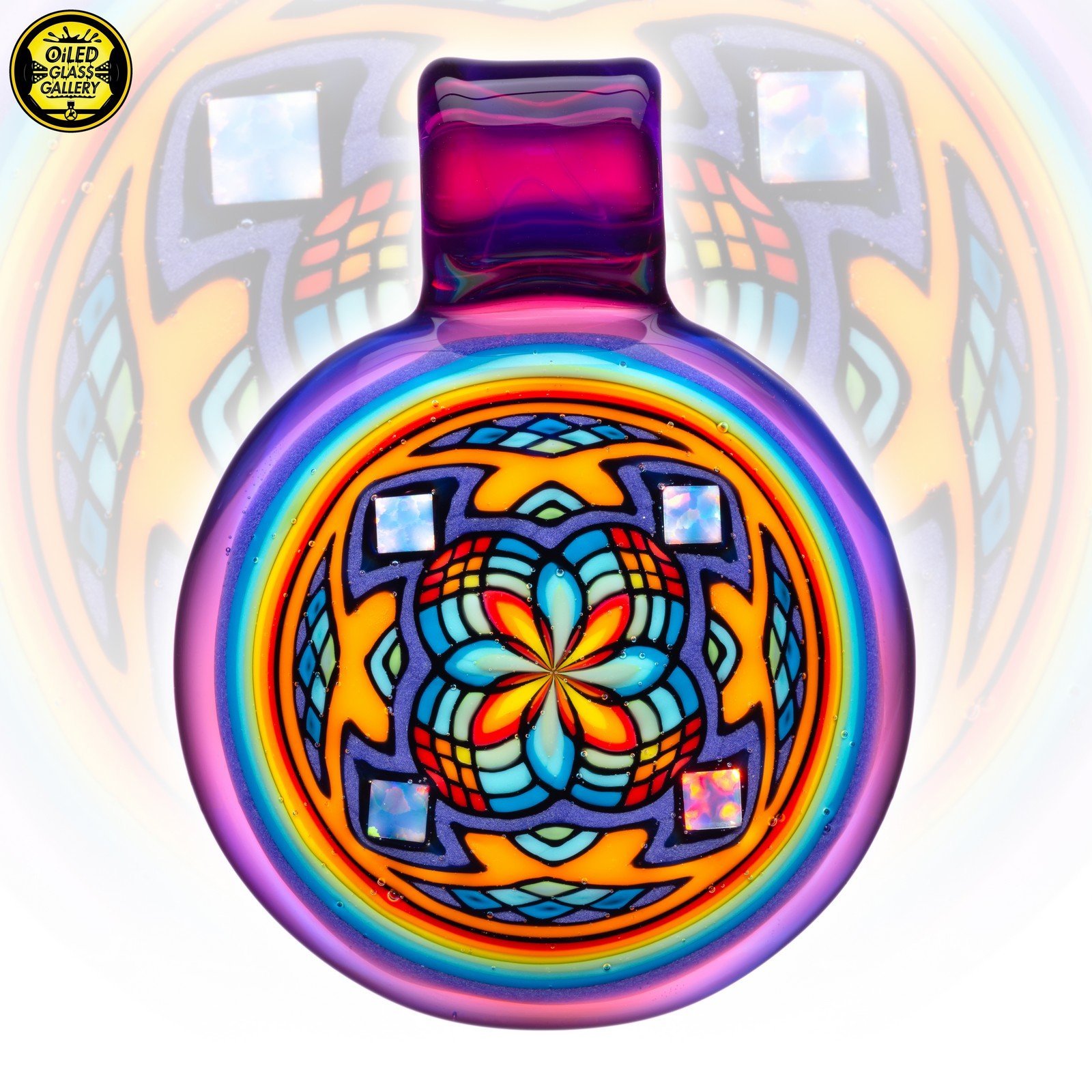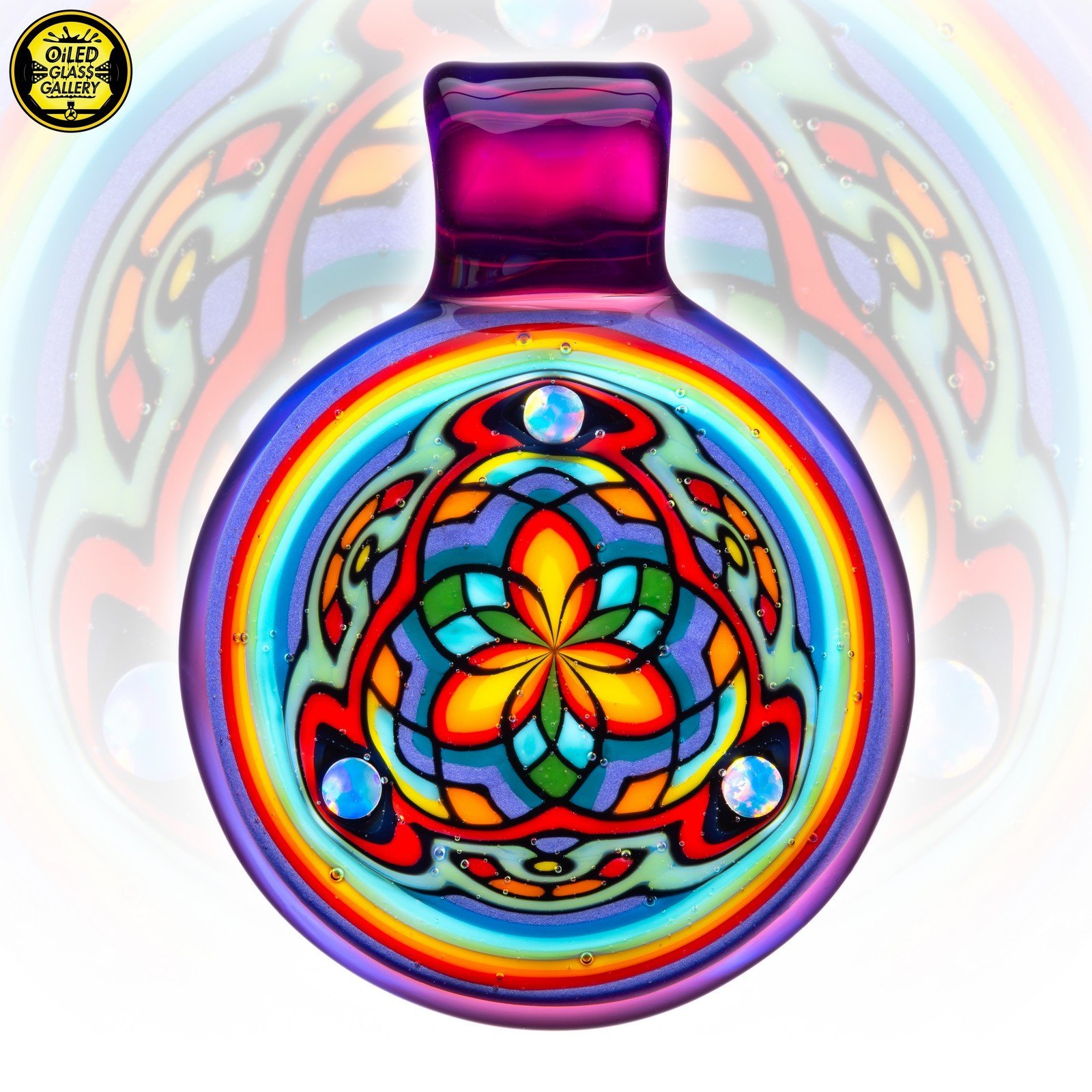 2021 1.5in x 2in Small Rainbow Fillacello Mandala Pendant #4 backed in Molten Aura Royal Jelly featuring 3 encased opal coins.