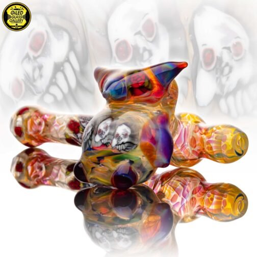 2022 6.25in Owl millefiori sidecar pipe made of Gold and Silver fumed sections featuring 24 rose & skull millefiori.