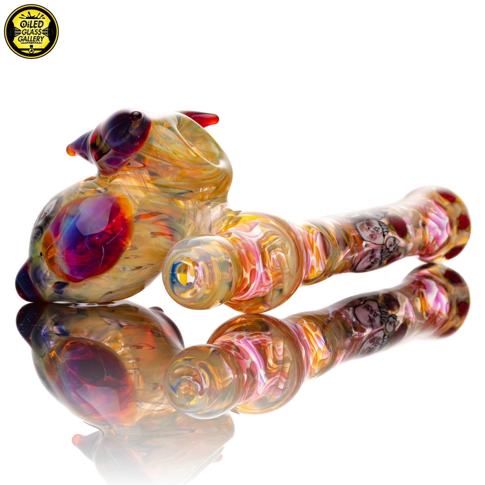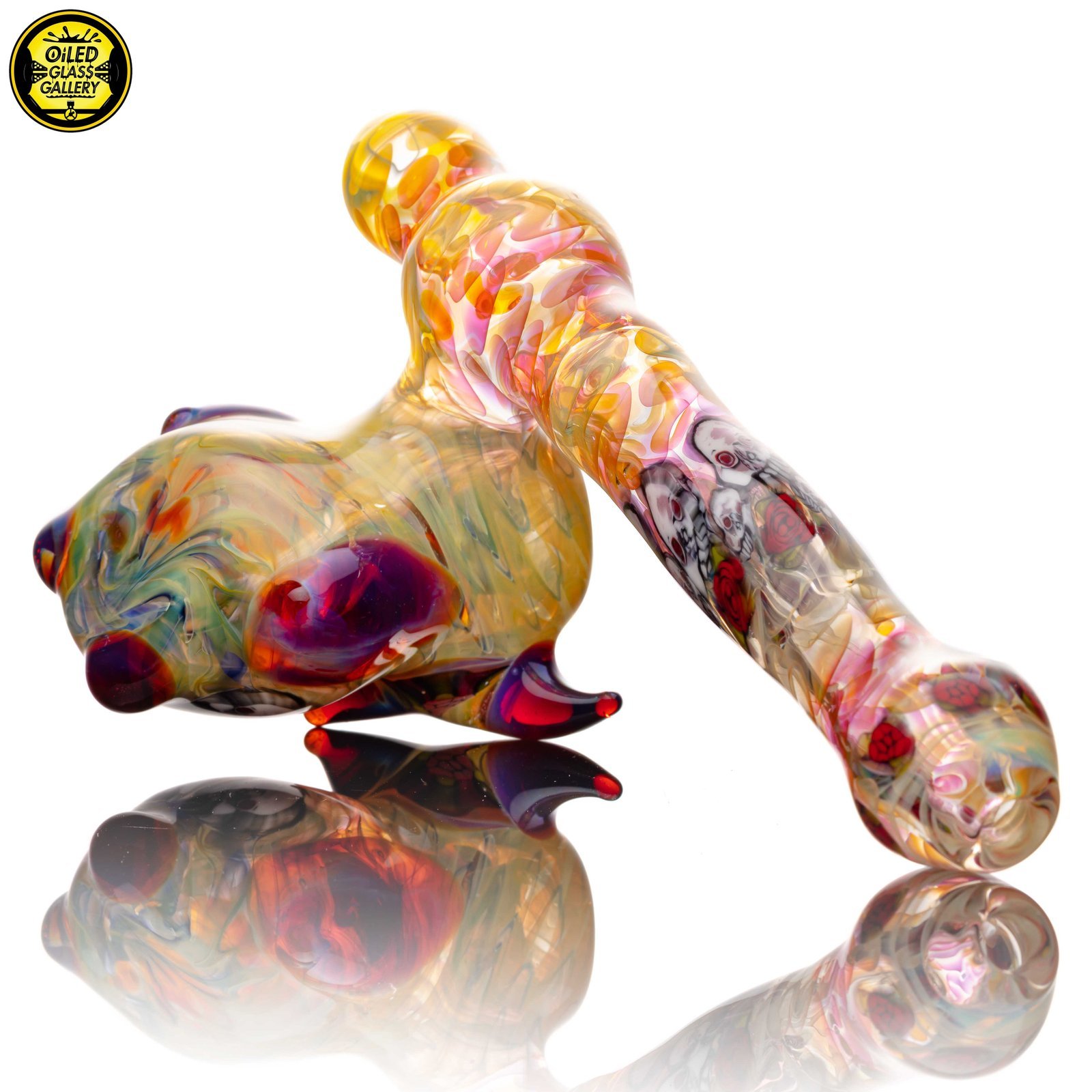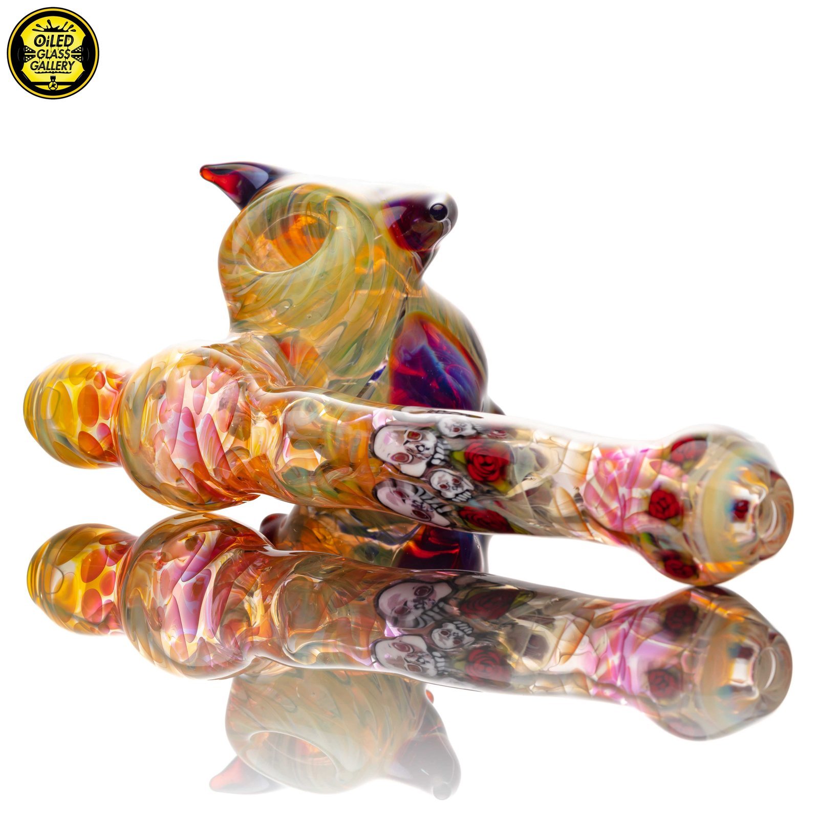2022 6.25in Owl millefiori sidecar pipe made of Gold and Silver fumed sections featuring 24 rose & skull millefiori.