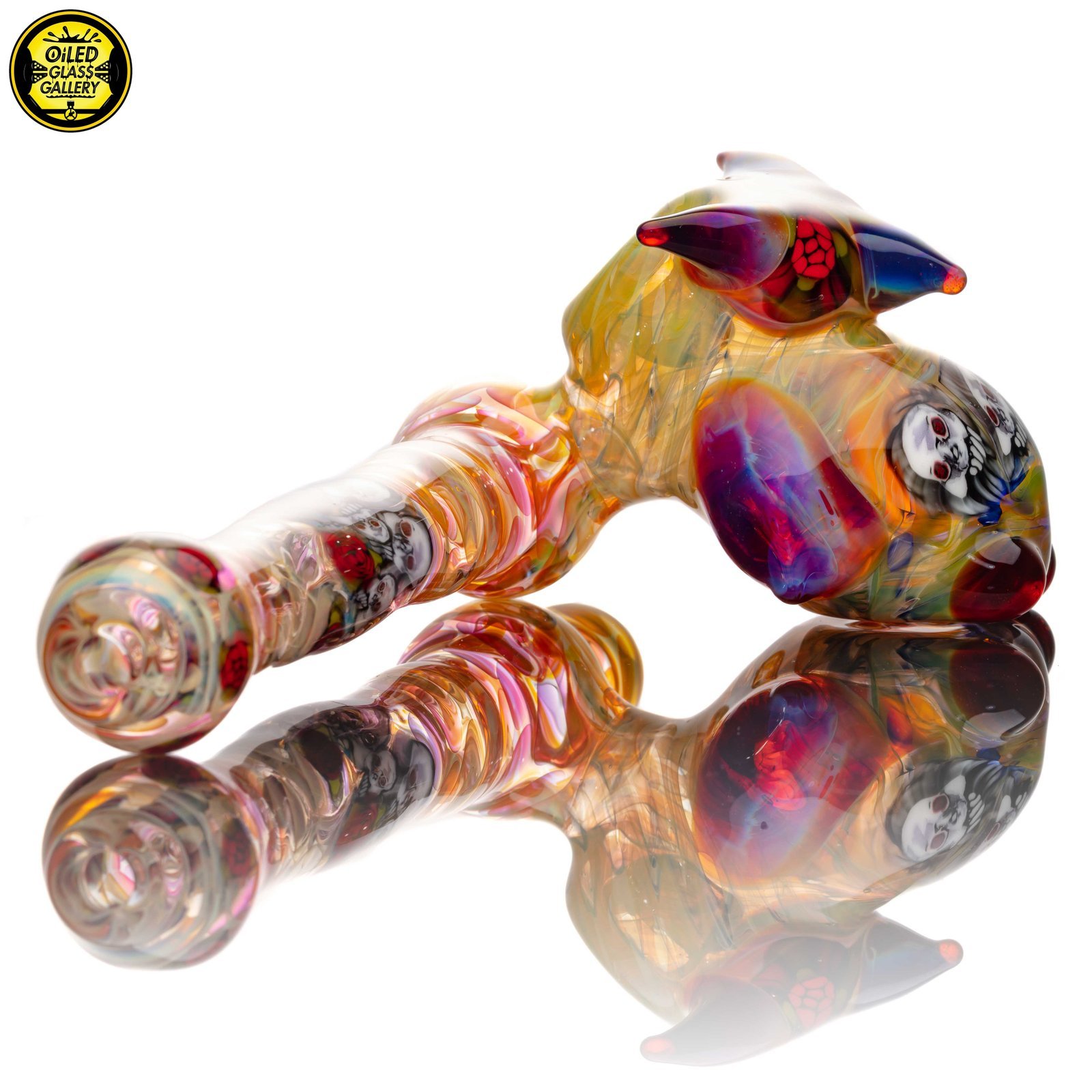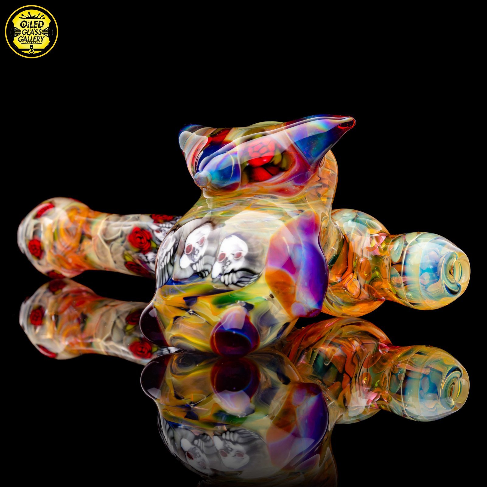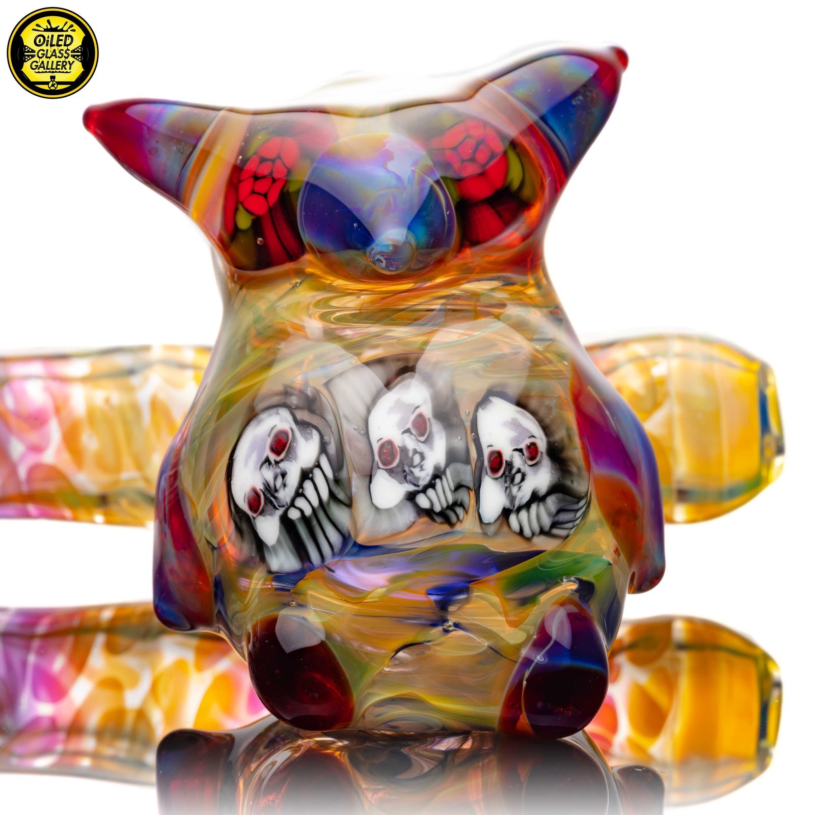 2022 6.25in Owl millefiori sidecar pipe made of Gold and Silver fumed sections featuring 24 rose & skull millefiori.