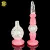 2019 4in Dabber and 30mm Bubble Cap set made of CFL crushed opal Greasy Glass Color Shifty Satin with white linework highlights. There is an encased 6mm sphere opal in the dabber and a 6mm sphere opal inside the bubble cap. Color shifts from Yellow to Pink under CFL light.