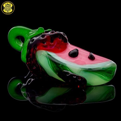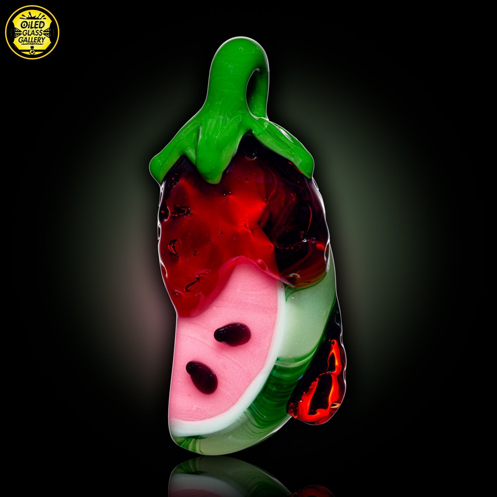 2020 2.25in x 1in Strawberry Watermelon drip pendant made of Northstar Glass Pomegranate, Glass Alchemy Experimental Green #5, Glass Alchemy Mint, Glass Alchemy Antidote, and Origin Glass Blush.
