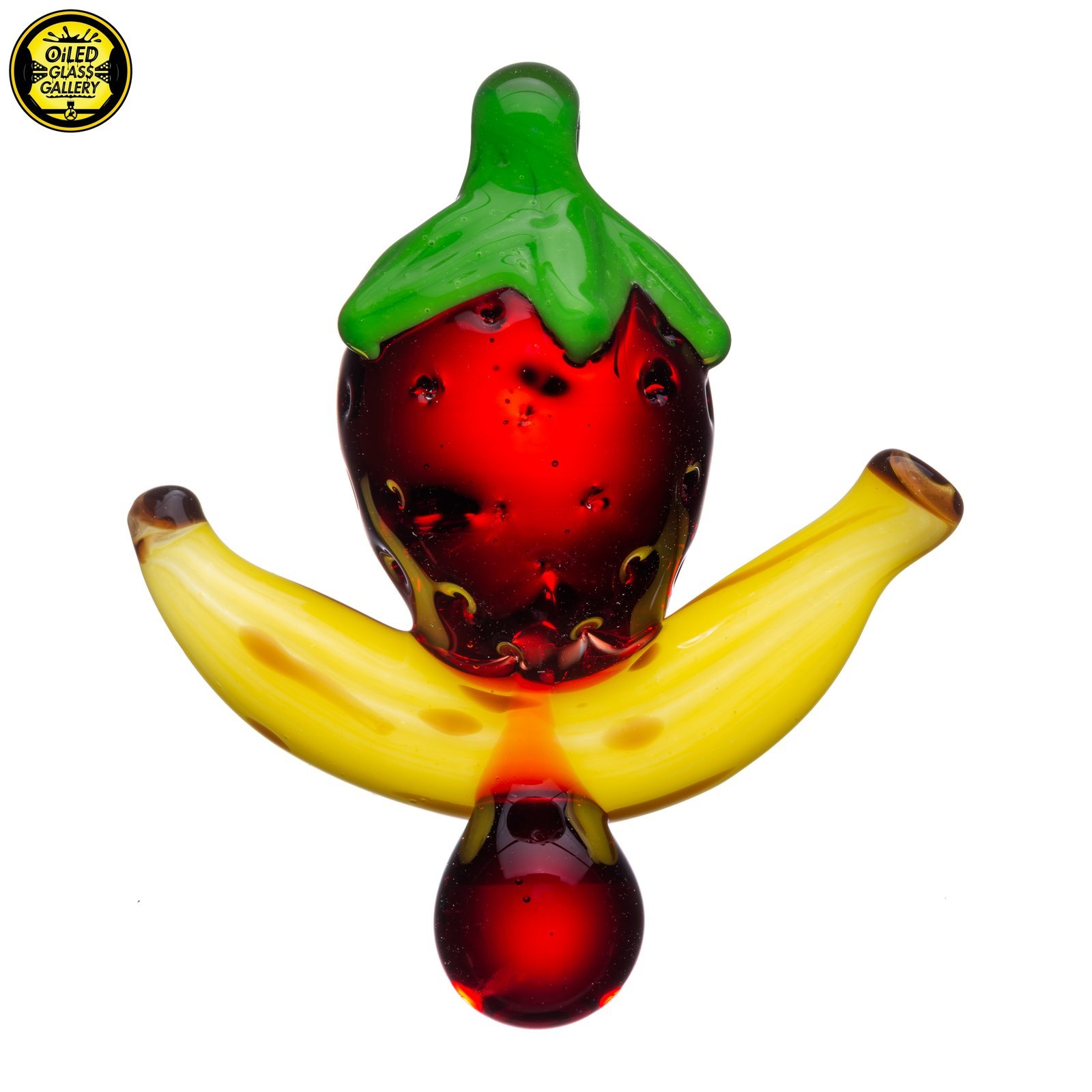 2021 2in x 2in Strawberry Banana Drip Pendant made of Northstar Glass Pomegranate, Momka’s Glass Lemon Yellow, Trautman Art Glass Honey Badger, Glass Alchemy Walnut & Glass Alchemy Shamrock.