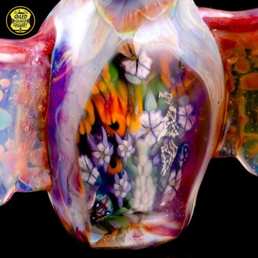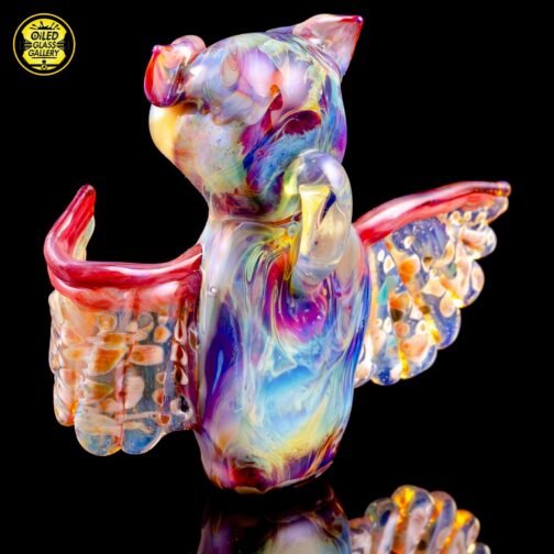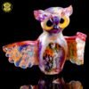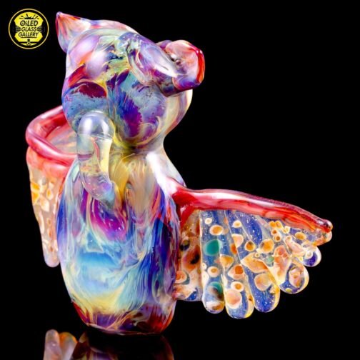 2019 2.5in x 3.25in Owl Forest Trip Pendant. The colors are Amber Purple for the body, mixed frit over clear for the wings and Northstar Glass Yellow over White for the eyes. This collab is a special piece made by Jason Michael, a glass artisan with over 20 years experience. Jason Michael works for The Arribas Brothers in Walt Disney World and has been helping bring Disney’s beautiful characters and imagery into the glass world.