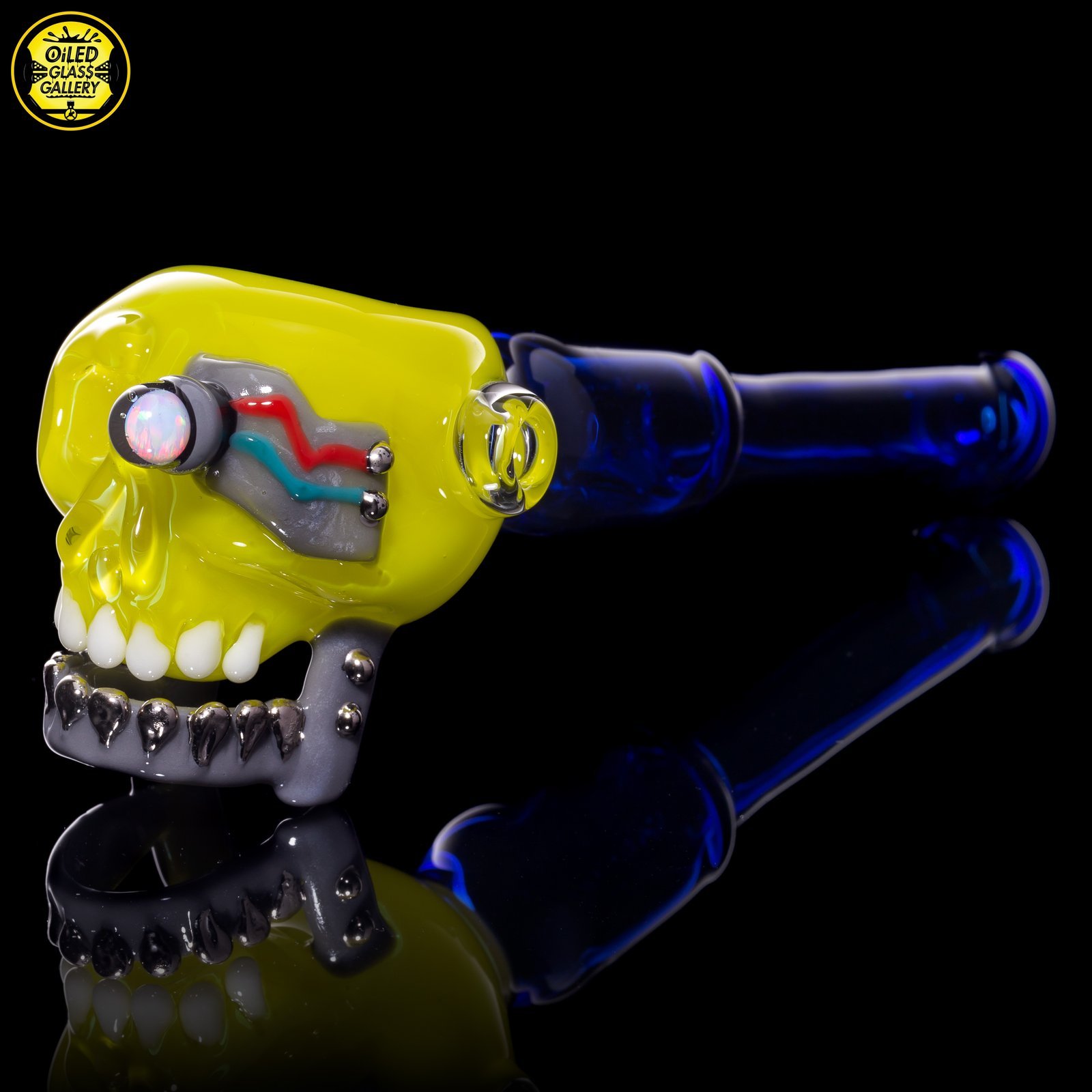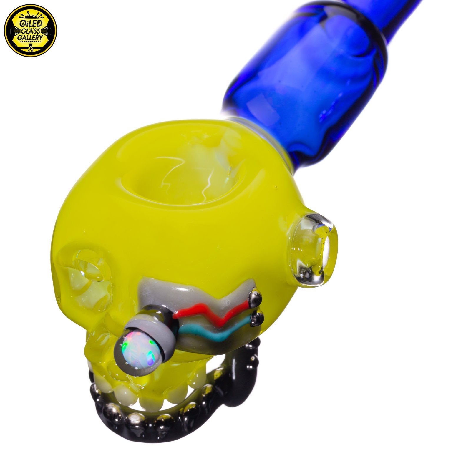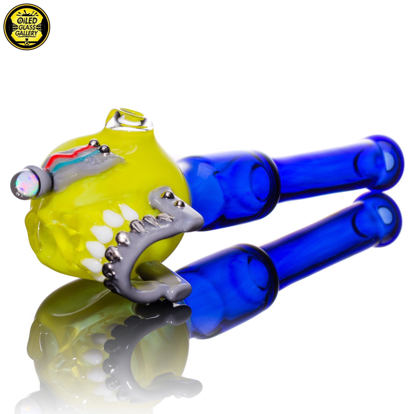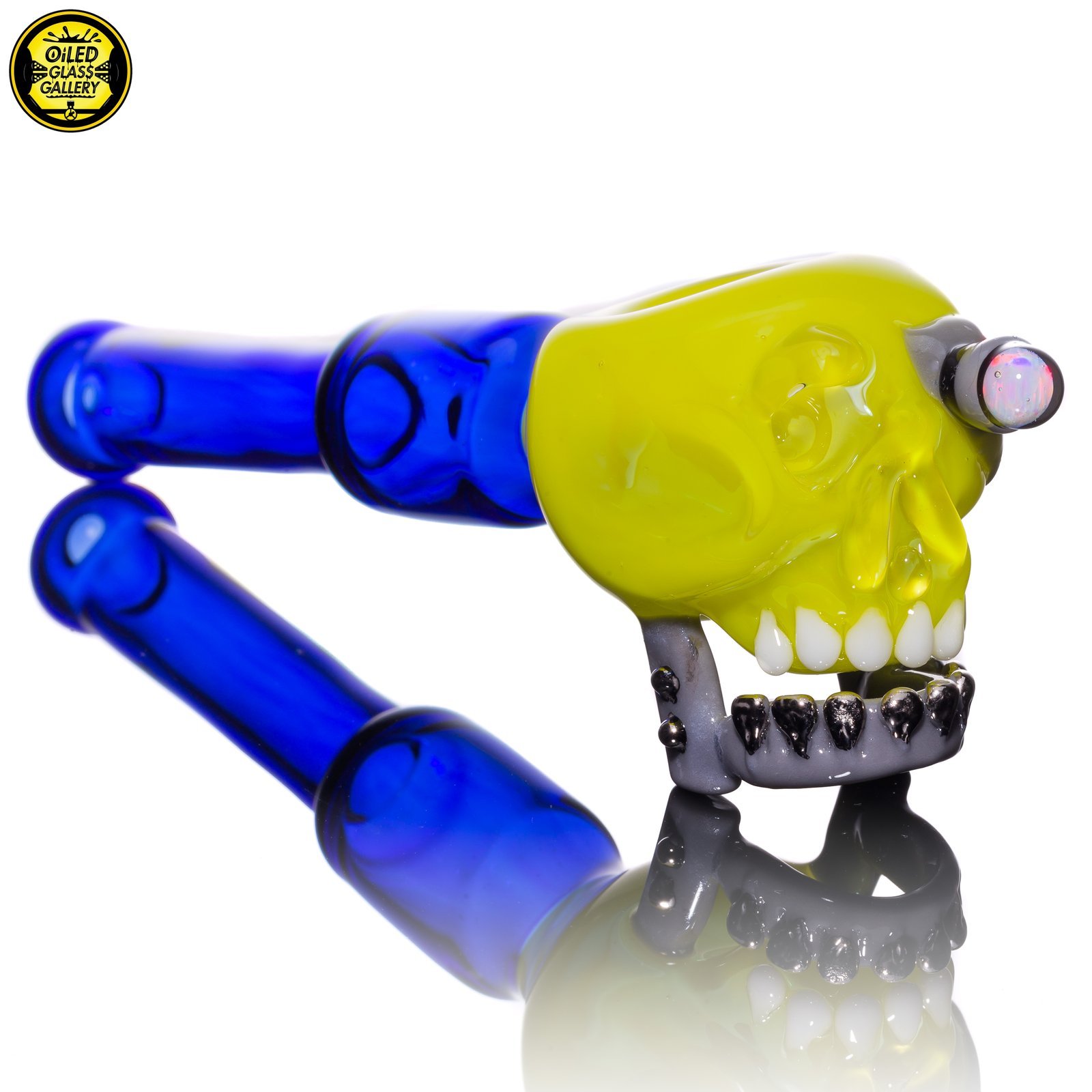 2021 5.75in Terpinator Skull Spoon pipe made of Northstar Glass Roswell featuring an encased opal coin eye and Silver teeth.