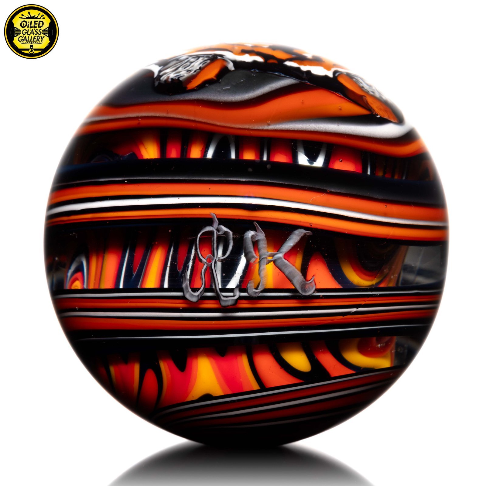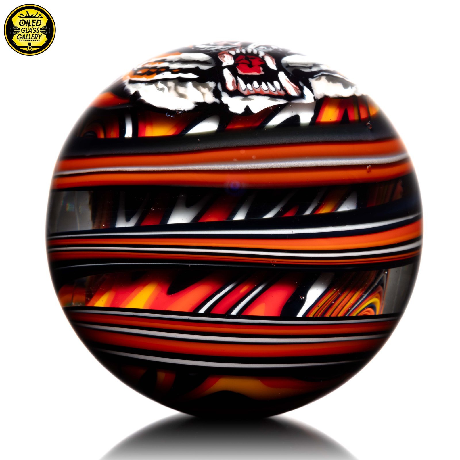 2023 60.5mm/2.4in Tiger Swirl Millefiori Marble featuring a massive Tiger millefiori over a double layer spiral sections.