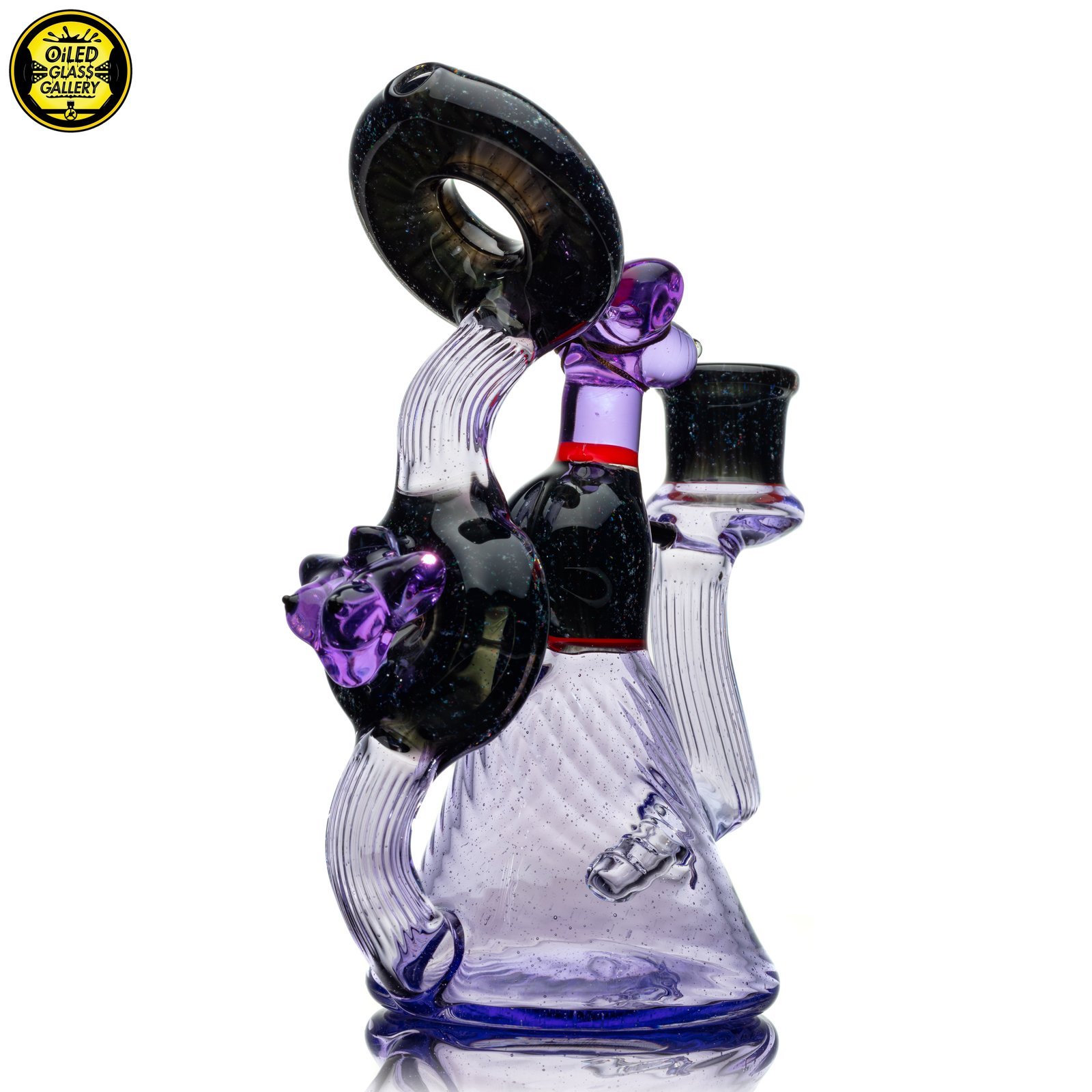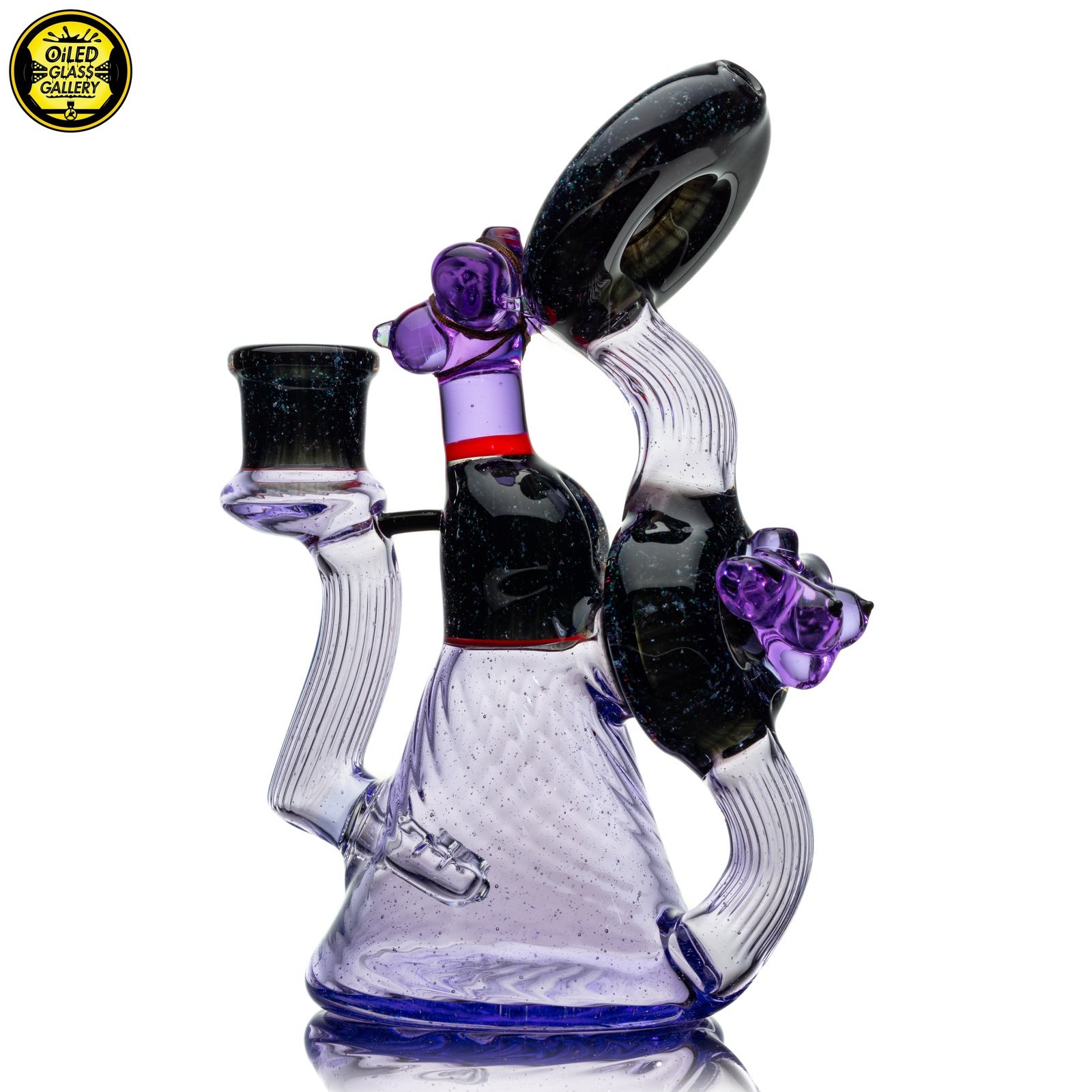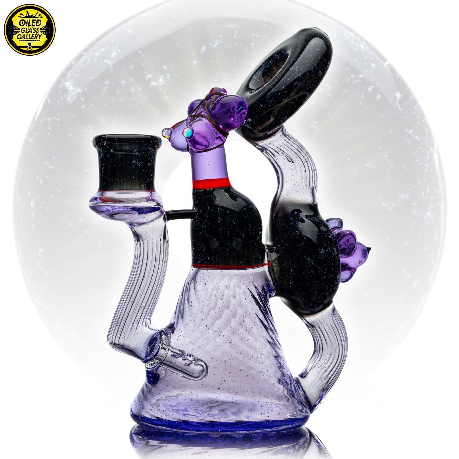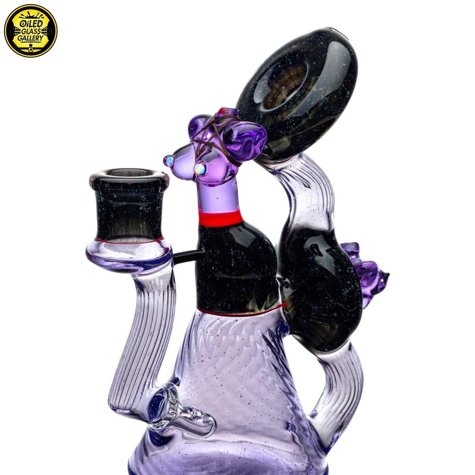 2021 14mm 6.25in Scalloped Torso Recycler made of Northstar Glass Purple Lollipop and crushed opal sections. Features a bondage tied encased opal nipple torso on the can and a black nipple torso mounted on the back. Comes shipped in a Pelican case.