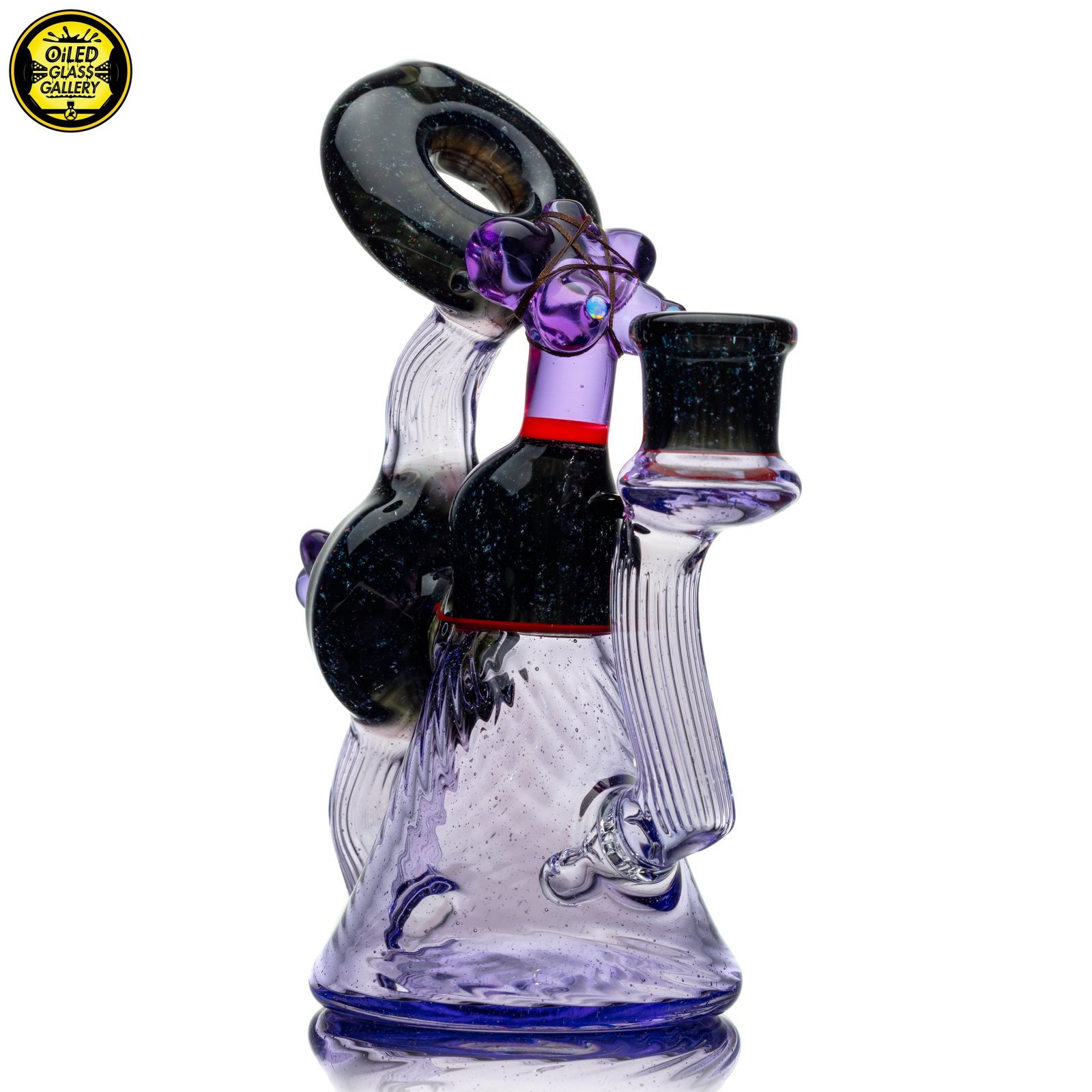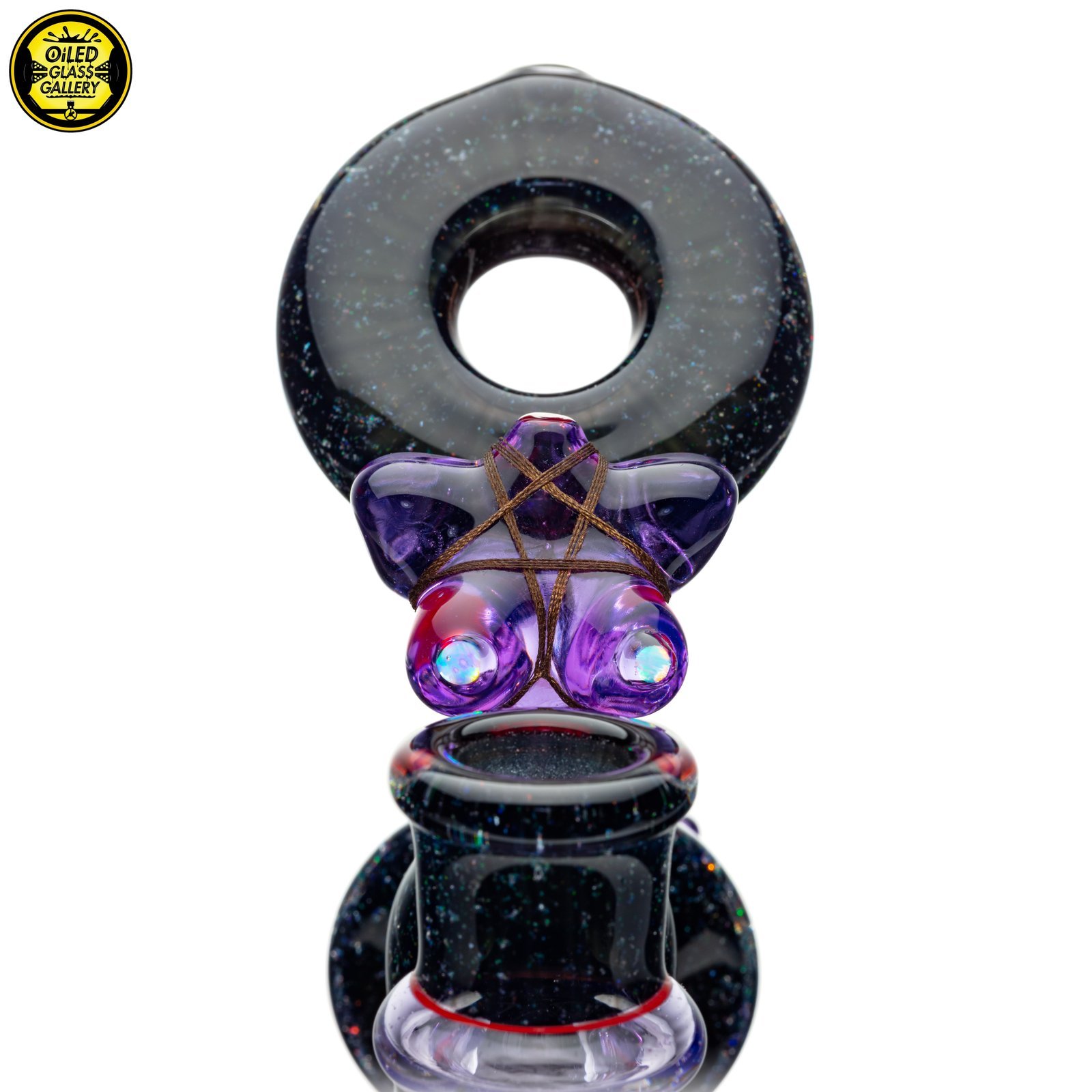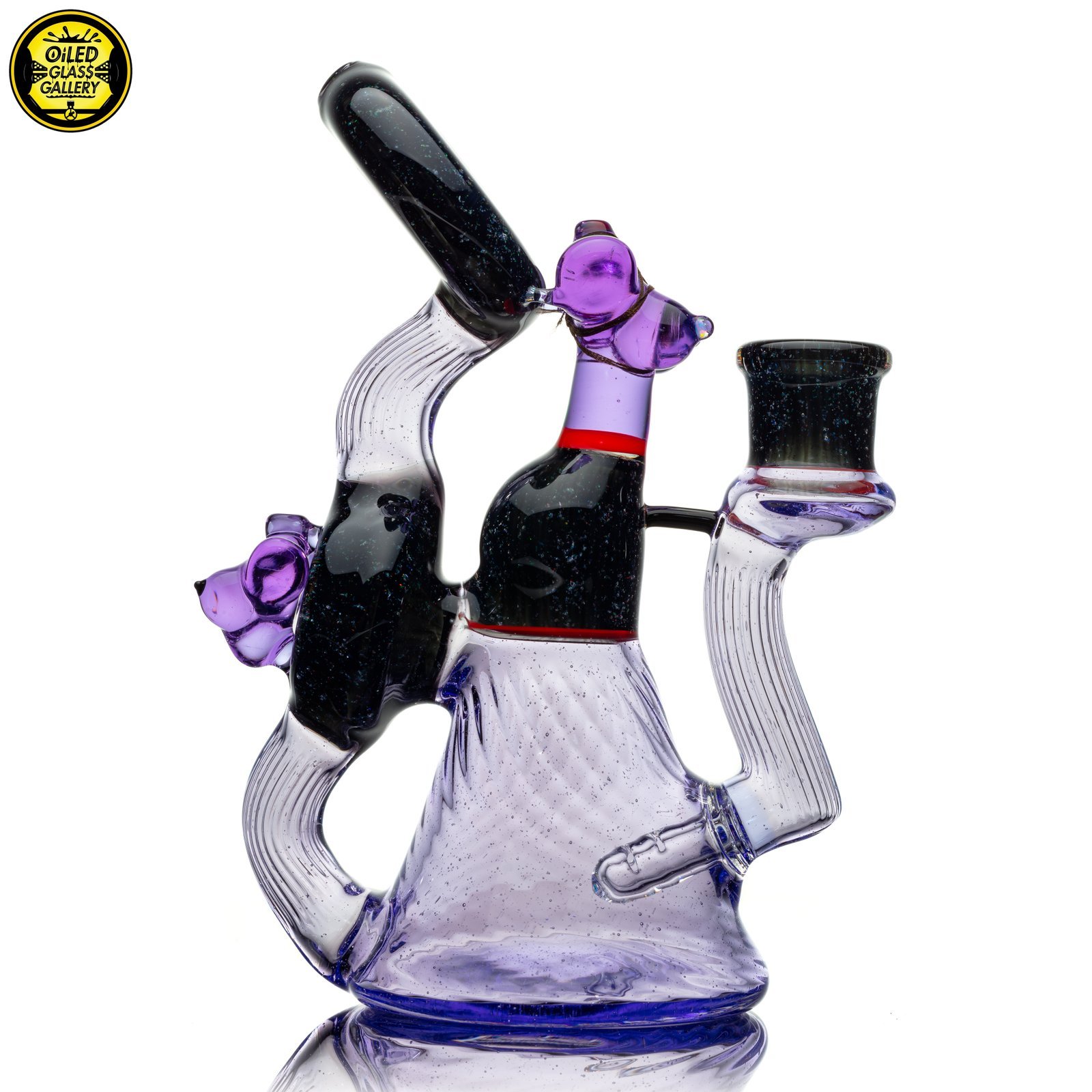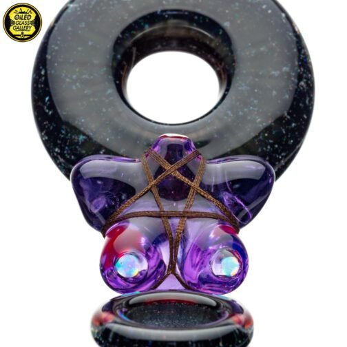 2021 14mm 6.25in Scalloped Torso Recycler made of Northstar Glass Purple Lollipop and crushed opal sections. Features a bondage tied encased opal nipple torso on the can and a black nipple torso mounted on the back. Comes shipped in a Pelican case.
