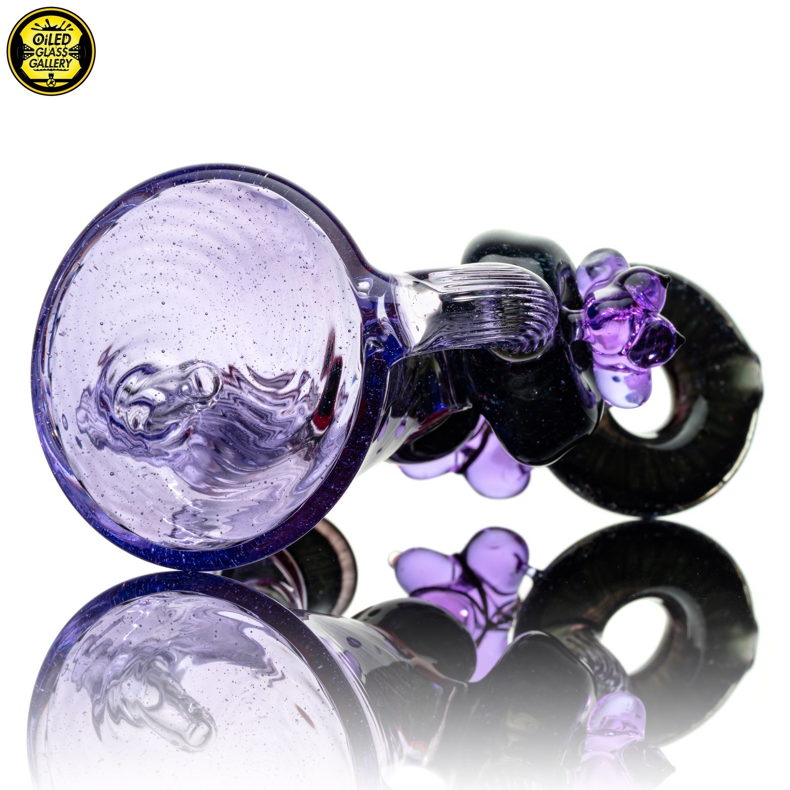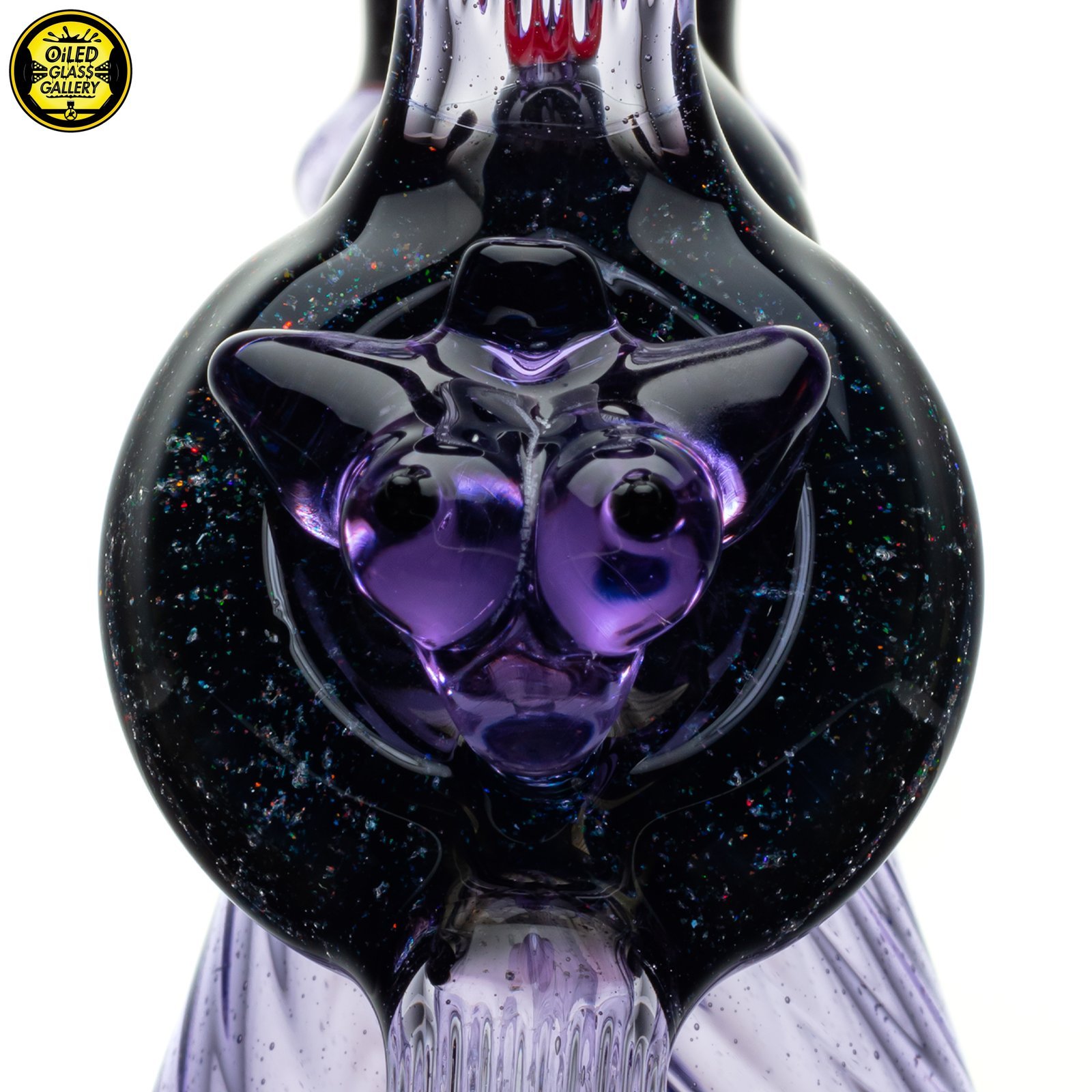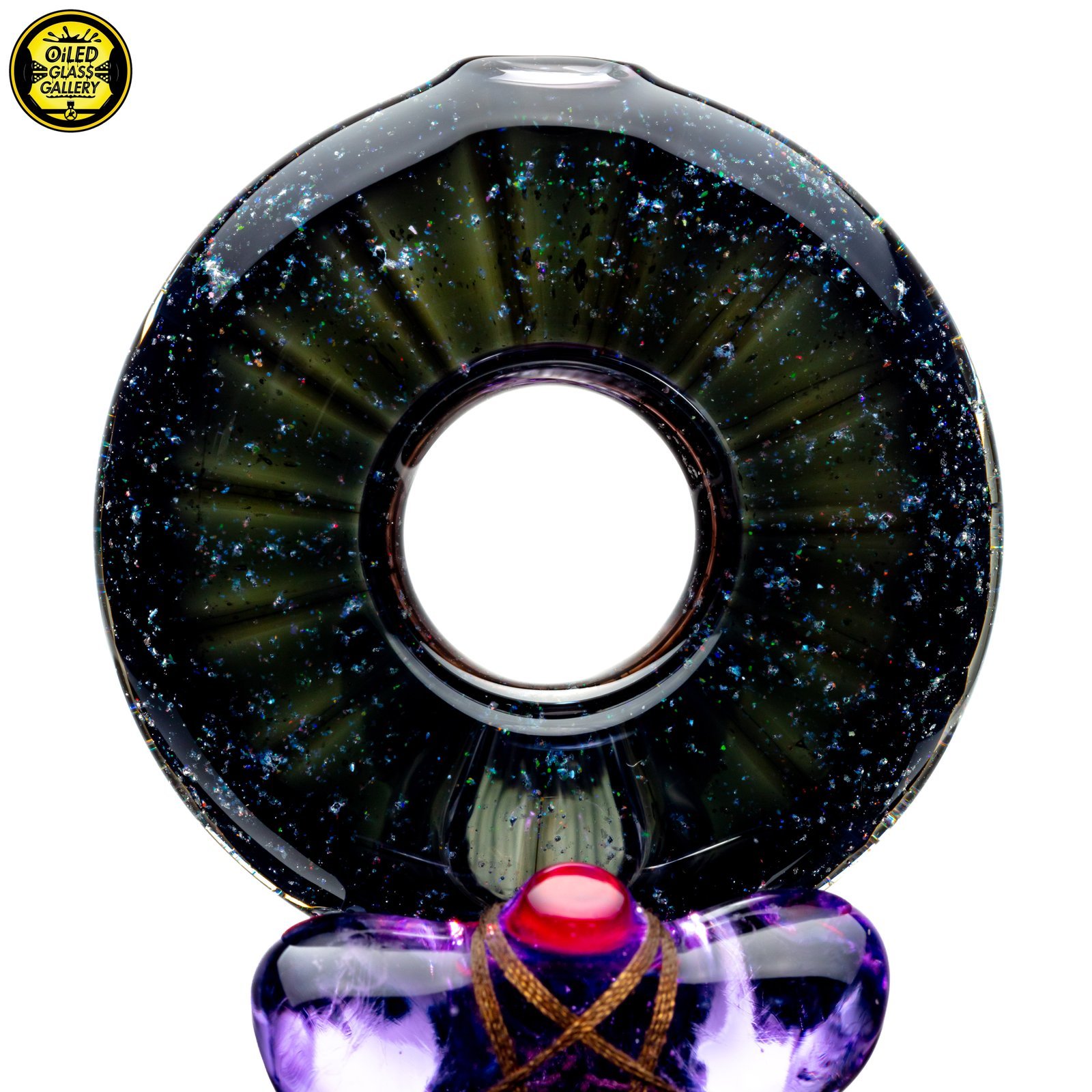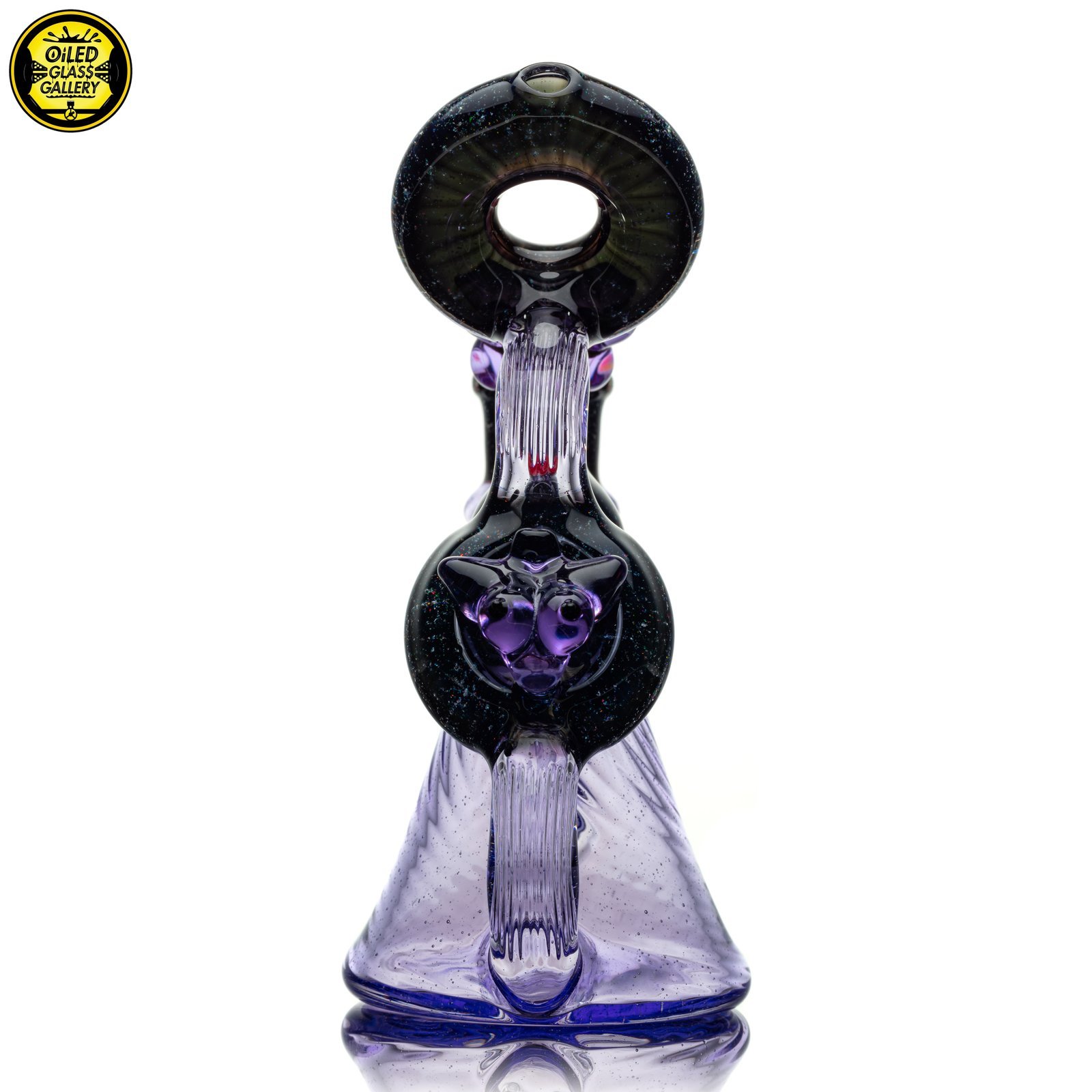 2021 14mm 6.25in Scalloped Torso Recycler made of Northstar Glass Purple Lollipop and crushed opal sections. Features a bondage tied encased opal nipple torso on the can and a black nipple torso mounted on the back. Comes shipped in a Pelican case.