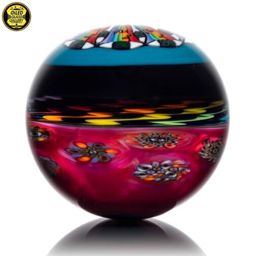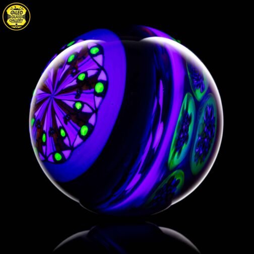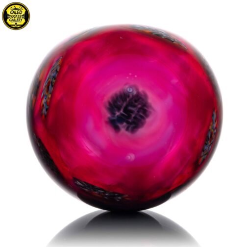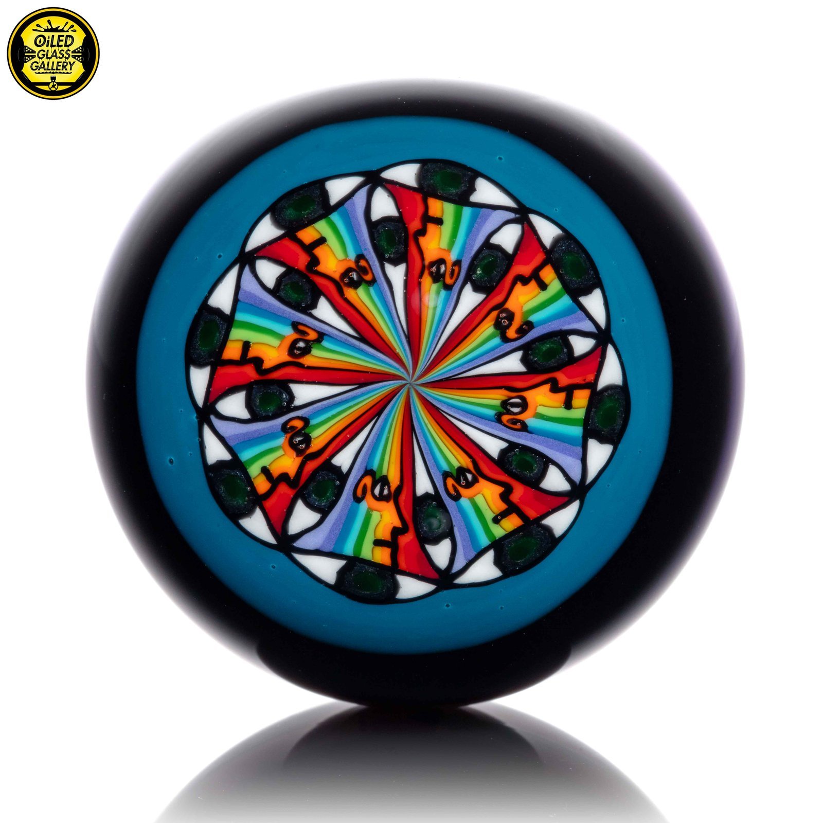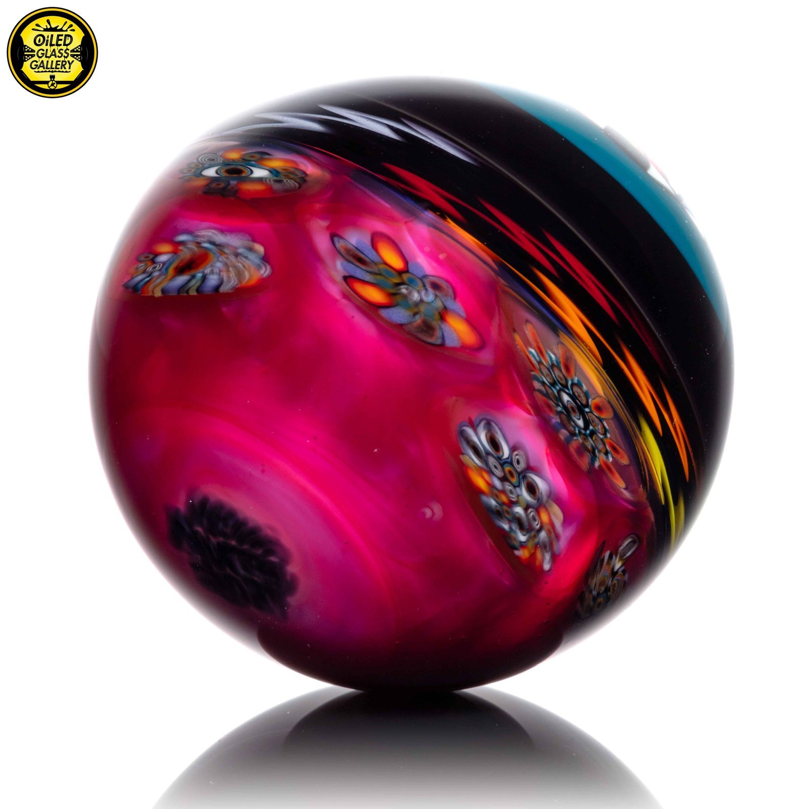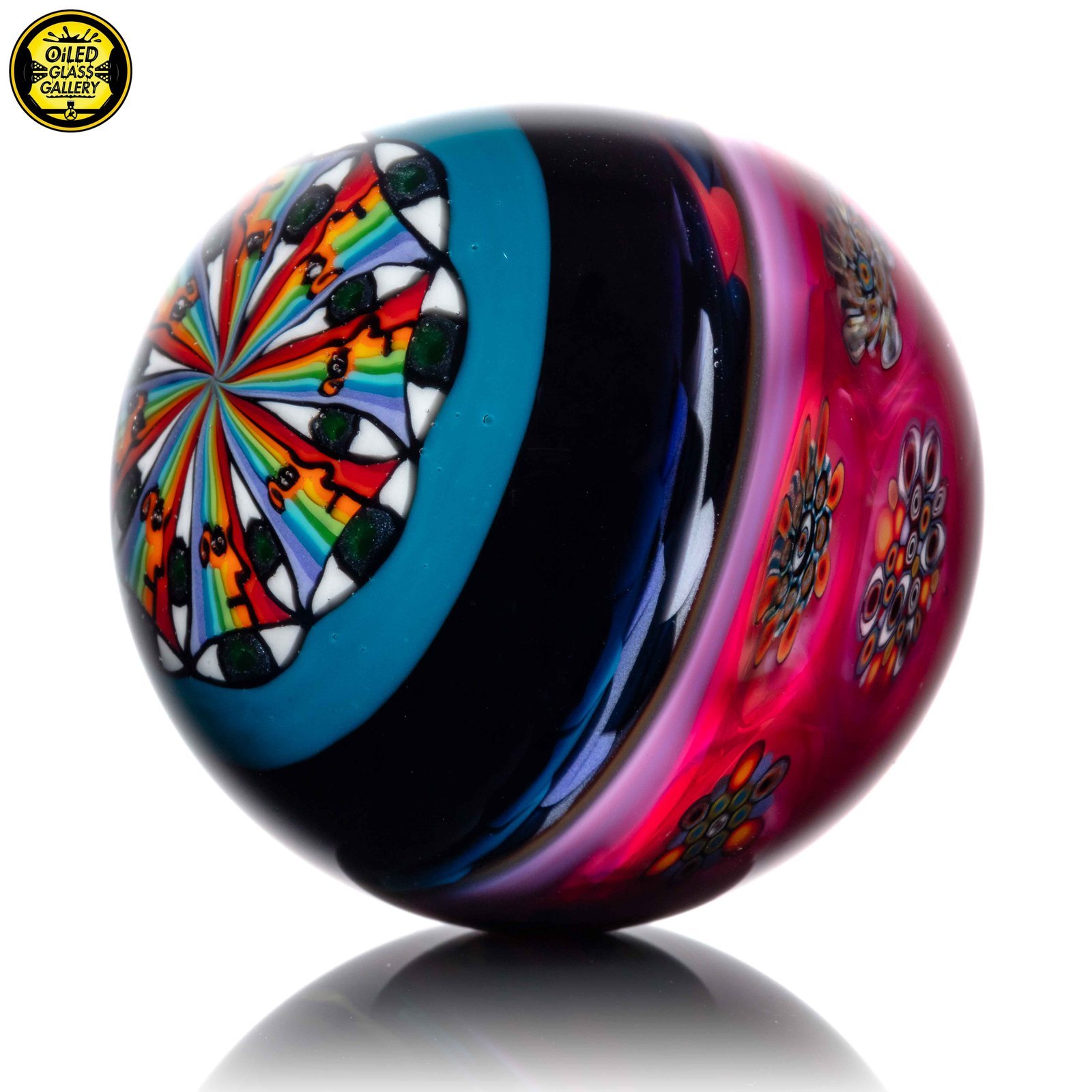 2024 49.5mm/1.95″ UV Face Melter Fillacello Marble with Wig Wags and murrine work made of all @moltenaura colors including Gold Ruby over Telemagenta featuring UV Citrine highlights. Also has a signature/year millefiori on the bottom.