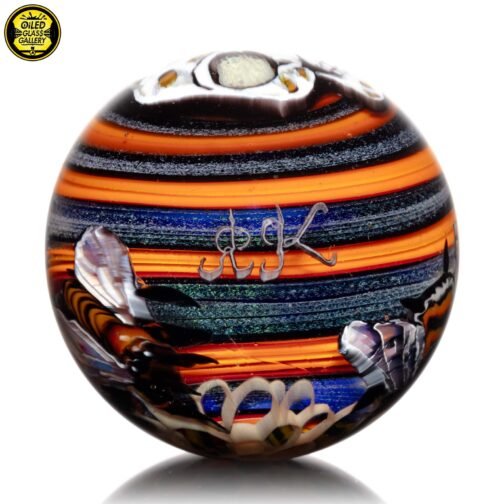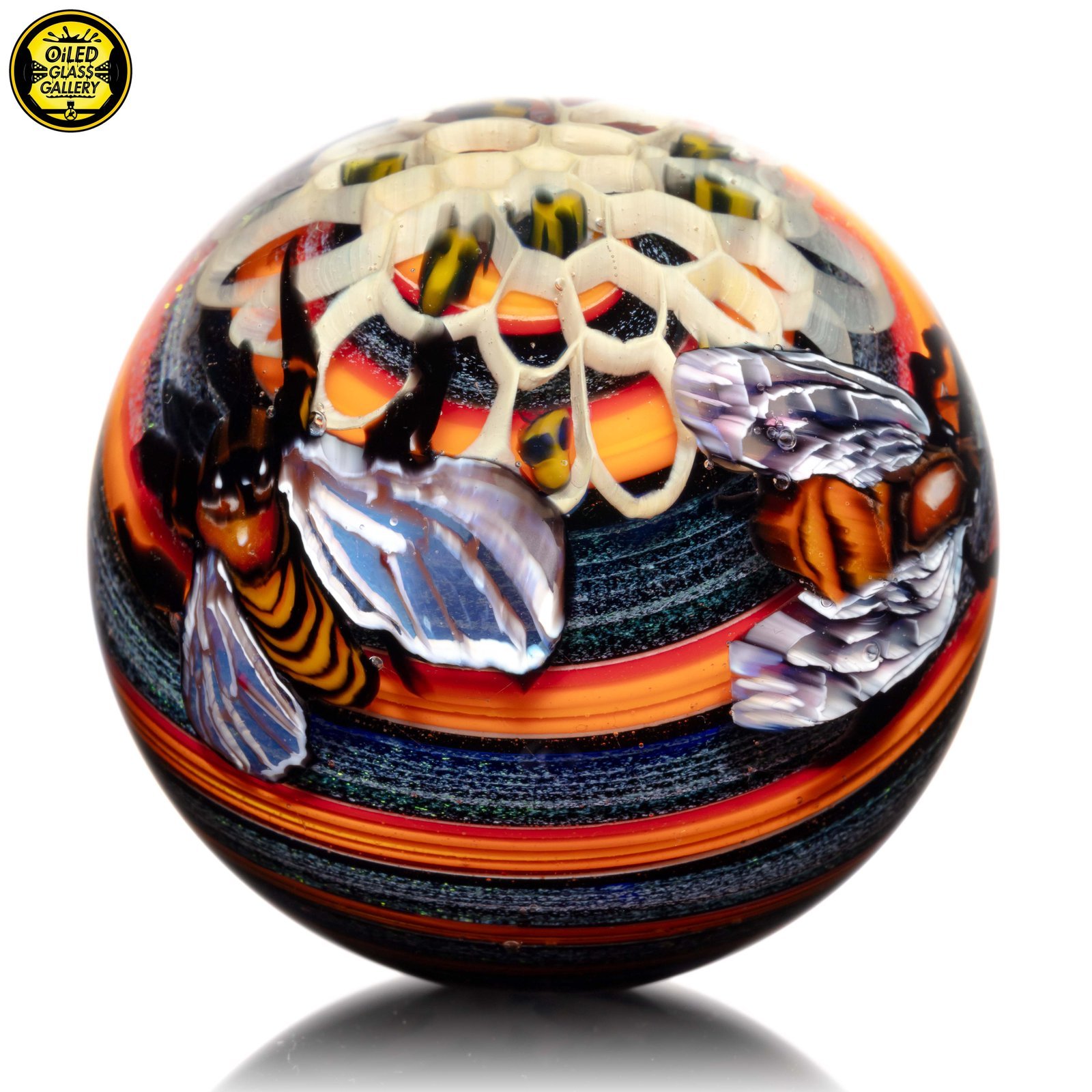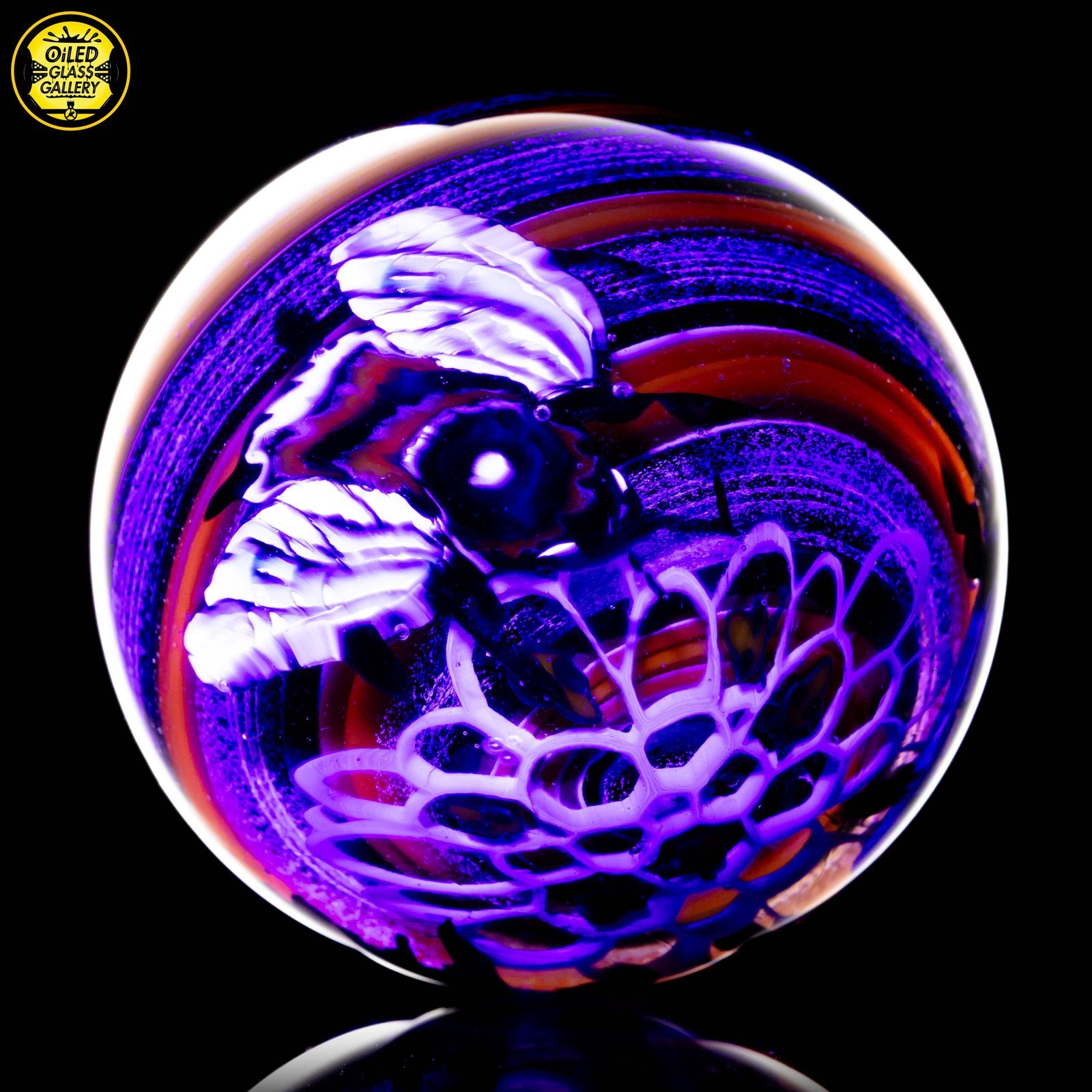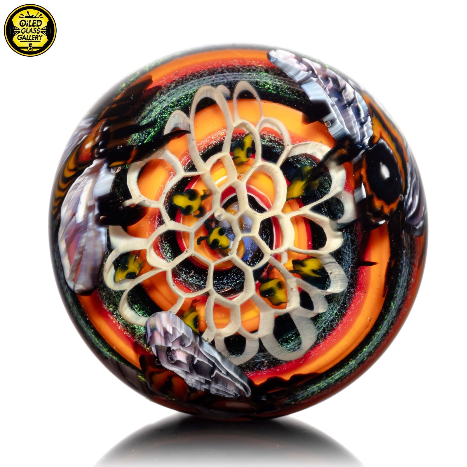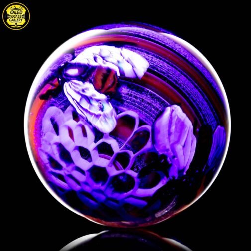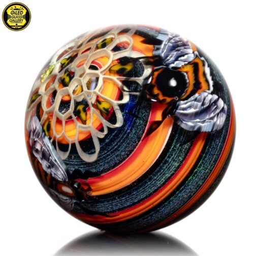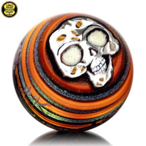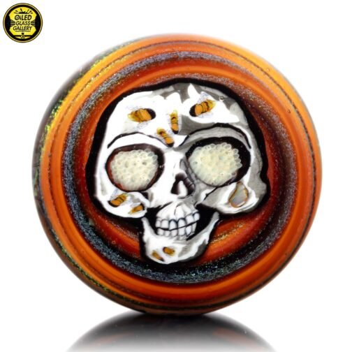 2023 47mm/1.85in UV Fire Honey Skull Murrine Marble with a Dichro swirl center featuring Boehme’s Skull and Bee millefiori with honeycomb eyes.