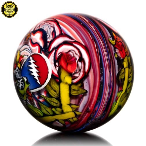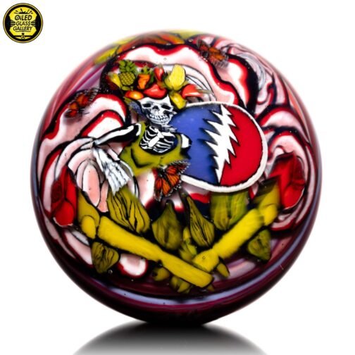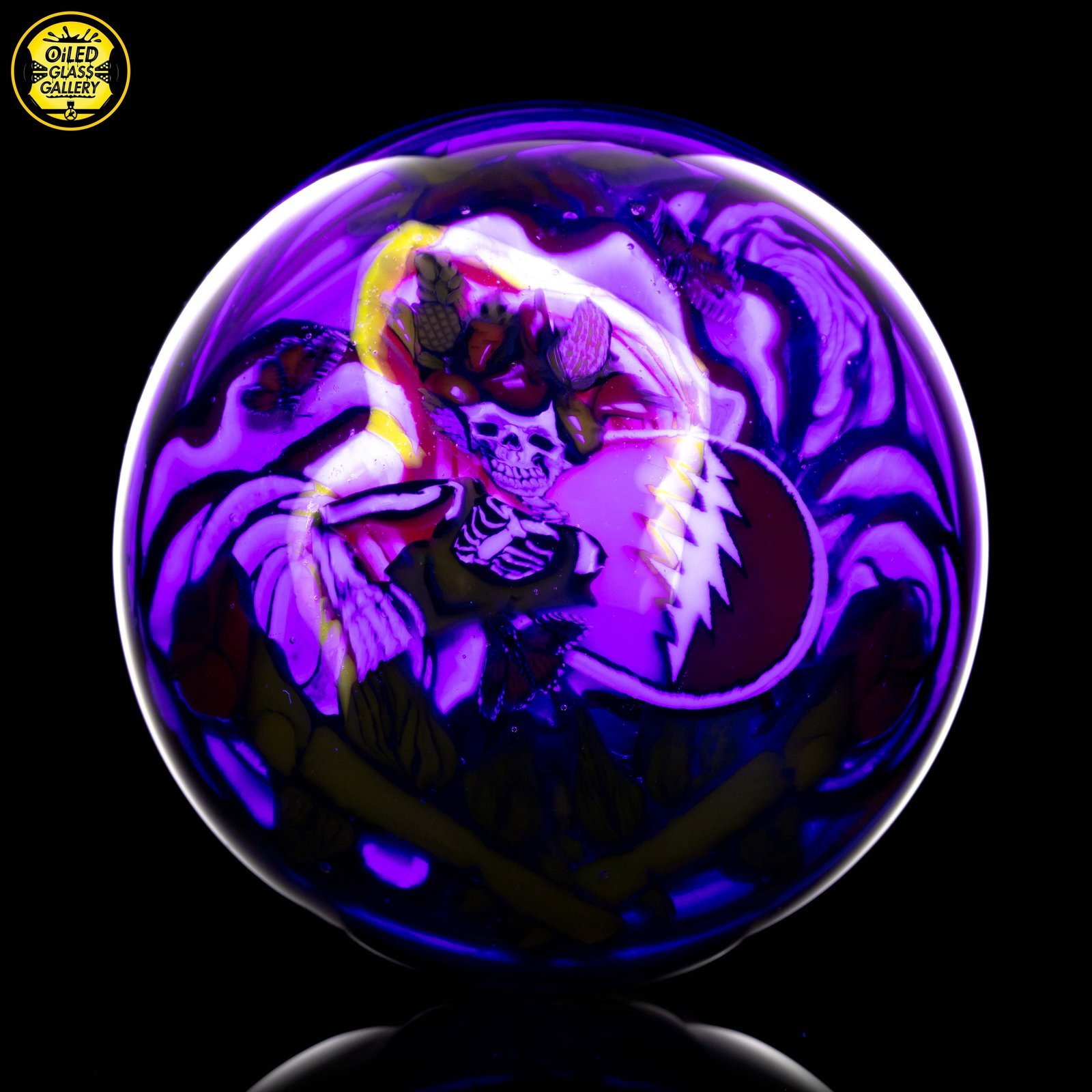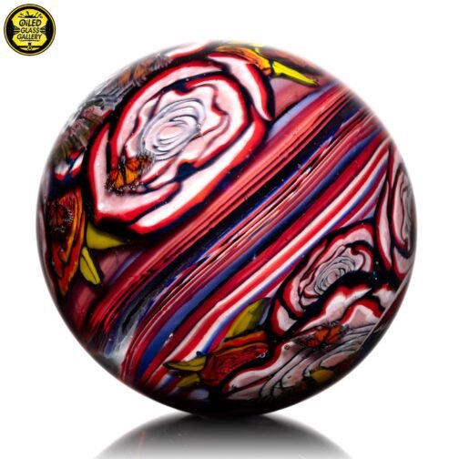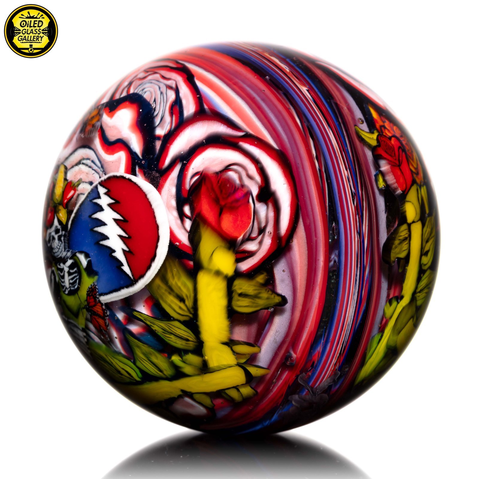 2023 68mm/2.7in UV Grateful Dead Double Bertha Rose Murrine Marble featuring a UV Bertha with Lightning Bolt murrine slab, another huge Bertha murrine slab, and Rose millefiori around the exterior.